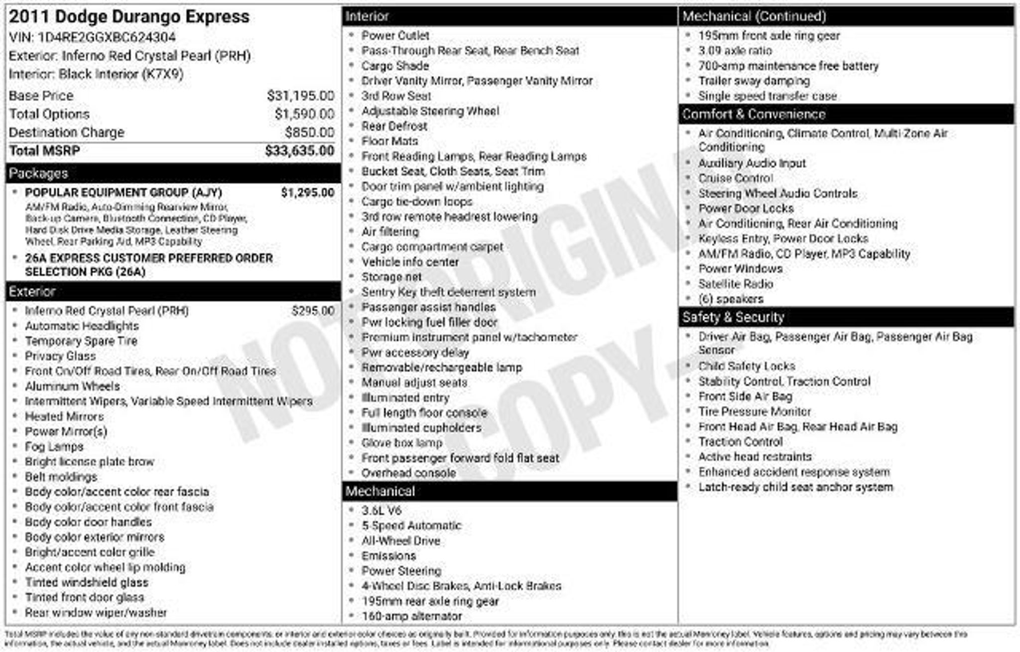 Details > 2011 Dodge Durango AWD Express 4DR SUV For Sale in Dyersville, IA Private Party Sellers Click here to place your ad now! You auta tell them you saw the ad in AutaBuy when you call or email. 1/22 2/22 3/22 4/22 5/22 6/22 7/22 8/22 9/22 10/22 11/22 12/22 13/22 14/22 15/22 16/22 17/22 18/22 19/22 20/22 21/22 22/22 View 22 Photos View All Add to My Garage Parked in Your Garage! Victory Ford, Inc. Contact Seller: I would like to: Make Offer Check Availability Ask A Question Request More Photos Check Financing Options Send a copy of this message to me Add this listing to my garage Send to Mobile Mileage 116,360 Exterior Color Inferno Red Crystal Pearlcoat Interior Color Black Doors 4 Engine 3.6L V6 Transmission 5 Speed Auto Stock # DR469A VIN 1D4RE2GGXBC624304 Estimated Monthly Payment $200 mo Apply Now J.J. Best Banc & Co. 2011 Dodge Durango AWD Express 4DR SUV Description: **LOCAL TRADE** **CLEAN AUTO HISTORY REPORT** **EXPRESS EQUIPMENT GROUP** **AWD** **3.6L V6** **REARVIEW CAMERA** **18 ALLOY WHEELS** · Mileage: 116,360 · Color: Inferno Red Crystal Pearlcoat Price: $11,995. Price: $11,495. Mileage 116,360 Exterior Color Inferno Red Crystal Pearlcoat Interior Color Black Doors 4 Engine 3.6L V6 Transmission 5 Speed Auto Stock # DR469A VIN 1D4RE2GGXBC624304 Estimated Monthly Payment $200 mo Apply Now J.J. Best Banc & Co. Add to My Garage Parked in Your Garage! Message Seller Victory Ford, Inc. Contact Seller: I would like to: Make Offer Check Availability Ask A Question Request More Photos Check Financing Options Send a copy of this message to me Add this listing to my garage Offered for sale by Victory Ford, Inc. DYERSVILLE, IA Price: $11,995. Price: $11,495. Offered for sale by Victory Ford, Inc. DYERSVILLE, IA [entire inventory] Ask Auta Intelligence The first collector-car AI built directly into a classic car marketplace What makes this model year special? What movies featured cars like this? What colors did these come in? What trim levels were available for this model? How many passengers can this seat comfortably? How far is this from me? What does this VIN number tell me? Where is this located? What transmission options did these offer? How many of these were produced? Can you show me more suvs for a similar price? What safety features does this model offer? Tell me about this model What nicknames does this model have? What engine options did these come with? When was this model first introduced? What factory options were available on this model? Which engines were most common for this year? How many Durangos were produced in Red? Which years was this body style produced? What makes this model desirable to enthusiasts? Do you have a similar car to sell? List It Now! Questions about this car? Ask Auta Intelligence for production numbers, available options, etc. · Subscribe to AutaBuy! · Send a Gift Subscription Notice to a Friend
