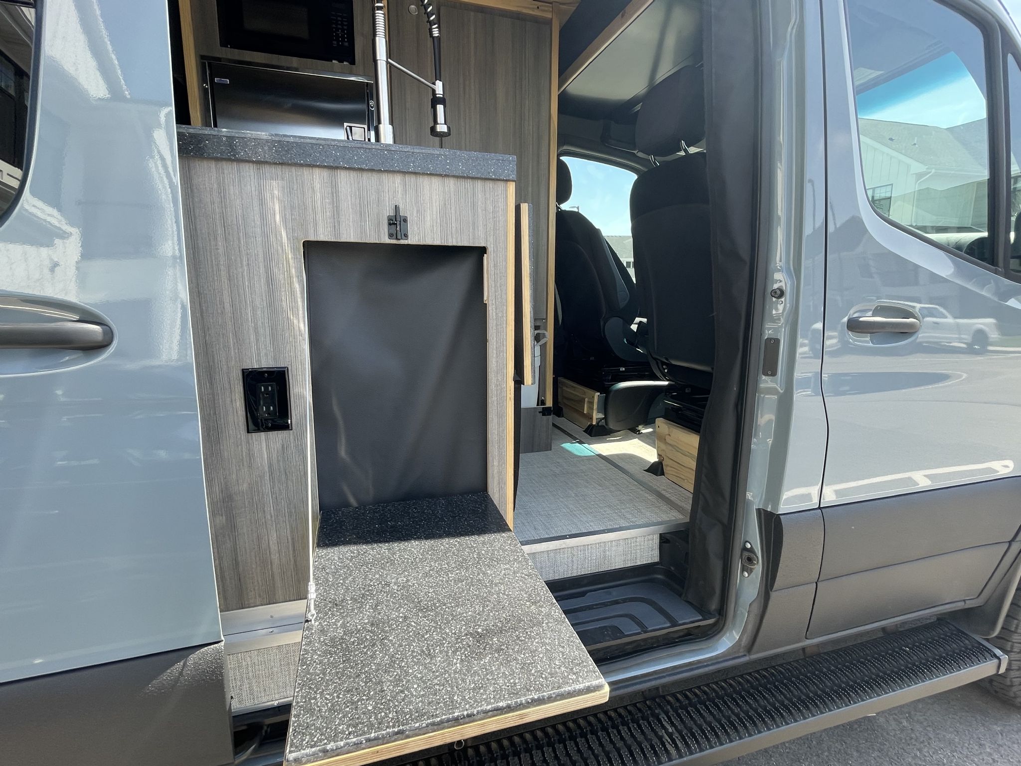 This van is a Complete Custom Build with very unique features not seen on vans of this type, built by Colorado Camper Van! Features like: Transferrable 100,000 mile warranty from Mercedes includes free towing if they can get you to the dealership, leather wrapped steering wheel, fabric front power seats,
