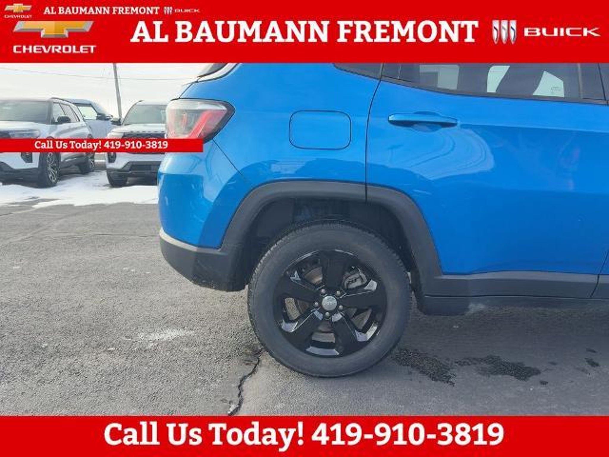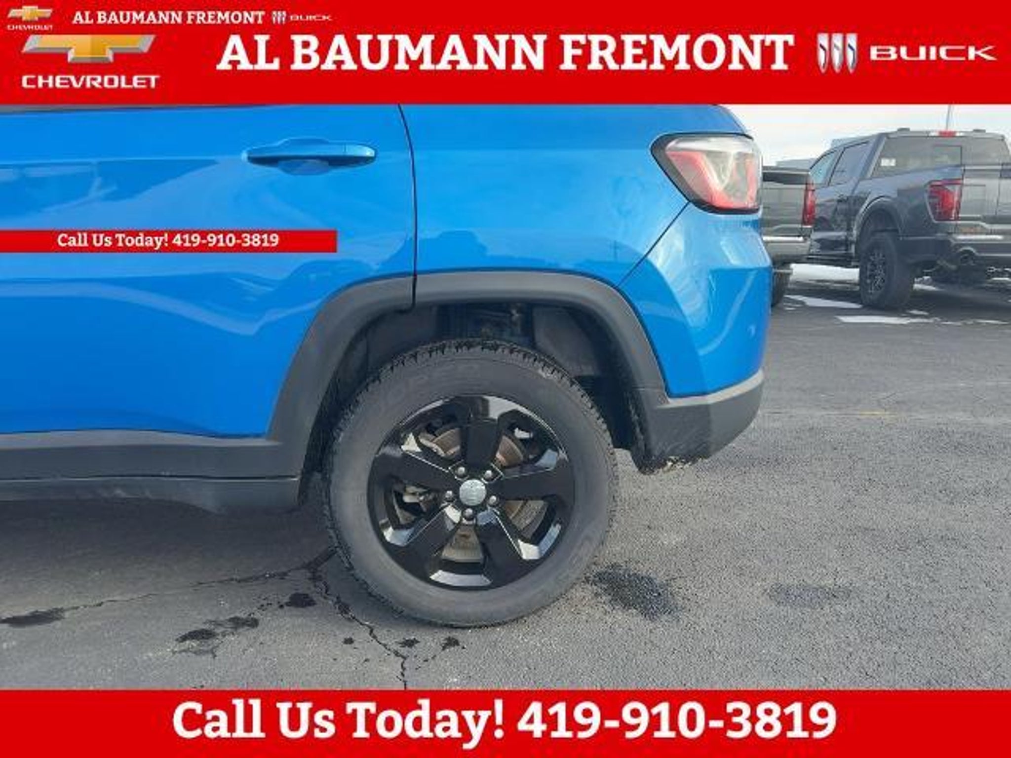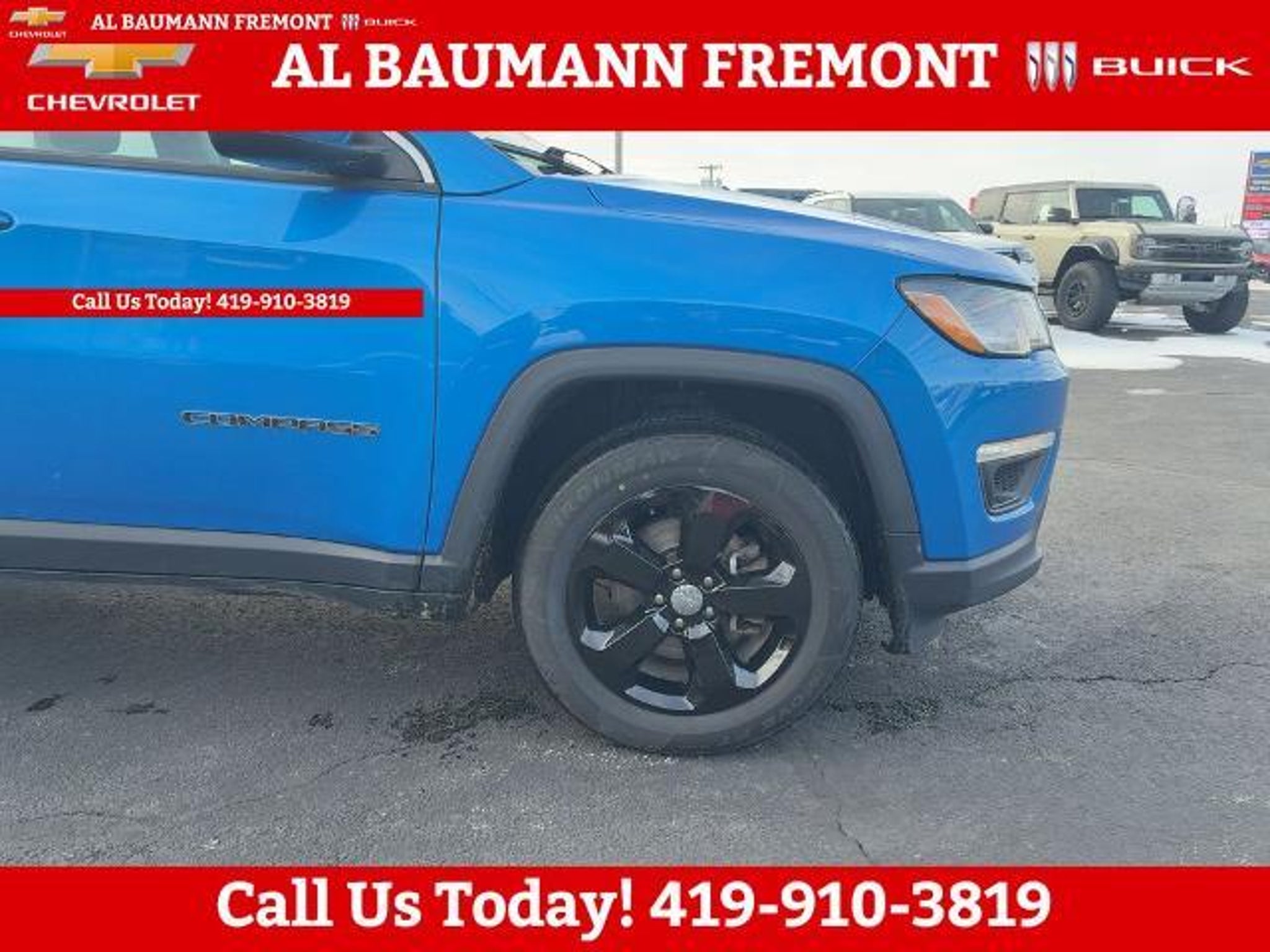 Clean CARFAX. Laser Blue Pearlcoat 2019 Jeep Compass Latitude 4WD 4D Sport Utility 2.4L I4 9-Speed Automatic 4WD ONLY TWO OWNERS. Car shopping is sometimes inconvenient and stressful, and we want to take the hassle out of this all-too-common experience. If you?re interested in more convenience, less frustration and a process that works efficiently to meet your needs as a customer. Al BAUMANN AUTO GROUP. The Best Price Up Front Cash Offers For Any Trade-In Multiple Financing Quotes In Minutes A Team Of Dedicated Salespeople. CALL.{419-332-8291}{1-877-394-1162}, 4WD, Quick Order Package 2GJ, 4-Wheel Disc Brakes, 6 Speakers, ABS brakes, Air Conditioning, Alloy wheels, AM/FM radio: SiriusXM, Anti-whiplash front head restraints, Automatic temperature control, Brake assist, Bumpers: body-color, Compass, Delay-off headlights, Driver door bin, Driver vanity mirror, Dual front impact airbags, Dual front side impact airbags, Electronic Stability Control, Four wheel independent suspension, Front anti-roll bar, Front Bucket Seats, Front Center Armrest w/Storage, Front dual zone A/C, Front fog lights, Front reading lights, Fully automatic headlights, Heated door mirrors, Illuminated entry, Knee airbag, Low tire pressure warning, Occupant sensing airbag, Outside temperature display, Overhead airbag, Overhead console, Panic alarm, ParkView Rear Back-Up Camera, Passenger door bin, Passenger vanity mirror, Power door mirrors, Power steering, Power windows, Premium Cloth/Vinyl Bucket Seats, Radio: Uconnect 4 w/7 Display, Rear anti-roll bar, Rear seat center armrest, Rear window defroster, Rear window wiper, Remote keyless entry, Roof rack: rails only, Speed control, Split folding rear seat, Spoiler, Steering wheel mounted audio controls, Tachometer, Telescoping steering wheel, Tilt steering wheel, Traction control, Trip computer, Variably intermittent wipers, Wheels: 17 x 7.0 Silver Painted Aluminum, 4WD, Quick Order Package 2GJ.