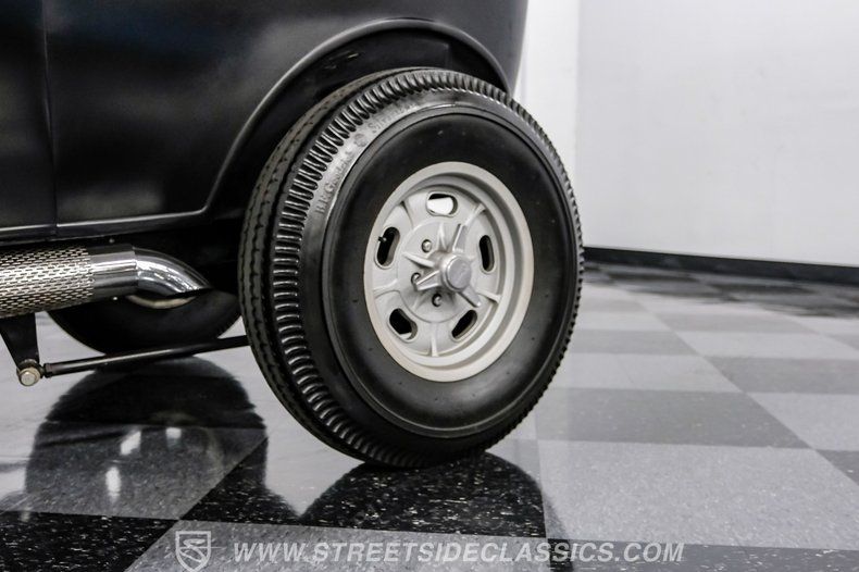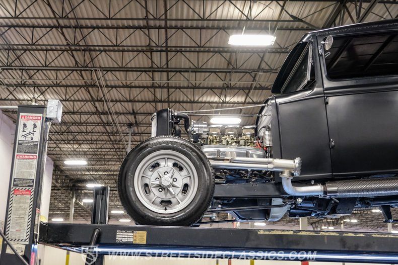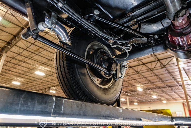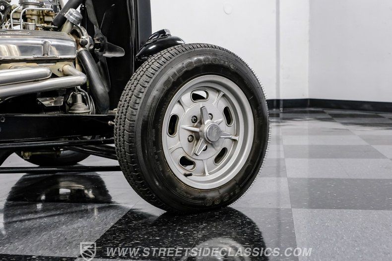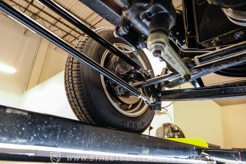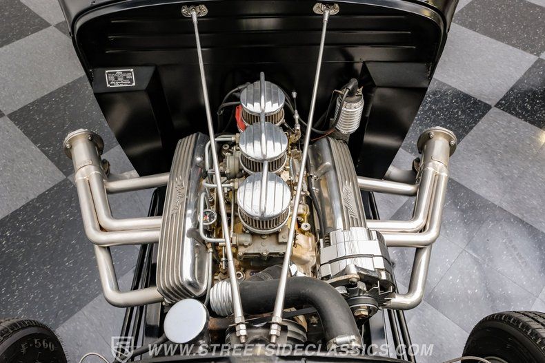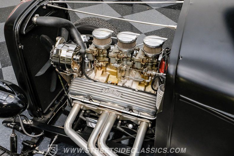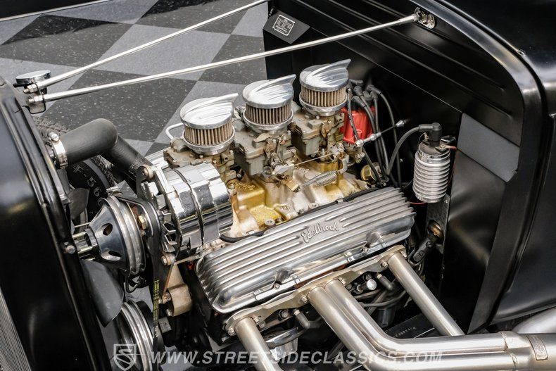 Under the hood, this Model A packs a 283 V8 engine topped with an Edelbrock intake and triple dual-barrel Rochester carburetors, promising robust power and a distinctive sound. The 4-speed manual transmission puts you in complete control, and the exhaust cutouts let you choose between a throaty roar or a more subdued cruise. The drop tube front end with front disc brakes, four-link rear with adjustable coilovers, and Ford 8-inch rear axle create a stable and responsive ride. Extended side pipes and finned Edelbrock valve covers add to the performance-inspired details.