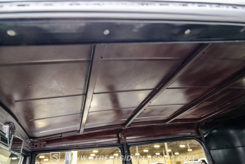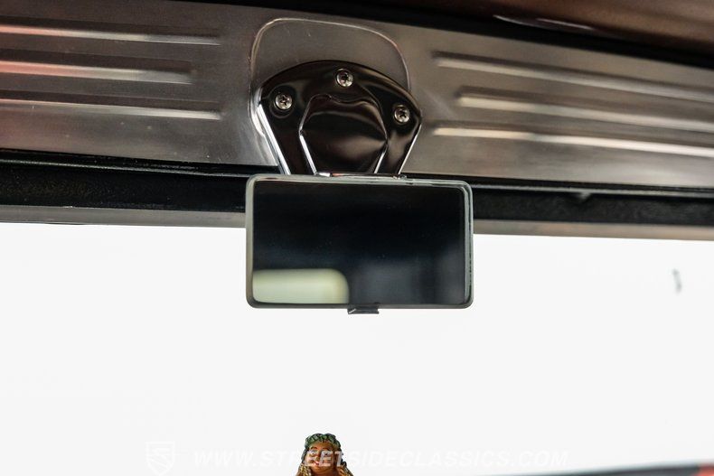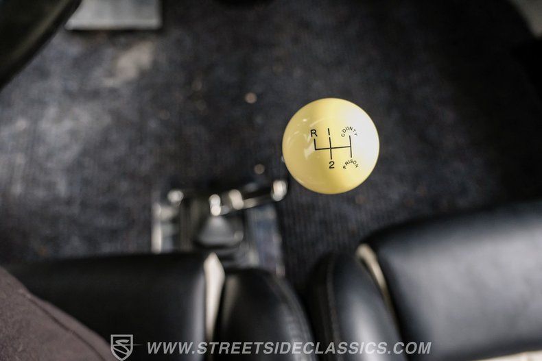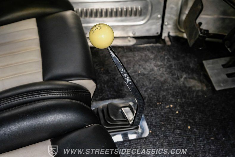 Step inside and you'll find the interior designed for both style and function. Black vinyl bucket seats with striking white inserts give a bold, classic look, while stainless steel side panels add a custom touch. A billet steering wheel mounted on a tilt column, Stewart Warner gauges, and a Hurst floor shifter bring performance and comfort together. With no back seat, the space behind the buckets is dedicated to the gas tank and rear-mounted battery, keeping the cabin focused and uncluttered.