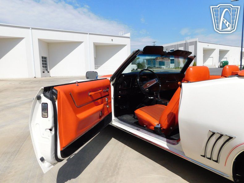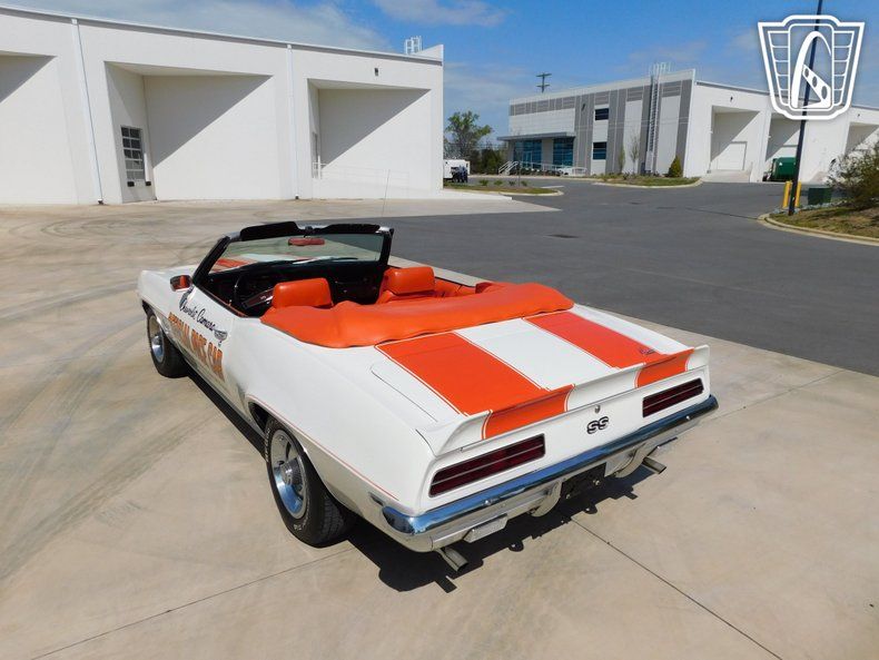 Step into the world of classic American muscle with this 1969 Chevrolet Camaro SS Indy Pace Car Convertible. This iconic vehicle is a true testament to the golden era of automotive design, boasting a stunning white exterior that totally complements its vibrant orange cloth interior.