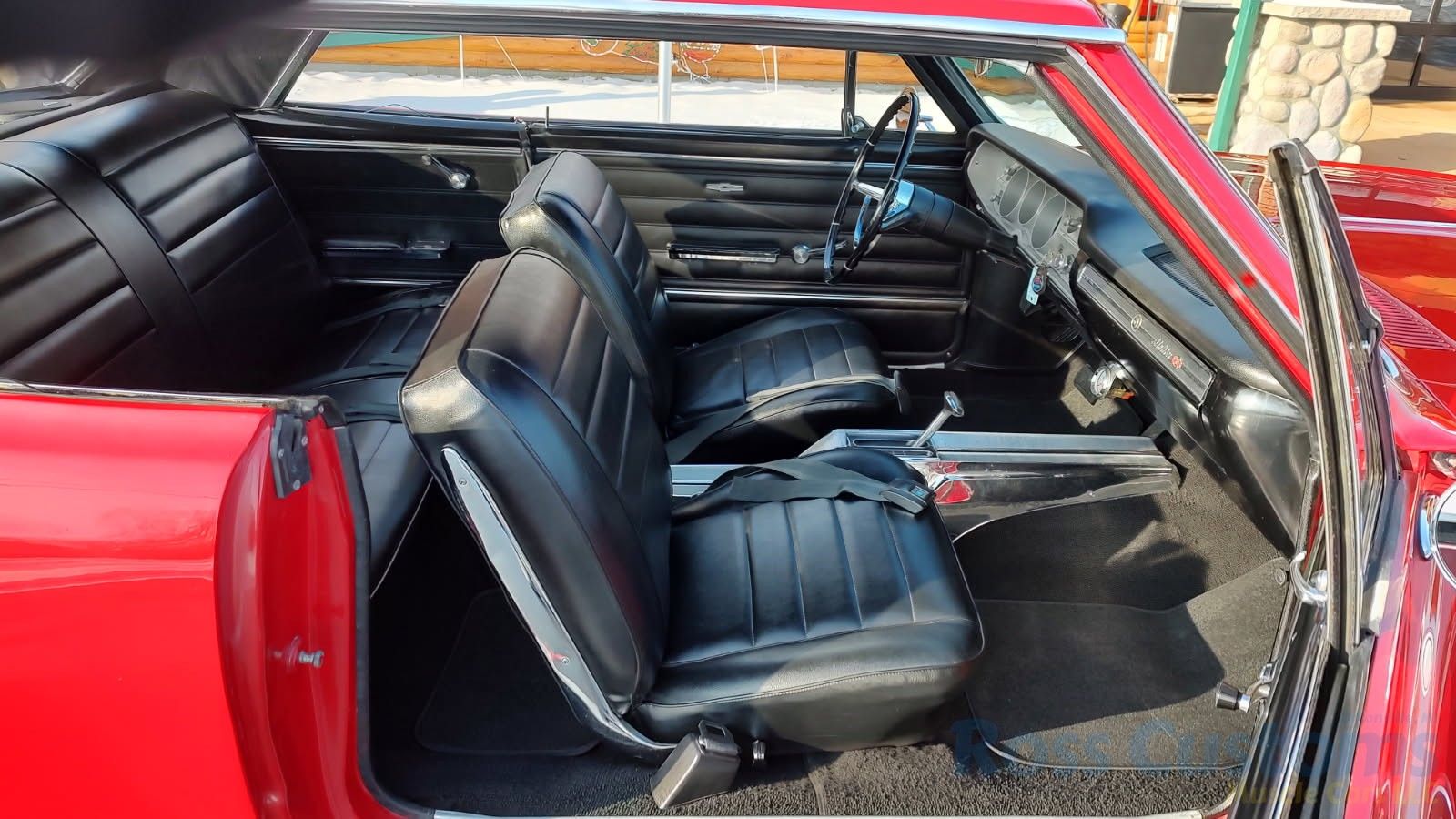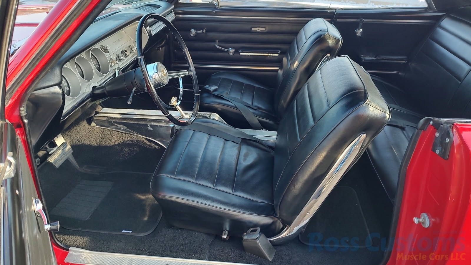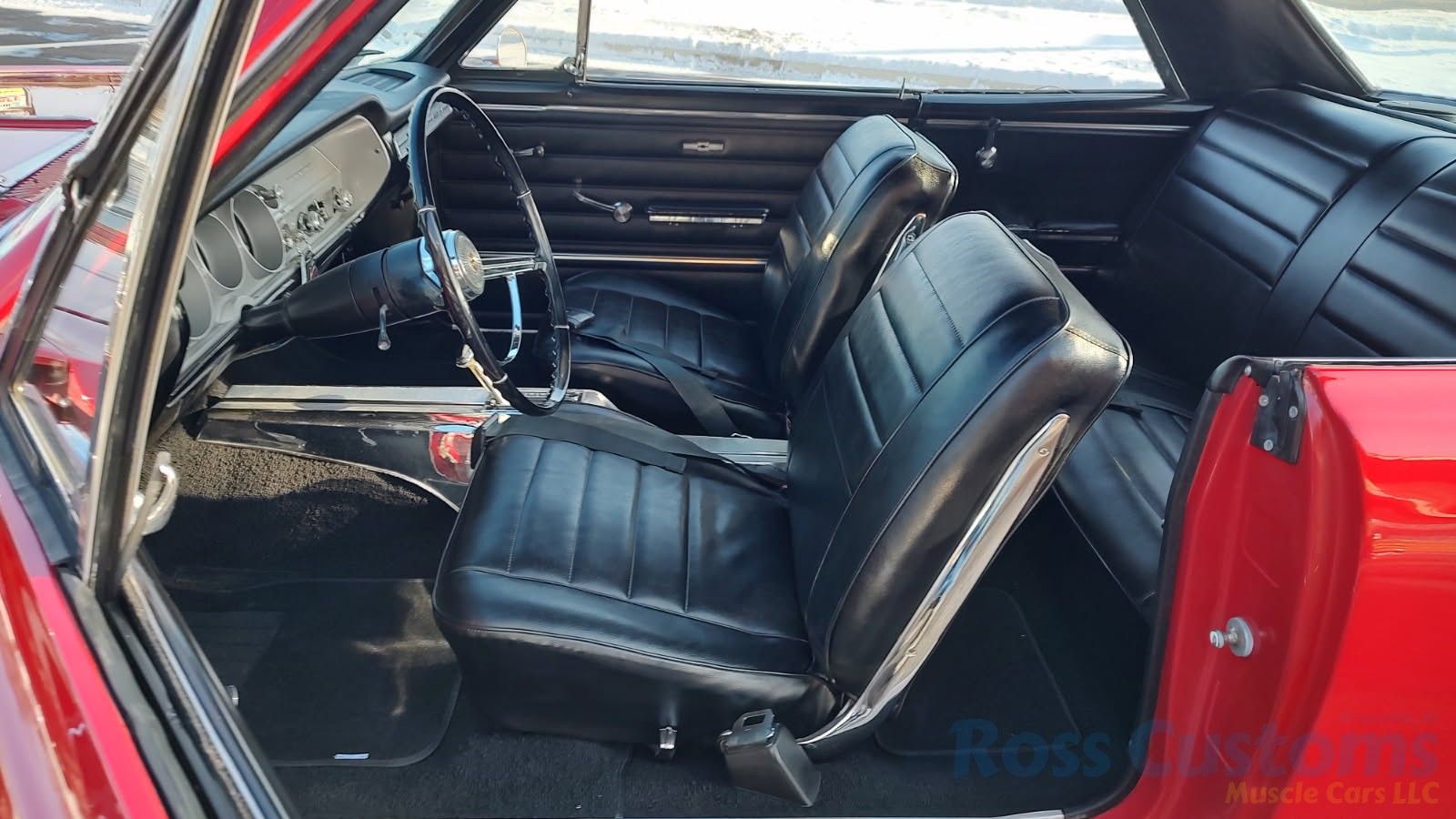 Black bucket seat console interior, original deluxe padded dash in excellent condition, lower dash also in very good condition, factory gauge package with tach, updated with AM/FM/Cassette stereo, original steering wheel in very good condition, new headliner and visors, new front door panels, rear are original in excellent condition, arm rest bases have also been replaced, front and rear seats have been reupholstered, front and rear seat belts, original center console in very good condition with correct shifter, carpet appears to have been replaced, new floor mats, original sill plates.