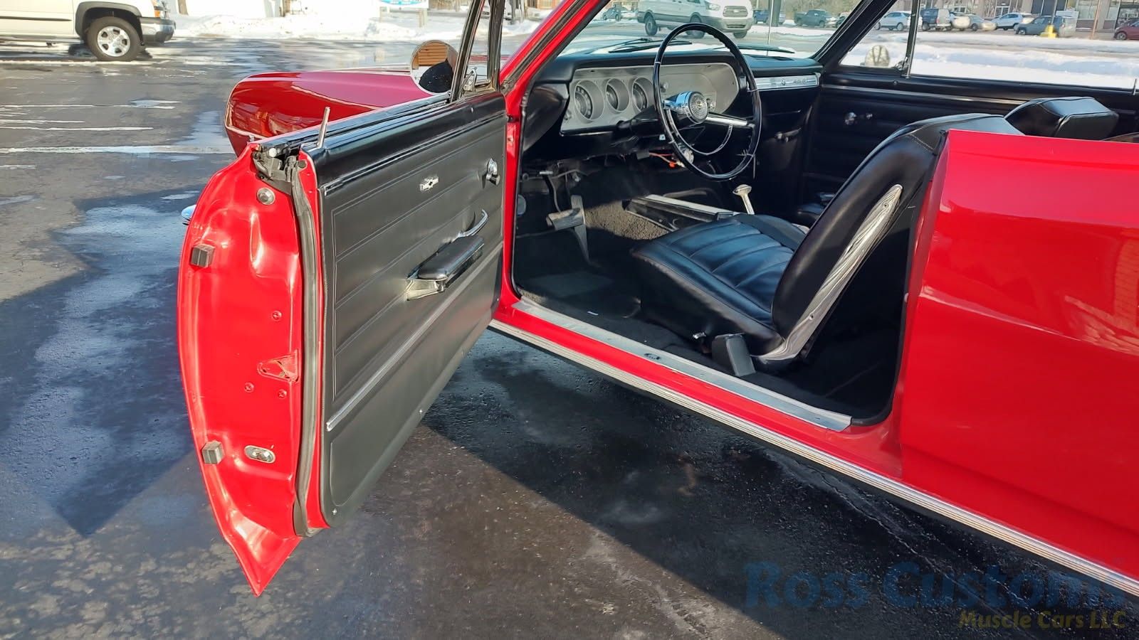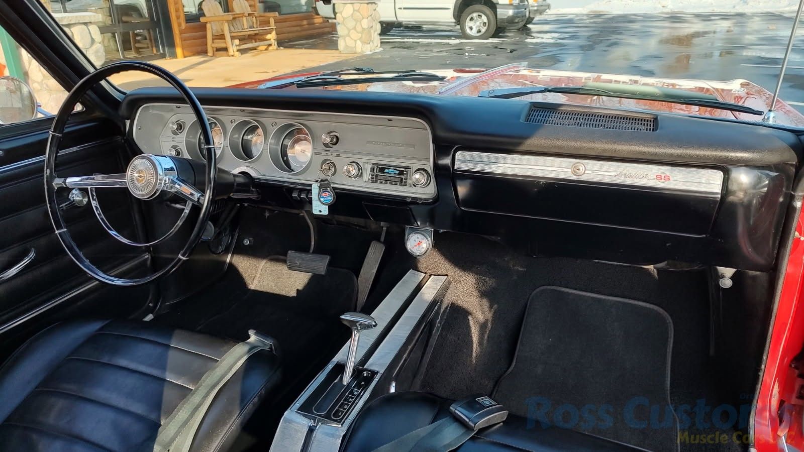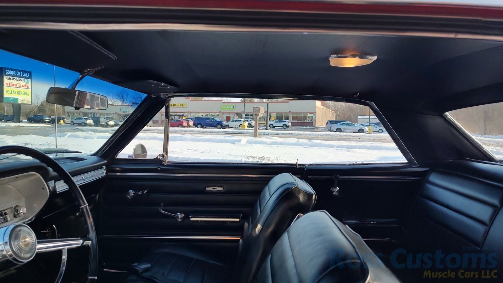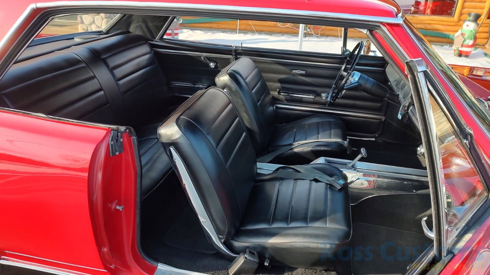 Black bucket seat console interior, original deluxe padded dash in excellent condition, lower dash also in very good condition, factory gauge package with tach, updated with AM/FM/Cassette stereo, original steering wheel in very good condition, new headliner and visors, new front door panels, rear are original in excellent condition, arm rest bases have also been replaced, front and rear seats have been reupholstered, front and rear seat belts, original center console in very good condition with correct shifter, carpet appears to have been replaced, new floor mats, original sill plates.