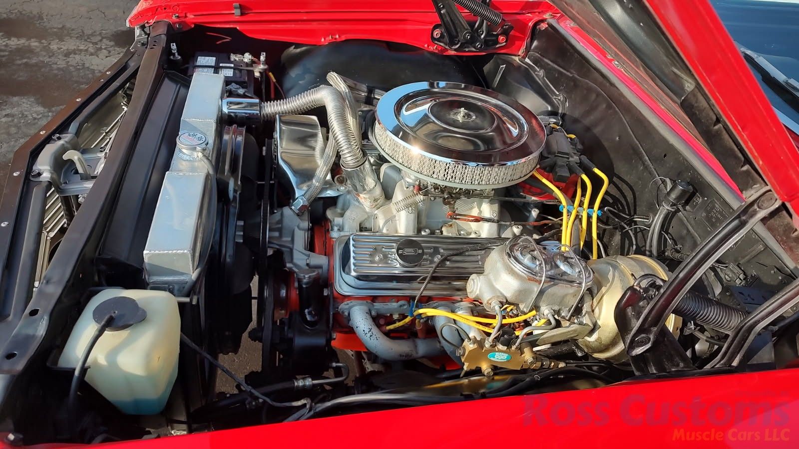 Under the hood the original motor has been replaced with a 30 over 350, Vortec aluminum cylinder heads, roller rockers, Holley aluminum intake, Holley dual feed carb with electric choke, nicely updated with electronic ignition, chrome valve covers and breather, high flow aluminum water pump with 6 blade performance fan and correct shroud, nicely outfitted with direct-fit aluminum radiator, power steering, power front disc brakes, front suspension has been gone through, this strong running 350 is backed up with its original 2 speed power glide, 10 bolt limited slip rear with 308 gear, set of long tube headers into dual exhaust out the back in stock location.