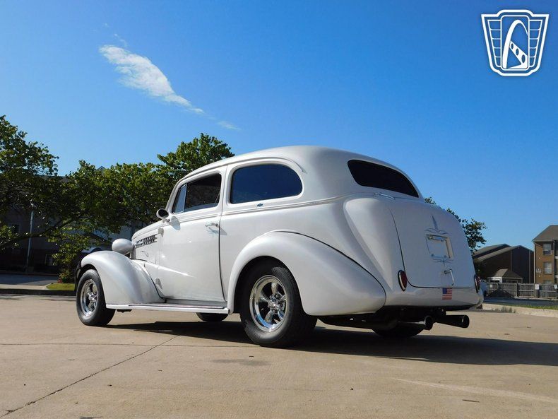 Gateway Classic Cars of Tulsa is proud to represent this slick 1938 Chevrolet Master Deluxe, a stunning example of vintage automotive craftsmanship. This vehicle boasts a pristine pearl white exterior that exudes elegance and sophistication, making it a head-turner wherever it goes. Complementing the exterior is a luxurious blue and white faux leather interior that is incredibly soft, offering a striking contrast that enhances the overall aesthetic appeal.