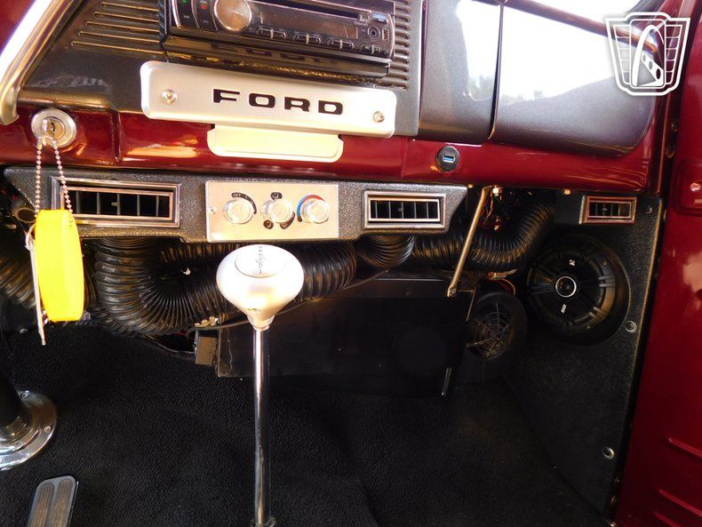 Entertainment options are plentiful, with an AM/FM radio and CD player providing a variety of listening choices. The custom wheels add a unique flair to the vehicle's overall appearance, while the seatbelts ensure safety for all occupants. This Ford F1 Panel is a wonderful blend of classic style and modern amenities, making it an ideal choice for those who appreciate both worlds.