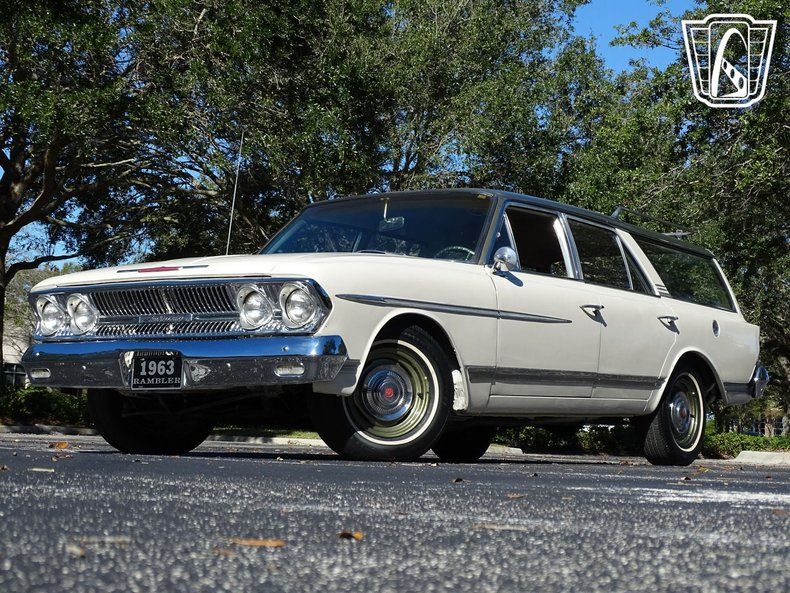 Gateway Classic Cars of Orlando is proud to present this beautiful 1963 Rambler Ambassador 990 wagon. Before minivans and SUVs all the cool moms were rolling around in full size station wagons. Beyond functional utility these cars oozed style and substance and perhaps the rarest of the 60s wagons was the Ambassador 990. This stylish wagon is painted in a white with a dark green roof contrasting handsomely. Take a walk around the vehicle and you'll notice nice details like the color keyed wheels, aluminum trim and roof luggage rack. Take a seat inside and you'll find a charming interior with plaid upholstery and a dashboard fit for a jet plane. Under the hood is a V8 and is paired with a 3 speed automatic. Imagine how this wagon can get up and go! If you're looking for a vintage family hauler that you don't see at just any car show, this is the one you want to own! Options include AM radio, power brakes, power steering, seat belts, cloth interior and radial tires.