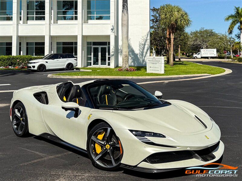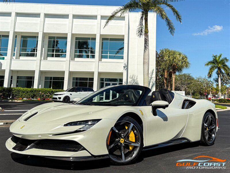 "2024 Ferrari SF90 Spider. Bianco Italia Exterior with Tetto Nero Interior. Features Include: 986 Horsepower Combined Output Twin Turbo 3.9L V8 Engine e4WD PHEV, 7.9 kWh Lithium Ion Battery, Eight-Speed F1 Dual-Clutch Automatic Transmission, F1-TRAC Traction Control/E-Diff 3, SCME-FrS Magnetorheological Dampers, 20"" Diamond Polished Forged Wheels, CCM-Carbon Ceramic Brake System, Yellow Brake Calipers, AFS System America, Back Radar, Carbon Fiber Side Air Splitter, Rear Diffuser In Carbon Fiber, Carbon Fiber Under Door Cover, Suspension Lifter, Full LED Headlights, LED Tail Lights, LED DRLs, Front & Rear Parking Sensors, Rear Parking Camera, Advanced Front Driving Camera, Keyless Access & Ignition with Push To Start, Carbon Fiber Driver Zones+LEDS, Carbon Fiber Door Panels, Carbon Fiber Upper Tunnel Trim, Colored Inner Details, CLDT With Special Leather, Colored Safety Belts, Carbon Fiber Dashboard Inserts, Leather Wrapped Multifunctional Steering Wheel, SiriusXM Radio Capable, Smartphone Integration, Bluetooth Phone & Audio, Navigation, Dual Zone Automatic Climate Control. Priced at Only $609,995. Financing and leasing available. We ship worldwide. We pay top dollar for lightly used sports cars, Call or text Our Product Specialists today at 239-522-2262 or email at sales@gcmworks.com. Fees and Taxes: $1199.00 Doc Fee on all Purchases. Out of state buyers are responsible for all state, county, city taxes and fees, as well as title/registration fees in the state that the vehicle will be registered."