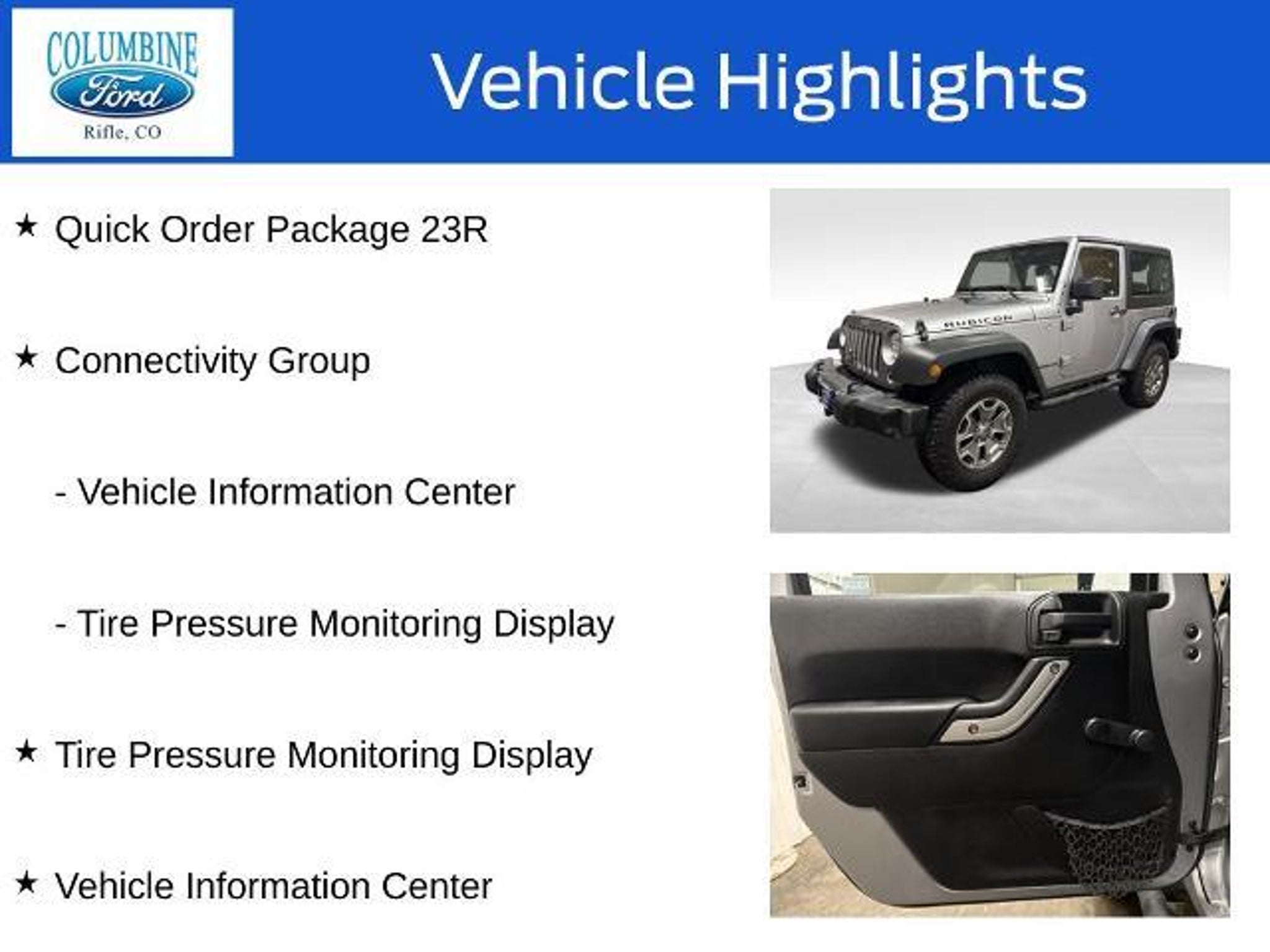 Fully Reconditioned!!! repairs performed Cabin filter - $140 Driver upper door hinge (broken) - $880 (includes paint) Rear brakes - $565 Front upper ball joints (play) - $735 Alignment - $190 Balance wheels and mount new tire on spare (vibration and spare has a hold in sidewall) - $305 Thermostat (check engine light) - $450 UVI - $535 Detail - $165 TOTAL - $4065 Rugged, Capable, and Ready for Adventure - Discover the 2015 Jeep Wrangler Rubicon This 2015 Jeep Wrangler Rubicon is the ultimate off-road companion, built to conquer any terrain with uncompromising capability and style. Featuring a powerful 3.6L V6 engine, 6-speed manual transmission, and legendary 4WD system, this Wrangler Rubicon is primed to take you on unforgettable adventures. ? Black 3-Piece Hard Top ? Connectivity Group ? Quick Order Package 23R ? Tire Pressure Monitoring Display ? Vehicle Information Center Beyond its impressive performance credentials, this Wrangler Rubicon comes equipped with a wealth of premium features designed to enhance your driving experience. Enjoy the convenience of the Connectivity Group, which includes a Vehicle Information Center and Tire Pressure Monitoring Display. The Quick Order Package 23R adds even more desirable amenities, ensuring you have the tools to tackle any challenge with confidence. Crafted with Jeep's renowned off-road DNA, the Wrangler Rubicon boasts a rugged suspension, 4-wheel disc brakes, and a host of advanced safety technologies to keep you secure, no matter the terrain. The classic Jeep styling, complete with the iconic seven-slot grille and removable doors and roof, allows you to fully immerse yourself in the great outdoors. Whether you're navigating winding mountain roads, traversing rocky trails, or simply enjoying a spirited drive, this 2015 Jeep Wrangler Rubicon is the perfect companion. Its uncompromising capability, premium features, and timeless design make it a true icon in the world of off-road vehicles. At Columbine Ford, we're proud to be Western Colorado's most trusted dealership and a multi-year recipient of Ford's prestigious President's Award for exceptional customer satisfaction. Our team is committed to honesty, transparency, and delivering a hassle-free buying experience on every visit. Whether you're shopping new or pre-owned, you'll find unbeatable service, western Colorado's largest selection of vehicles, competitive pricing, and a dealership that truly cares. Visit us at 2828 Railroad Ave., Rifle, CO 81650 or call 970-625-1680. Experience the aw