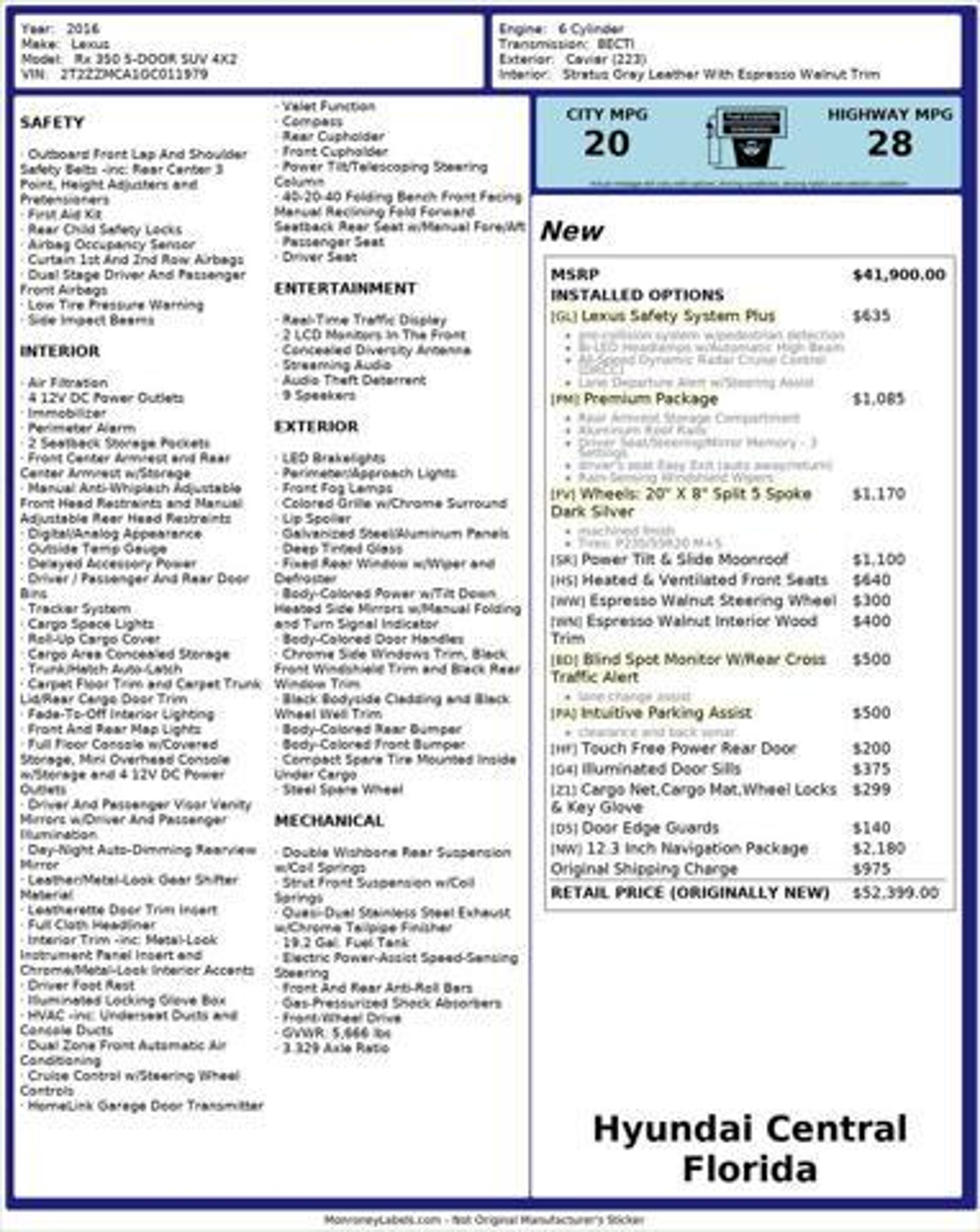 Enjoy legendary Lexus comfort, reliability, and safety in this 2016 Lexus RX 350 FWD, finished in classic Black. This luxury midsize SUV delivers a smooth, quiet ride with refined styling and a reputation for long-term dependability"”making it an outstanding choice for daily driving or long-distance travel. Under the hood, the RX 350 is powered by a proven 3.5L V6 DOHC engine paired with an 8-Speed Automatic transmission, providing confident performance while maintaining excellent efficiency at 20/27 City/Highway MPG. The well-appointed interior features NuLuxe® seating surfaces, power front seats, dual-zone automatic climate control, leather-wrapped steering wheel and shift knob, power liftgate, and HomeLink® garage door transmitter. Technology and convenience are enhanced with Lexus Display Audio, SiriusXM, CD player, steering wheel"“mounted controls, and a rearview backup camera. Safety is a highlight of the RX 350, equipped with Electronic Stability Control, Brake Assist, traction control, multiple airbags, and a solid safety structure that helped earn this model the 2016 IIHS Top Safety Pick award. Additional features include 18 7-spoke aluminum wheels, fog lights, split-folding rear seats, and a spacious cargo area designed for versatility and comfort. Hyundai Montgomery BRONZE Tag Benefits: 5 Day / 300 Mile Exchange or Return Policy "” If you don't like it, BRING IT BACK! Saves you over $1,000 vs. our largest competitors every day Just add tax!