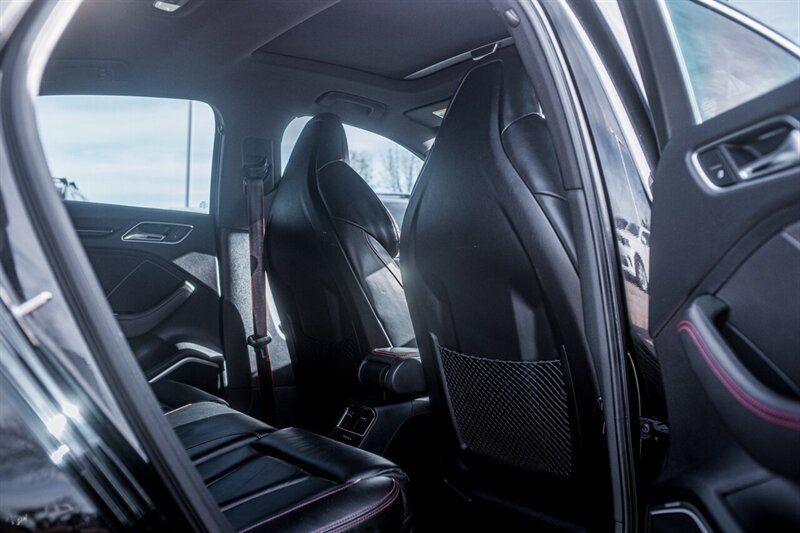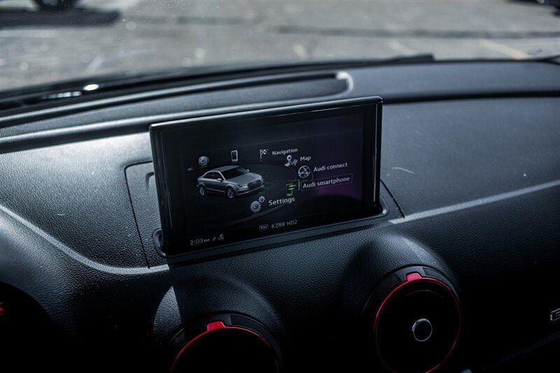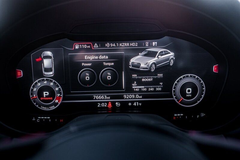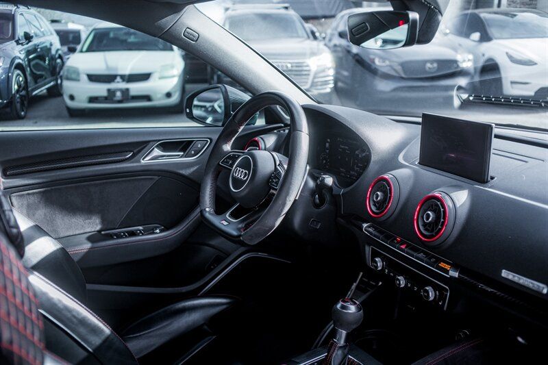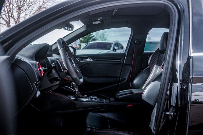 2018 Audi RS 3 2.5T quattro Powertrain and performance - 2.5-liter turbocharged inline-five engine producing 400 hp and 354 lb-ft of torque. - 7-speed S tronic dual-clutch automatic transmission with steering-wheel-mounted shift paddles for manual control. - Audi quattro all-wheel drive system tuned for sporty driving, providing strong traction and predictable handling under acceleration. - Launch control and RS-specific drive modes accessible through Audi Drive Select for sharper throttle mapping and transmission response. - Manufacturer-quoted 060 mph in the high 3-second range and an electronically limited top speed of 155 mph (higher limit available as a factory option). Chassis, brakes and wheels - RS-tuned suspension with stiffer springs, firmer dampers and revised anti-roll characteristics compared with non-R models to deliver sharper handling and reduced body roll. - High-performance ventilated disc brakes with larger front rotors and multi-piston front calipers for increased stopping power and fade resistance. - 19-inch alloy wheels fitted with high-performance tires as standard, sized and specd for balance of grip and everyday usability. - Sport-biased steering calibration for quicker response and improved feedback at higher speeds. Exterior features - Distinctive RS exterior styling including a more aggressive front bumper with honeycomb grille and RS badging, widened sills and a sculpted rear bumper. - Integrated rear diffuser and twin oval exhaust outlets that emphasize the models performance orientation. - LED daytime running lights and LED taillights (LED headlight availability varies by market/trim and may be standard on many factory configurations). - Subtle RS-specific exterior touches such as gloss or matte trim accents and larger air intakes for improved cooling. Interior and comfort - Sport seats with enhanced bolstering to hold occupants during spirited driving; upholstery typically combines leather and Alcantara with RS stitching and embossing. - Flat-bottom, leather-wrapped multifunction steering wheel with thumb grips and aluminum paddle shifters. - Aluminum or metal-look interior trim and RS-specific instrumentation appointments, including unique gauge graphics. - Dual-zone automatic climate control, power-adjustable front seats, and heated front seats in many factory-equipped examples. - Practical rear seating and a usable cargo area for a high-performance compact sedan. Infotainment and driver information - Audi MMI infotainment system supplying media, phone connectivity and vehicle settings; features include Bluetooth hands-free calling and audio streaming and USB inputs. - Factory navigation available on many models and configurations. - Audi Virtual Cockpit (a configurable full-digital instrument display) was offered on RS models, providing selectable readouts such as a large tachometer and performance information. - Premium audio system options available from the factory for improved sound quality. Overall The 2018 Audi RS 3 2.5T quattro blends a compact, track-capable chassis with a high-revving, characterful 2.5L turbo five-cylinder, delivering strong straight-line acceleration, confident all-wheel-drive traction and a suite of RS-specific hardware and interior appointments from the factory. The models factory equipment emphasizes a balance of everyday usability and focused performance; several optional packages allow buyers to add further technology, dynamic, and comfort features. Although every reasonable effort has been made to ensure the accuracy of the information contained on this site, absolute accuracy cannot be guaranteed. This site, and all information and materials appearing on it, are presented to the user 'as is' without warranty of any kind, either express or implied. All vehicles are subject to prior sale. Price does not include applicable tax, title, licen