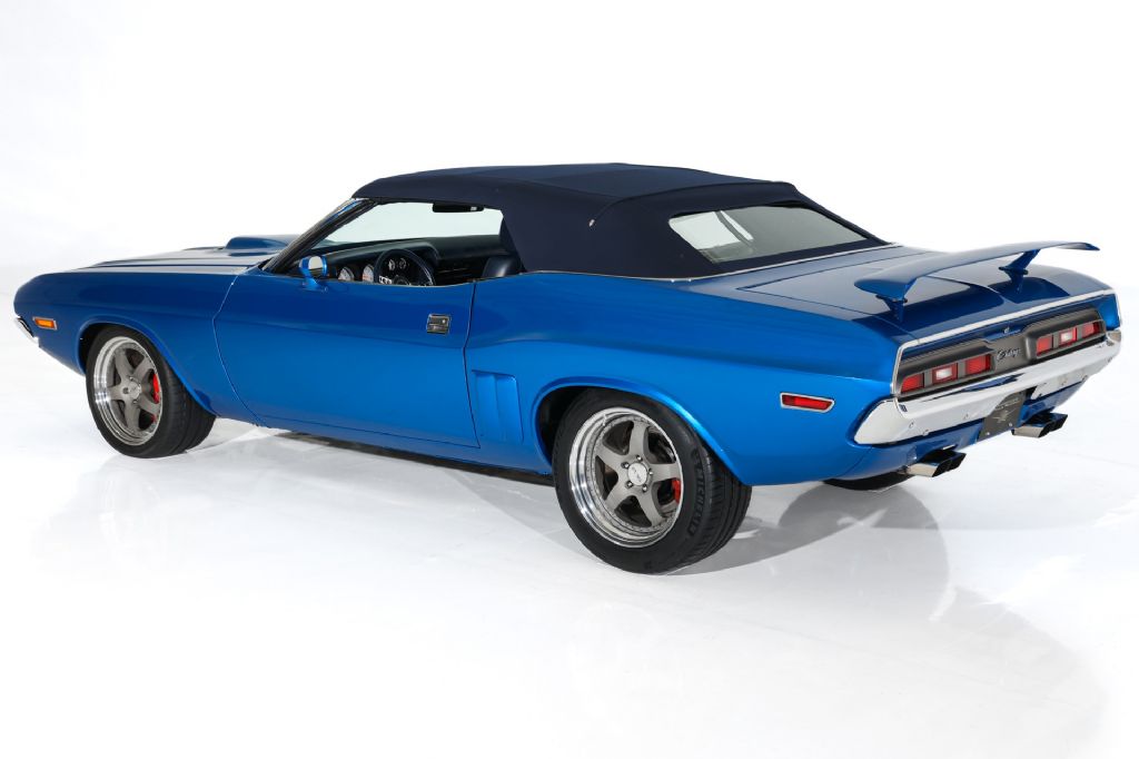 Viper Blue Metallic, Pro-Tour Challenger convertible, professionally built by XV Motorsports who is a high-end builder of Mopar touring cars, powered by a 600 horsepower Hemi and a very bad attitude. This Dodge Pro-Tour convertible is basically a hand built Mopar supercar with 1971 Challenger E Body that was re-engineered by XV Motorsports from the ground up with performance and creature comfortS in mind, with fully modernized chassis and suspension, Recaro leather, heated power seats, Tremec Pistol Grip 6-speed, 4-wheel disc slotted brakes, power rack and pinion steering, XV Motorsports custom gauges, tilt steering, power windows and locks, dark blue canvas power top, rolling on KINESIS Custom Wheels and Michelin performance rated radial to put the rubber to the road.