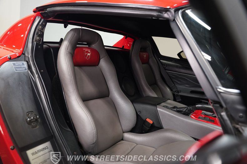 Under that massive front-hinged clamshell hood, we find an equally massive 8.0-liter overhead-valve V-10 engine upgraded with an ROE supercharger. Originally making 400 horsepower and 465 pound-feet of torque from the factory, this Viper's venom packs nearly double that punch, making over 700 horsepower, which sounds incredible bellowing through those throwback side pipes. That big block power is funneled through a six-speed manual transmission upgraded with a lightweight aluminum flywheel and beefier McLeod clutch, before being sent out to the stock Viper rear that transfers that plethora of ponies to a set of five-spoke 17-inch Viper wheels shod in steamroller-sized 335/35ZR-17 Pilot Sport rubber, while a set of 275/40ZR-17 Michelins handles steering duties up front.