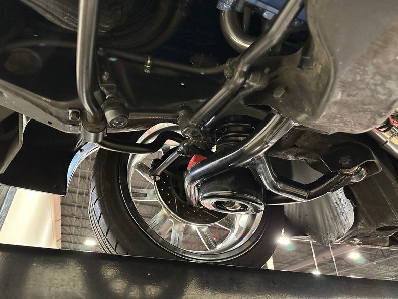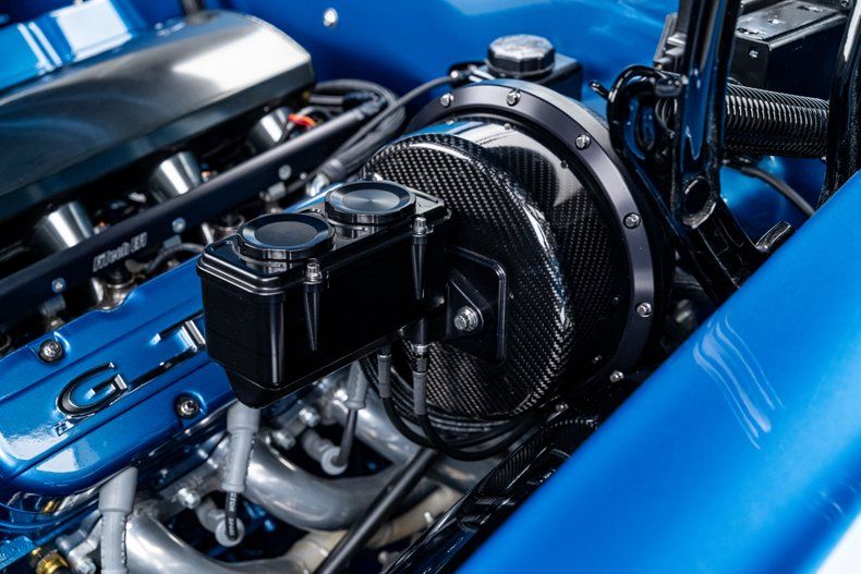 Power comes from a 6.0L LS crate engine sourced from The Hot Rod Company. The iron block is topped with CNC-ported aluminum heads and a FiTech electronic fuel injection system featuring a FiTech intake manifold and throttle body. The engine is finished in an attractive blue hue that recalls classic Pontiac mills, contrasting with black hardware, billet details, and a show-grade Carbon X brake booster featuring a carbon-fiber shell and exposed fasteners. A billet CVF accessory drive ties it all together. Power runs through a Tremec T56 six-speed manual transmission to a 10-bolt rear axle with 3.23 gears and Positraction. The chassis features tubular control arms, Aldan coilover shocks, and MP four-wheel power disc brakes with drilled and slotted rotors, bringing precise handling and confident braking to match its muscle. Power steering keeps it driver-friendly.