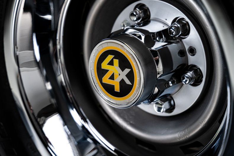The body presents with clean, straight sheet metal and consistent panel alignment throughout. The black finish lays down with deep gloss across the hood, doors, and quarters, giving the truck a crisp, finished look under studio lighting. Bright trim and glass show well and give the exterior a clean perimeter. Sitting tall on 15" rally wheels wheels wrapped in 33x10.50 BFGoodrich Mud-Terrain tires, The stance is tall, purposeful, and proportioned the way these trucks should be. The black and red combination works perfectly here. It is a timeless color pairing that never goes out of style, whether it is on a muscle car, a hot rod, or a classic 4x4 like this.