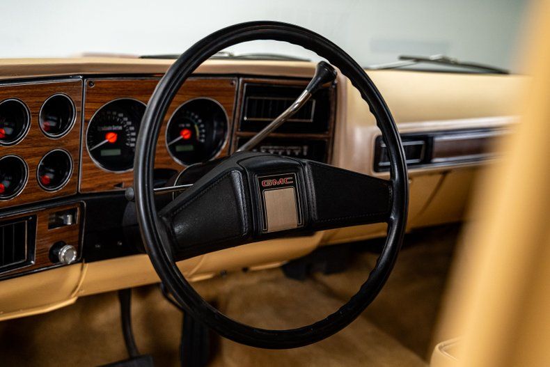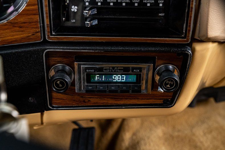 Inside, the desert theme carries straight through the cabin. The Highlander-style front buckets and rear bench wear custom orange plaid with tan vinyl that looks straight out of 1979. Door panels and carpets match the palette. A period-style center console adds storage, cupholders, and the hidden switch for the cutouts. The Dakota Digital Syndicate Series gauges preserve the factory look while giving you a modern digital brain for fuel, temp, voltage, and other functions. The radio keeps the GMC face but feeds a modern Retrosound unit tied to Kicker speakers. Air conditioning blows cold and everything inside feels tight and intentional.
