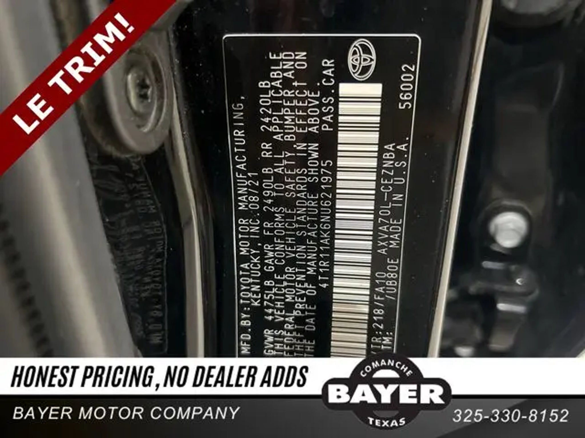 Details > 2022 Toyota Camry LE 4DR Sedan For Sale in Comanche, TX Private Party Sellers Click here to place your ad now! You auta tell them you saw the ad in AutaBuy when you call or email. 1/28 2/28 3/28 4/28 5/28 6/28 7/28 8/28 9/28 10/28 11/28 12/28 13/28 14/28 15/28 16/28 17/28 18/28 19/28 20/28 21/28 22/28 23/28 24/28 25/28 26/28 27/28 28/28 View 28 Photos View All Add to My Garage Parked in Your Garage! Bayer Ford, Inc. Contact Seller: I would like to: Make Offer Check Availability Ask A Question Request More Photos Check Financing Options Send a copy of this message to me Add this listing to my garage Send to Mobile Mileage 106,783 Exterior Color Midnight Black Metallic Interior Color ASH Doors 4 Engine 2.5L I4 Transmission 8 Speed Auto Stock # 55306 VIN 4T1R11AK6NU621975 Estimated Monthly Payment $313 mo Apply Now J.J. Best Banc & Co. 2022 Toyota Camry LE 4DR Sedan Description: Black 2022 Toyota Camry LE FWD 8-Speed Automatic 2.5L I4 DOHC 16V Ash Cloth. Call us directly at 1-844-695-6060! Delivery available upon request! 28/39 City/Highway MPG WE PUT CUSTOMERS FIRST! · Mileage: 106,783 · Color: Midnight Black Metallic Price: $18,790. Price: $17,990. Mileage 106,783 Exterior Color Midnight Black Metallic Interior Color ASH Doors 4 Engine 2.5L I4 Transmission 8 Speed Auto Stock # 55306 VIN 4T1R11AK6NU621975 Estimated Monthly Payment $313 mo Apply Now J.J. Best Banc & Co. Add to My Garage Parked in Your Garage! Message Seller Bayer Ford, Inc. Contact Seller: I would like to: Make Offer Check Availability Ask A Question Request More Photos Check Financing Options Send a copy of this message to me Add this listing to my garage Offered for sale by Bayer Ford, Inc. COMANCHE, TX Price: $18,790. Price: $17,990. Offered for sale by Bayer Ford, Inc. COMANCHE, TX [entire inventory] Ask Auta Intelligence The first collector-car AI built directly into a classic car marketplace How easy are parts to find for this model? Can you show me more cars for a similar price? What kind of mileage do these get? How many Camrys were produced in Black? What engine options did these come with? What colors did these come in? How far is this from me? Tell me the history on this model How many of these were produced? When was this model first introduced? What does this VIN number tell me? What trim levels were available for this model? Where is this located? What transmission options did these offer? What factory options were available on this model? Do you have a similar car to sell? List It Now! Questions about this car? Ask Auta Intelligence for production numbers, available options, etc. · Subscribe to AutaBuy! · Send a Gift Subscription Notice to a Friend