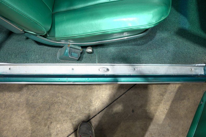 Inside, the turquoise leather interior mirrors the exterior beautifully, creating a cohesive and unique cabin. A wooden steering wheel adds warmth and vintage charm, while Autometer Sport Comp gauges for oil pressure, water temperature, and RPM provide clear performance focused information. A JVC stereo paired with Polk speakers brings modern audio quality into the cabin without disrupting the classic vibe.