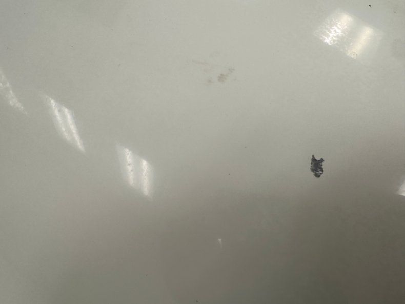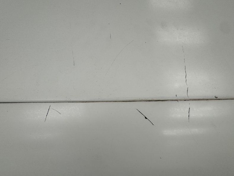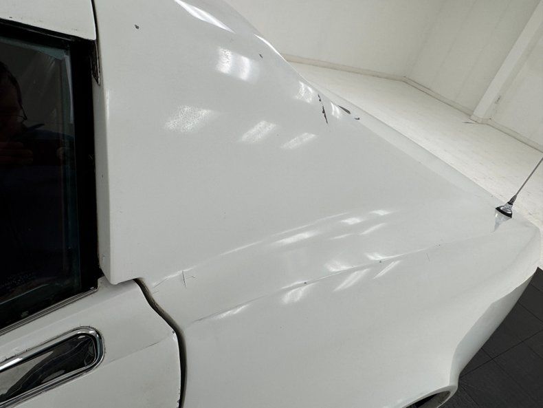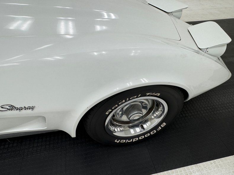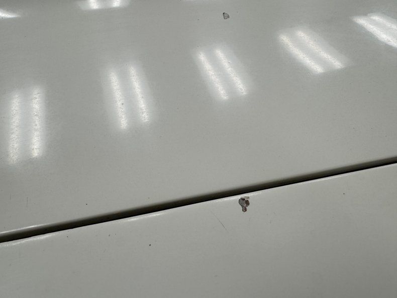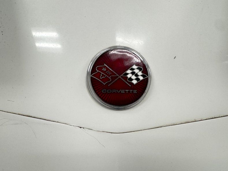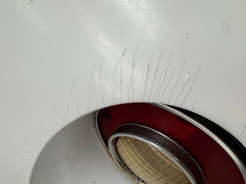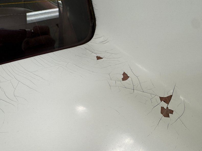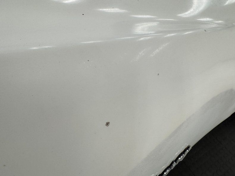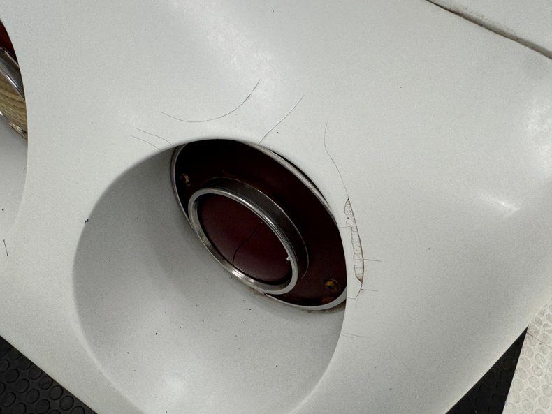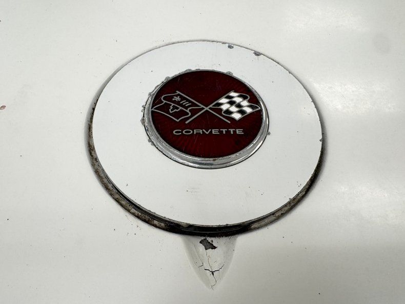 Single stage Classic White paint covers the car which retains the legendary Corvette lines and the Coke bottle shape, essentially raised fenders connected by a straight center under a steeply raked windshield. Those fenders arch over 15-inch Chevrolet Rally wheels, the fronts giving way to the epic fender vent. Flying buttresses flank the rear window like tailfins while the nose of the car comes to a point, like a shark, and places the grille behind the bumperettes. Polished components include the side mirrors, window trim, and flush handles perches on the tops side of the doors. Imperfections range from numerous chips throughout to cracked edges, scratches, scuffs, cracked paint throughout, and areas of discoloration, touch up or general dullness. A mirror is missing and the rubber bumperettes are losing their black coating. The chin is damaged and shows exposed fiberglass and there are cracked pieces in other places.