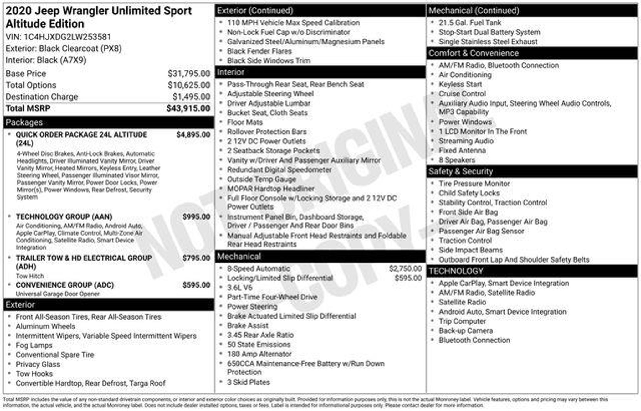 Discover the ultimate off-road companion in the 2020 Jeep Wrangler Unlimited Sport Altitude. This rugged and versatile SUV is ready to take you on unforgettable adventures, whether you're conquering the trails or navigating the daily commute. Packed with an impressive array of features, this Wrangler Unlimited Sport Altitude stands out from the crowd. Highlights include: â Quick Order Package 24L Altitude â Technology Group â Trailer Tow & HD Electrical Group â Convenience Group â Anti-Spin Differential Rear Axle â Bridgestone Brand Tires Step inside and experience the exceptional comfort and convenience of this Wrangler. Enjoy the 7.0 touchscreen display with Uconnect 4, Apple CarPlay, and Android Auto integration, keeping you connected and entertained on the go. The automatic climate control system and power windows add to the refined driving experience, while the remote keyless entry and security alarm provide added peace of mind. Beneath the bold exterior, the 3.6L V6 24V VVT engine and 8-speed automatic transmission deliver impressive power and efficiency, with an EPA-estimated 18 MPG in the city and 22 MPG on the highway. The 4-wheel drive system and heavy-duty suspension ensure you can tackle any terrain with confidence, while the anti-lock brakes and electronic stability control provide enhanced safety and control. Designed to stand out, the Wrangler Unlimited Sport Altitude features a striking black exterior with a gloss black grille, matte black Jeep badge, and body-color fenders. The black interior accents and leather-wrapped steering wheel add a touch of sophistication to the rugged persona. Experience the ultimate in off-road capability and on-road refinement with the 2020 Jeep Wrangler Unlimited Sport Altitude. Visit our showroom today and let us demonstrate how this exceptional vehicle can enhance your driving adventures. A/Z Plan Price is pre-set by Ford Motor Company for eligible Ford employees (A-Plan) or retiree/surviving spouse (Z-Plan) and requires a PIN to be generated by the employee. Up to 4 PINs per calendar year may be used toward the purchase/lease of a new vehicle for the employee/retiree or their eligible immediate family members. Immediate family members include Spouse, Parents, Spouse's parents, Grandparents, Spouse's grandparents, Sons and daughters (including in-laws and step-children), Grandchildren, Brothers and sisters (including in-laws, half and step), Aunts and uncles (including in-laws, half and step), Nieces and nephews (including in-laws, half a