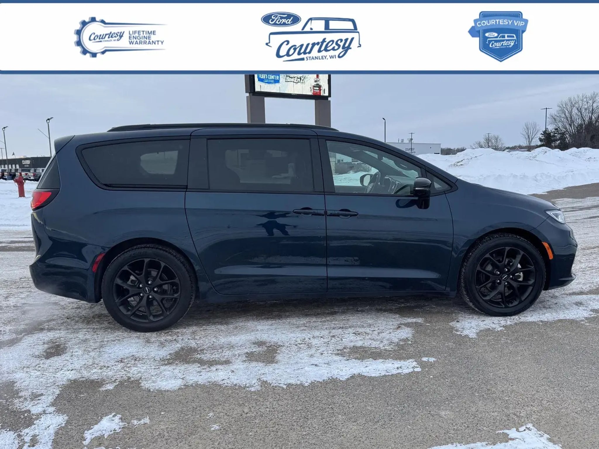 2025 Chrysler Pacifica Limited Fathom Blue Pearlcoat is Certified, and we would love the opportunity to speak more about the advantages of our certification. New Battery and Wipers! Please reference 15119T and call us at . Why Buy From Courtesy Auto & Truck Center, Inc. VIP Pricing representspremium quality of service tothe customer. With all premium,economy, and utility brands thecustomer has a guarantee theycan lean on."¢ Custom vehicle ordering and delivery"¢ Service pick-up and drop-off"¢ Mobile service vehicle"¢ Courtesy vehicle or shuttle"¢ Rewards program for service New Vehicles (under factory warranty)Lifetime Engine Limited Warranty. 1-Year Zurich Shield Limited Warranty. Courtesy Certified (under 85,000 miles)Lifetime Engine Limited Warranty 1-Year Zurich Shield Limited Warranty Courtesy Certified (85,001-100,000 miles)6-Month/6,000 Mile Limited Warranty 1-Year Zurich Shield Limited Warranty *Some exclusions apply. See dealer for details. *Some exclusions apply.This Limited Warranty does not provide coverage if your vehicle:A. Is equipped to plow snow, whether or not the plow blade is attached to your vehicle.B. Is used for commercial hauling, delivery, or limousine service.C. Is used for hauling or towing in excess of the manufacturer's limitations and specifications.D. Is used for rental, racing, speed contest or other competiton, police car, security vehicle, emergency vehicle, shuttle service, taxi or commercial towing.E. Has been declared a total loss or has been inssued a salvaged or branded title. *needs to be less that 15 years old and under 85k miles. All internally lubricated parts contained within the engine block and cylinder head(s). Cylinder head, engine block. and rotor housings when damaged as a result of the failure of a covered internally lubricated part. Coolant, fluids, lubricants, and filters when required in connection with the repair and replacement of a covered part. Important Package Information Quick Order Package 27P Comfort Ventilated seats offer warm weather comfort by cooling areas of the occupant's body not exposed to the air conditioning system. Convenience The vehicle can be remotely started from the keyfob and from a smart device such as a phone and a subscription is required to maintain access to the smart device remote start function. Access to the cargo area is gained via a large, power-operated rear door that opens upwards. This door may also contain the rear windshield of the vehicle. Safety and Security A blind spot detection system will alert the driver when another vehicle is within the warning zone. Technology and Telematics The vehicle is equipped with a built-in voice activated navigation system. Our Dealership We look forward to doing business with you! Give us a call at and schedule a test drive. We are located at 409 Junction Avenue Stanley, WI 54768.