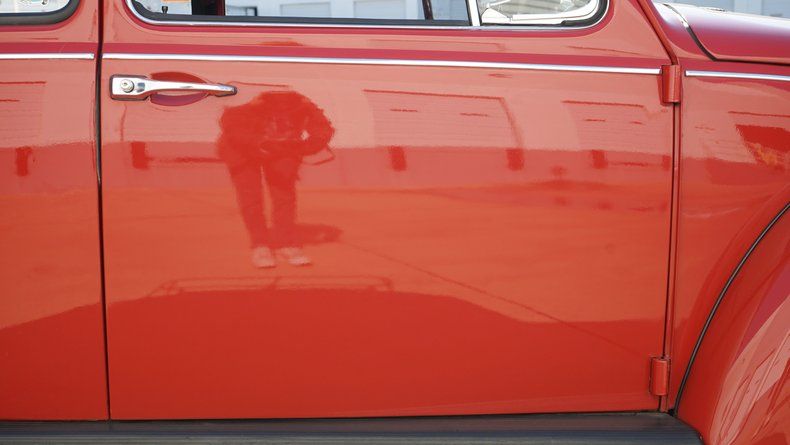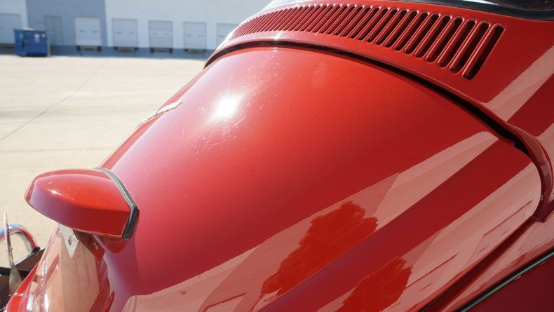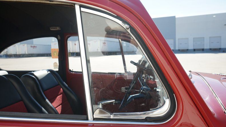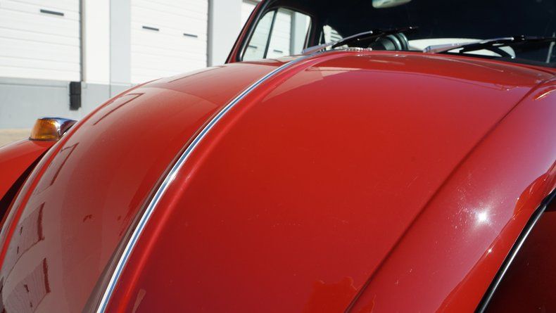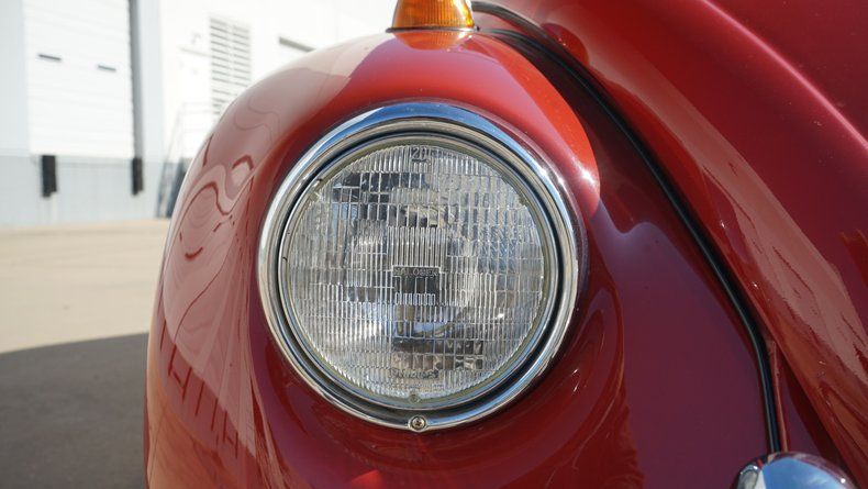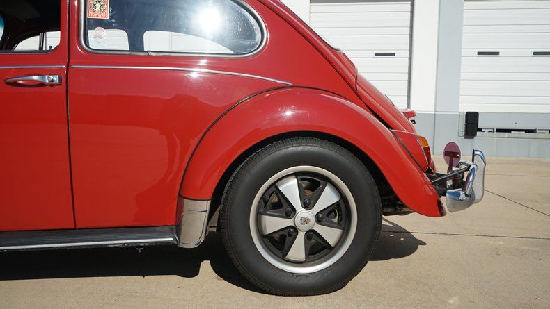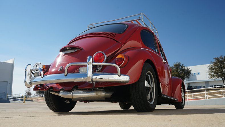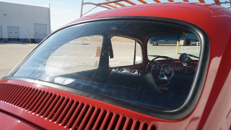Inside, the Beetle features a custom interior that is both stylish and comfortable. The cabin is finished in a red interior color scheme, nicely coordinated with the exterior paint. Custom high-back bucket seats provide improved comfort and support while maintaining a clean, classic appearance. The dashboard retains its vintage charm and is finished to match the overall aesthetic, with a clean layout and period-correct details. Interior panels, carpeting, and trim are all in very clean condition, reflecting the quality of the build.