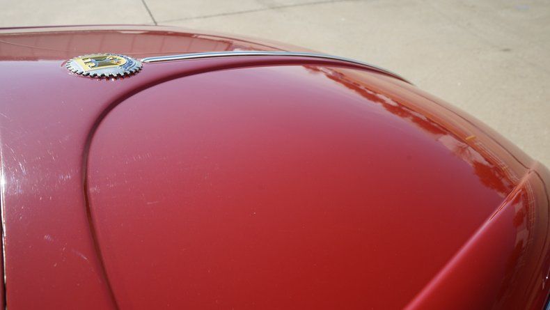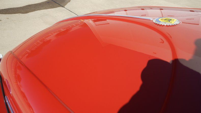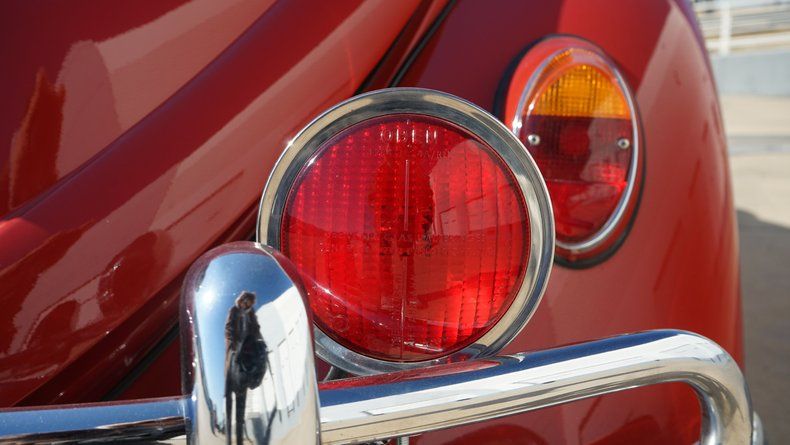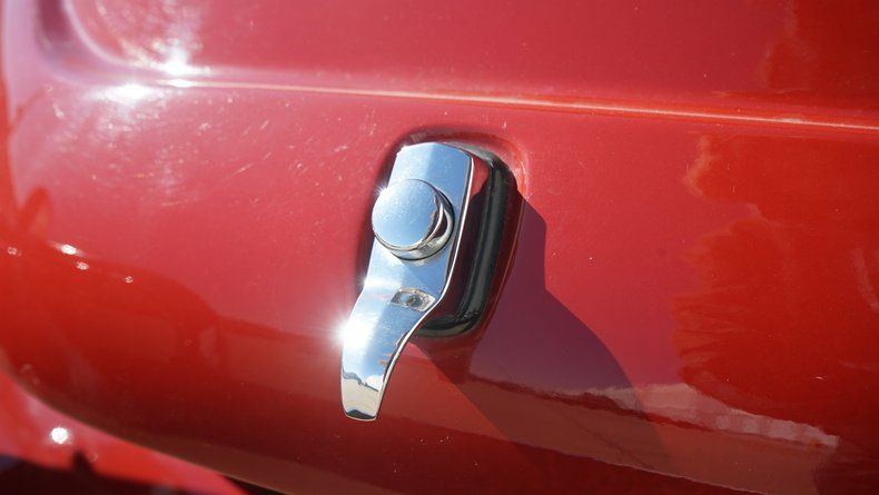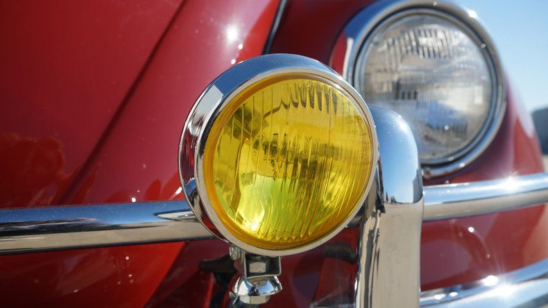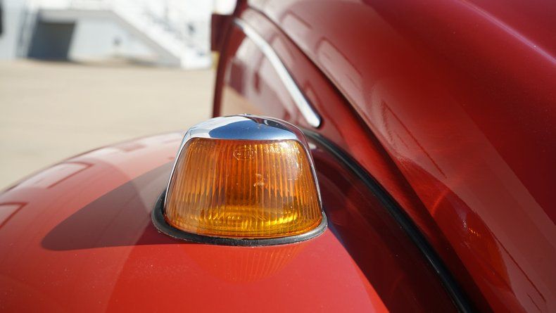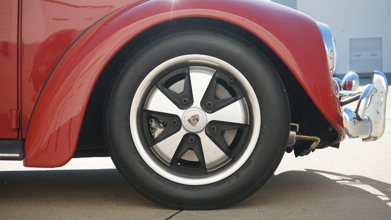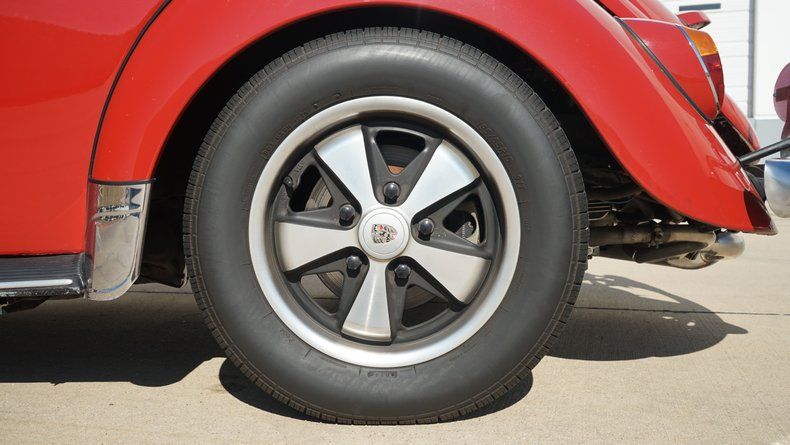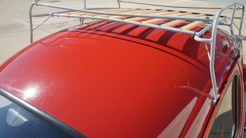The exterior features clean body lines with a lowered stance that perfectly captures the Cal Look aesthetic. Chrome trim and bumpers are in excellent condition, complementing the deep red paint nicely. A roof rack adds both visual character and practicality, enhancing the vintage appeal while remaining period-correct. The car sits on black-centered wheels with polished lips, giving it a timeless performance look that contrasts sharply against the red paint. The wheels are wrapped in low-profile performance tires, providing a confident stance and improved road handling.
