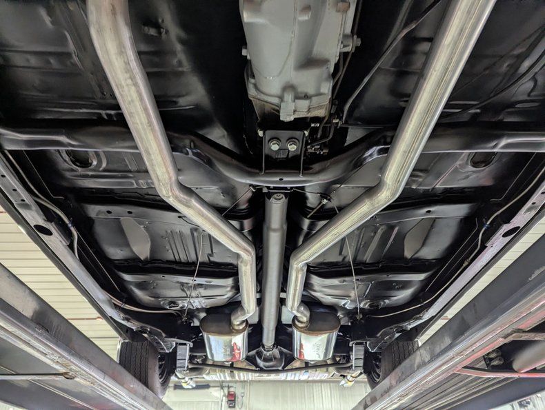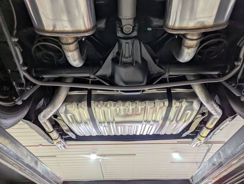 UNDERSIDE: It practically looks like a new 1970 Chevelle underneath this one! It's fully detailed and restored. It has the F-41 suspension which includes front and rear sway bars, and boxed rear control arms. The dual exhaust has stainless Street Max mufflers and correct SS tips. The brake system was completely redone and has disc in front, drum in back and the e-brake assembly is new. The fuel system was replaced including the tank. Looking up at the motor it is clean Chevy orange and has the factory type starter. The correct Muncie 4-speed manual trans and the linkage look fresh. In back is the correct 12 bolt rear end with 3.31 gears. The floors, inner rockers and braces are super clean metal painted a nice, smooth semi gloss black.