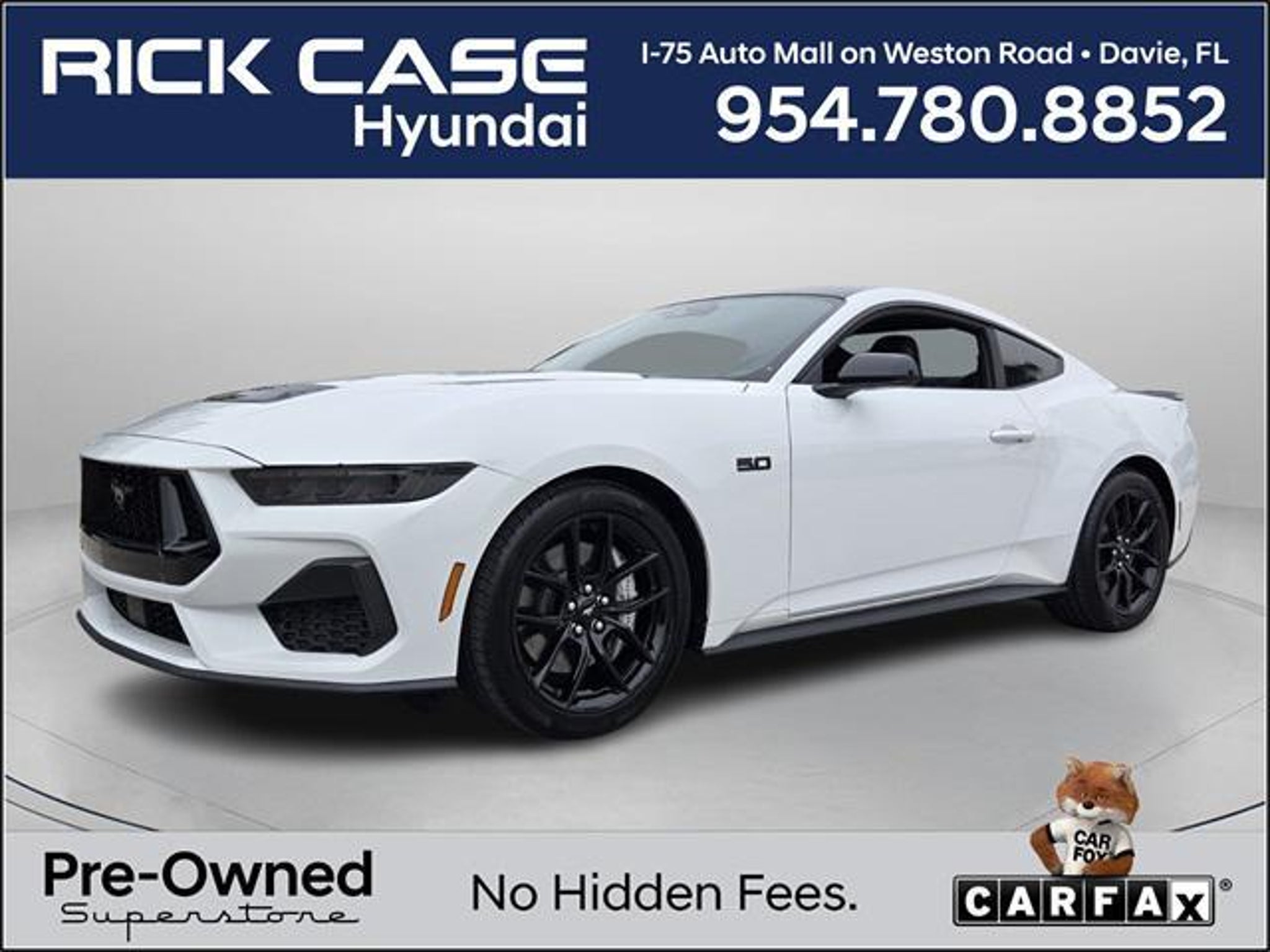 Details > 2024 Ford Mustang GT 2DR Fastback For Sale in Davie, FL Private Party Sellers Click here to place your ad now! You auta tell them you saw the ad in AutaBuy when you call or email. 1/27 2/27 3/27 4/27 5/27 6/27 7/27 8/27 9/27 10/27 11/27 12/27 13/27 14/27 15/27 16/27 17/27 18/27 19/27 20/27 21/27 22/27 23/27 24/27 25/27 26/27 27/27 View 27 Photos View All Add to My Garage Parked in Your Garage! Rick Case Hyundai Contact Seller: I would like to: Make Offer Check Availability Ask A Question Request More Photos Check Financing Options Send a copy of this message to me Add this listing to my garage Send to Mobile Mileage 30,620 Exterior Color Oxford White Interior Color Black Onyx Doors 2 Engine 5.0L V8 Stock # TR5405679 VIN 1FA6P8CF1R5405679 Estimated Monthly Payment $718 mo Apply Now J.J. Best Banc & Co. 2024 Ford Mustang GT 2DR Fastback Description: Rick Case Hyundai Davie · Mileage: 30,620 · Color: Oxford White Price: $41,287. Mileage 30,620 Exterior Color Oxford White Interior Color Black Onyx Doors 2 Engine 5.0L V8 Stock # TR5405679 VIN 1FA6P8CF1R5405679 Estimated Monthly Payment $718 mo Apply Now J.J. Best Banc & Co. Add to My Garage Parked in Your Garage! Message Seller Rick Case Hyundai Contact Seller: I would like to: Make Offer Check Availability Ask A Question Request More Photos Check Financing Options Send a copy of this message to me Add this listing to my garage Offered for sale by Rick Case Hyundai DAVIE, FL Price: $41,287. Offered for sale by Rick Case Hyundai DAVIE, FL [entire inventory] Ask Auta Intelligence What's the typical 0-60 time for this configuration? What does this VIN number tell me? How many of these were produced? What's the typical 1/4 mile time for this setup? How many Mustangs were produced in White? Where is this located? Tell me about this model What kind of mileage do these get? What transmission options did these offer? How much horsepower does this have? What colors did these come in? What trim levels were available for this model? What makes this model desirable to enthusiasts? When was this model first introduced? What factory options were available on this model? How far is this from me? Can you show me more cars for a similar price? What engine options did these come with? How easy are parts to find for this model? Do you have a similar car to sell? List It Now! Questions about this car? Ask Auta Intelligence for production numbers, available options, etc. · Subscribe to AutaBuy! · Send a Gift Subscription Notice to a Friend