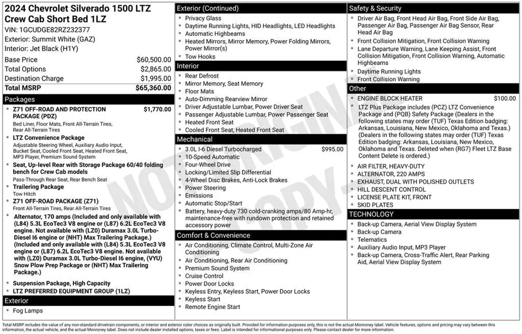 CARFAX One-Owner. Clean CARFAX. Certified. Summit White 2024 Chevrolet Silverado 1500 LTZ Z71 OFF ROAD DURAMAX 4WD 10-Speed Automatic 3.0L I6 PRICE INCLUDES DEALER DOC FEE!, Silverado 1500 LTZ Z71 OFF ROAD DURAMAX, 4D Crew Cab, 3.0L I6, 10-Speed Automatic, 4WD, Summit White, Black Leather, 10-Way Power Driver Seat w/Lumbar, 10-Way Power Passenger Seat Adjuster w/Lumbar, 12.3 Multicolor Reconfigurable Digital Display, 120-Volt Bed Mounted Power Outlet, 120-Volt Interior Power Outlet, 2 USB Data Ports, Auto-Dimming Inside Rear-View Mirror, Auto-Locking Rear Differential, Bluetooth® For Phone, Chevrolet Connected Access Capable, Chrome Mirror Caps, Color-Keyed Carpeting Floor Covering, Deep-Tinted Glass, Driver Memory, Dual Rear USB Ports (Charge Only), Electric Rear-Window Defogger, Electrical Steering Column Lock, Electronic Cruise Control, Floor Mounted Center Console, Front Frame-Mounted Black Recovery Hooks, Front LED Fog Lamps, Front Rain-Sensing Wipers, Front Rubberized Vinyl Floor Mats, HD Surround Vision, Heated Driver & Front Outboard Passenger Seats, Heated Steering Wheel, High Capacity Suspension Package, Hitch Guidance, Hitch Guidance w/Hitch View, In-Vehicle Trailering System App, Integrated Trailer Brake Controller, Keyless Open & Start, LED Cargo Area Lighting, LTZ Convenience Package, LTZ Plus Package, OnStar & Chevrolet Connected Services Capable, Outside Heated Power-Adjustable Mirrors, Perimeter Lighting, Power Front Passenger Windows w/Express Up/Down, Power Front Windows w/Driver Express Up/Down, Power Rear Windows w/Express Down, Power Tailgate, Power Tilt & Telescoping Steering Column, Preferred Equipment Group 1LZ, Premium Bose 7-Speaker Sound System, Rear Cross Traffic Braking, Rear Pedestrian Alert, Rear Rubberized-Vinyl Floor Mats, Rear Wheelhouse Liners, Remote Vehicle Starter System, Safety Alert Seat, Safety Package, SiriusXM w/360L, Standard Tailgate, Steering Wheel Audio Controls, Theft Deterrent System (Unauthorized Entry), Trailer Camera Provisions, Trailer Side Blind Zone Alert, Trailering Package, Ultrasonic Front & Rear Park Assist, Up-Level Rear Seat w/Storage Package, Ventilated Driver & Front Passenger Seats, Wi-Fi Hot Spot Capable, Wireless Charging, Wrapped Steering Wheel.23/27 City/Highway MPGCertification Program Details: Ford Blue Advantage: Blue Certified* 139 Point Inspection* Transferable Warranty* Vehicle History* Warranty Deductible: $100* Roadside Assistance* Limited Warranty: 3 Month/4,000 Mile (whichever comes first) after new car warranty expires or from certified purchase date* and 11,000 FordPass Rewards Points to use toward first maintenance visitCALL TODAY TO SCHEDULE YOUR TEST DRIVE OR COME DOWN WE HAVE HUGE INVENTORY TO SELECT FROM!