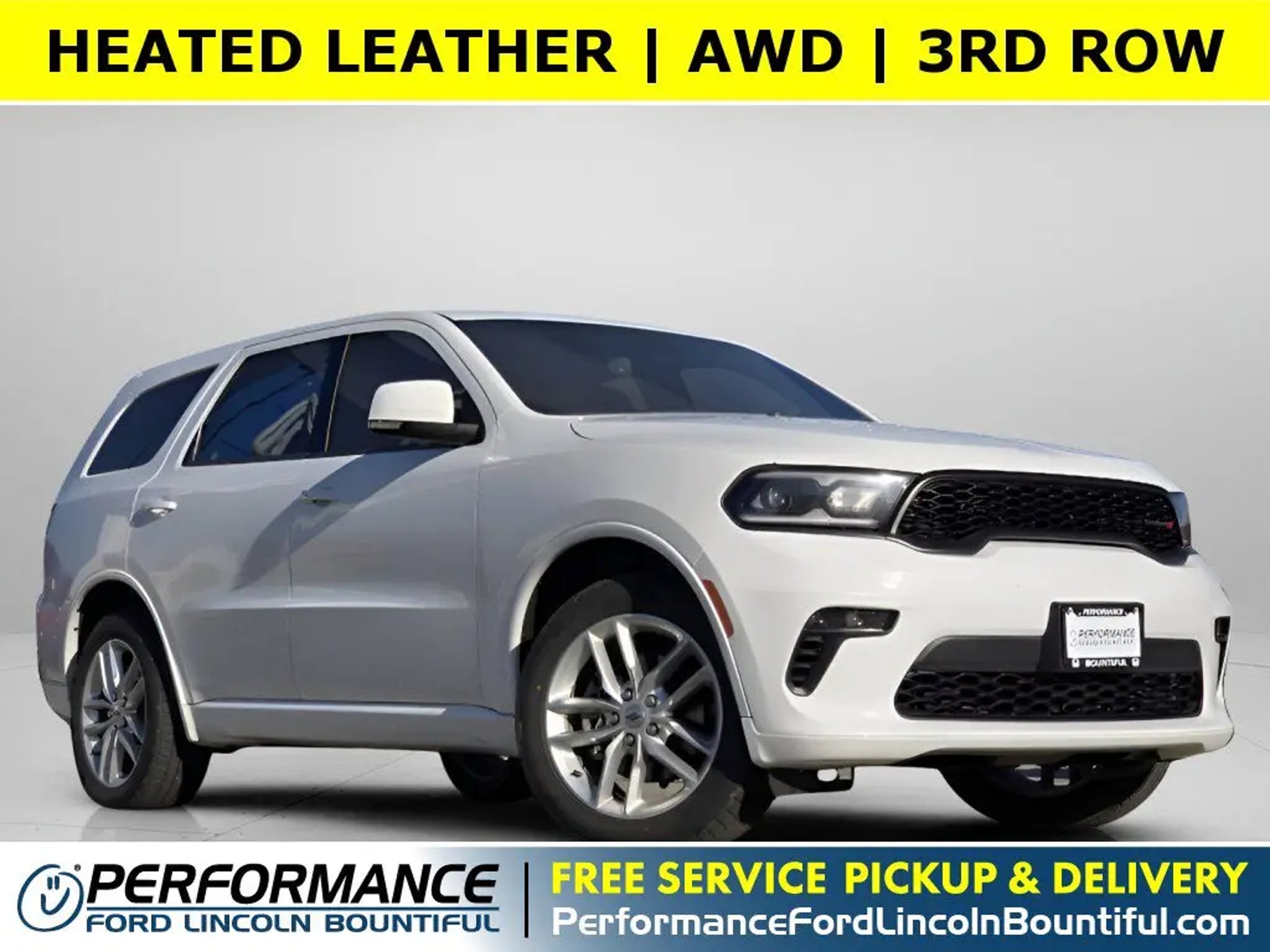 This *2021 Dodge Durango GT Plus* is loaded with convenient features like LEATHER, REMOTE START, POWER LIFTGATE, ANDROID AUTO, BACKUP CAMERA, APPLE CARPLAY, HEATED SEATS, BLUETOOTH, ALLOY-WHEELS, 3RD ROW SEATING, FOG LAMPS, POWER SEAT, Remote Entry, Usb.This stunning *2021 Dodge Durango GT Plus* features a beautiful *White* exterior and a *Black* interior.Compare, adjust and save your payment options on every vehicle in stock at: PerformanceFordBountiful.com*Technology and Entertainment Features Include:* Remote Engine Start, Infotainment System, Bluetooth Connection, Garage Door Opener, Voice Command Features, SiriusXM Satellite Radio, Electronic Messaging Assistance and Rear Heat / AC, Heated Steering Wheel, Heated Rear Seats, Automatic Climate Control, Memory Controlled Audio System, Compass, Memory Controlled Climate Control, Memory Seats, Power Lumbar Seats, Leather Wrapped Steering Wheel, Steering Wheel Audio Controls, Telescoping Wheel, Illuminated entry, Air Conditioning, Memory Mirrors, Rear Reading Lights, Auxiliary 12v Power Outlet, Driver Illuminated Vanity Mirror, Bucket Front Seats, Auto Dimming R/V Mirror, Center Console Storage, Rear Seat Center Armrest, Multi-zone Climate Control, Passenger Illuminated Visor Mirror, Outside Temperature Gauge, Split Folding Rear Seat, Tilt Steering Wheel, Center Armrest, Overhead Console, Vanity Mirrors, Trip Odometer, Rear Window Defroster, Reading Lights.*Safety and Economy Features Include:* Electronic Stability Control, Back-Up Camera, Security System, Integrated Turn Signal Mirrors, Brake Assist, Tire Pressure Monitoring System, Speed Sensitive Power Steering, Dual Air Bags, Auto-Dimming Door Mirrors, Knee AirBag, Delay-off headlights, ABS Brakes, Overhead airbag, Front anti-whiplash head restraints, Driver Front Side Impact Air Bag, Low tire pressure warning, Passenger Air Bag Sensor.This vehicle has an EPA rated fuel economy of 25.0 highway / 18.0 city1.Performance Ford Lincoln Bountiful proudly offer our customers at-home services including *Performance Valet*! When you purchase from Performance Ford Lincoln Bountiful, you will be eligible for *FREE Pickup & Delivery*^ for your future service appointments! We value your time and that's why want to give you the best buying and service experiences in Bountiful! Also, ask your product specialist about our home test drives and deliveries. Save time and money through our exclusive Performance Remote Services! Distance limitations may apply.Our dealership is conveniently located off Exit 315 on I-15, North of Salt Lake City. We proudly serve the communities of Bountiful, Centerville, North Salt Lake, Farmington, Salt Lake City, Kaysville, South Salt Lake, Layton, Canyon Rim, Millcreek, West Valley City, Murray, Holladay, Taylorsville, and Syracuse. As a proud member of the family-owned Performance Automotive Network, we have access to thousands of new and used vehicles. This gives us the ability to find the perfect vehicle to fit your needs and budget.*Need financing assistance?* Our strong, group-wide relationships with several lending institutions allow us to offer the most competitive rates! We will give you top-dollar for your trade or make you a cash offer if you'd prefer the convenience of selling directly.With our aggressive pricing strategy, most vehicles sell within the first few weeks, so please contact us ahead of time at * * to ensure the vehicle is still available and ready for your test drive.*We'll Put A Smile On Your Face! *1Based on EPA mileage ratings. Use for comparison purposes only. Your mileage will vary depending on driving conditions, how you drive and maintain your vehicle, etc.*Terms and conditions of warranties vary by brand and vehicle. See dealer for complete details or sign in to download a copy of your vehicle's warranty. Warranty may be restricted or denied if your vehicle or part has been modified, improperly maintained or removed.Delivery to door for Test Drive.
