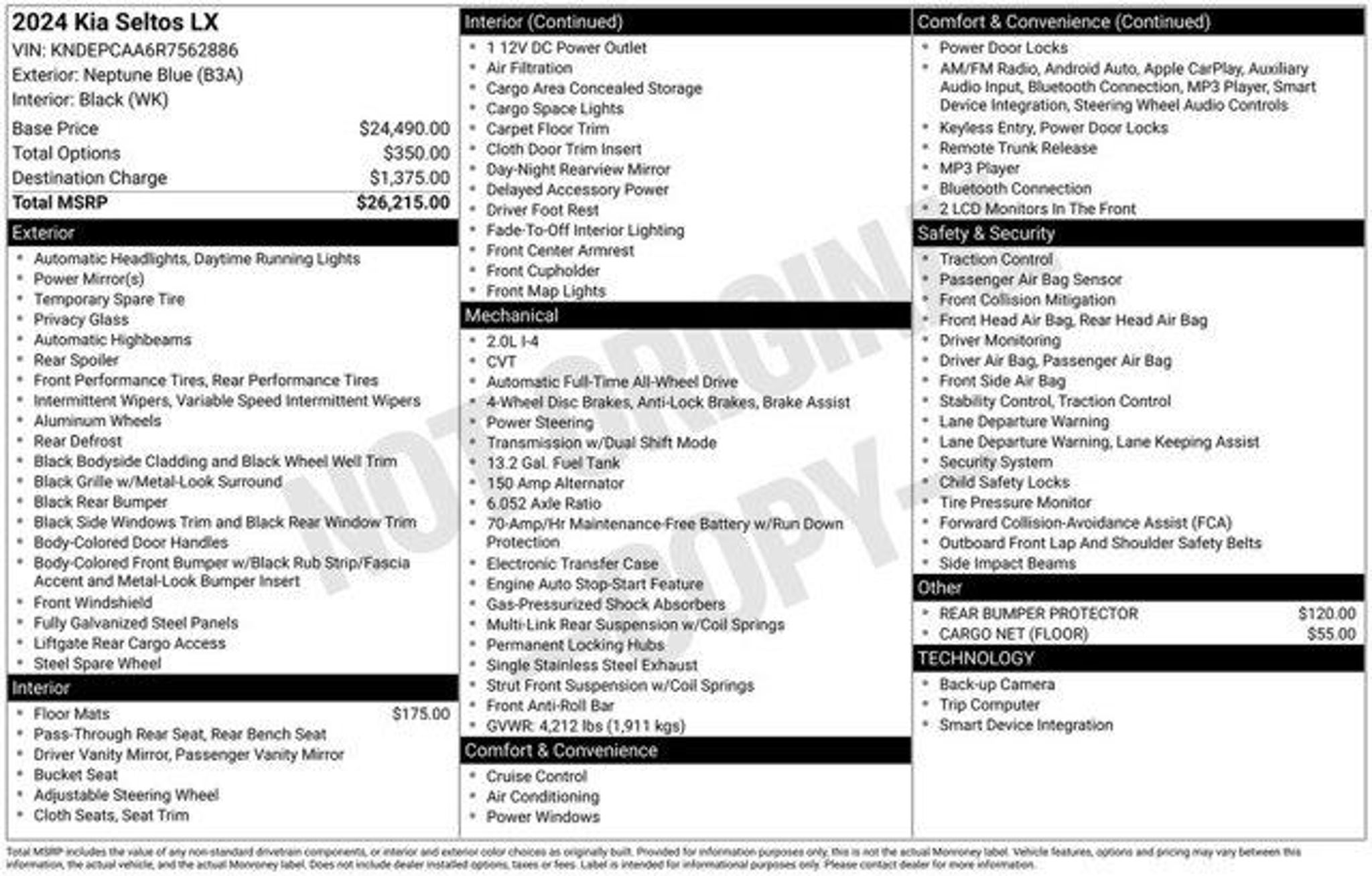Come see the difference at Columbia! LOCAL TRADE, APPLE CARPLAY, ANDROID AUTO. Certified.Neptune Blue 2024 Kia Seltos LXAWD CVT 2.0L I4 MPI27/31 City/Highway MPGKia Certified Pre-Owned Details: * Limited Warranty: 12 Month/12,000 Mile (whichever comes first) Platinum Coverage from certified purchase date * 165 Point Inspection * Includes Rental Car and Trip Interruption Reimbursement. 3 month Sirius trial subscription * Transferable Warranty * Vehicle History * Warranty Deductible: $50 * Powertrain Limited Warranty: 120 Month/100,000 Mile (whichever comes first) from original in-service date * Roadside AssistanceCall us today to set up a VIP appointment 860-228-2886.