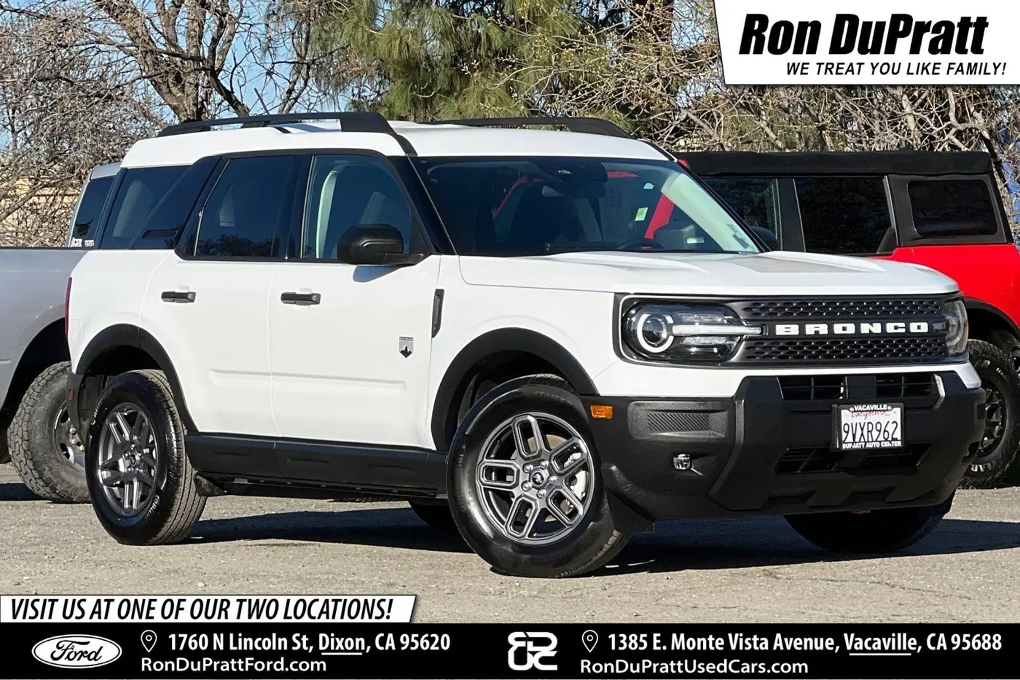 2025 Ford Bronco Sport Big Bend 4D Sport Utility 4WD CLOTH SEATS, KEY LESS ENTRY, PUSH TO START, BLUETOOTH, APPLE CARPLAY, ANDROID AUTO, WIRELESS CHARGING, HEATED SEATS, BACKUP/REARVIEW CAMERA, REAR PARK ASSIST, BLIND SPOT ALERT, LANE KEEP ASSIST, COLLISION ALERT, ADAPTIVE CRUISE CONTROL, ROOF RAILS, FACTORY WHEELS, Bronco Sport Big Bend, 4WD. Recent Arrival! RECENT SERVICE DEMO, QUALIFIES FOR ALL NEW CAR OFFERS. OFFER #1: MSRP $35,585 MINUS $1,000 DUPRATT FORD DISCOUNT, MINUS $2,000 RETAIL CUSTOMER CASH, MINUS $1,000 BONUS CUSTOMER CASHFOR A NET SALES PRICE $31,585.* OFFER #2: MSRP $35,585 MINUS $1,000 DUPRATT FORD DISCOUNT, MINUS $1,000 BONUS CUSTOMER CASH FOR A NET SALES PRICE OF $33,585 PLUS FINANCE INCENTIVES FOR WELL QUALIFIED BUYERS THRU FORD MOTOR CREDIT. 2.9% FOR 36 MONTHS, 3.9% 48 MONTHS, 4.9% 60 MONTHS, 5.9% 72 MONTHS, OR 6.9% FOR 84 MONTHS. SEE DEALER FOR DETAILS.* *ALL OFFERS EXPIRE MARCH 31, 2025, OFFERS CANNOT BE COMBINED. Odometer is 2335 miles below market average! Ron DuPratt Ford has been serving Northern California since 1956! Family owned and operated, we are one of the fastest growing Ford dealerships in Northern California, and specialize in affordable vehicles with an excellent selection for you to choose from. Don't take it from us - check out all of our satisfied customers: Google 4.4 stars, Edmunds 5 Star Dealer, Car Gurus 5 Star Dealer, and 12 time Ford President's Award winner. Serving Davis, Vacaville, Fairfield, Woodland, Winters, Elk Grove, West Sacramento, Roseville, Rocklin and Vallejo California. Our friendly staff is fun, approachable, and very knowledgeable. We are trained to help you find the right financing and appropriate vehicle that meets your needs.