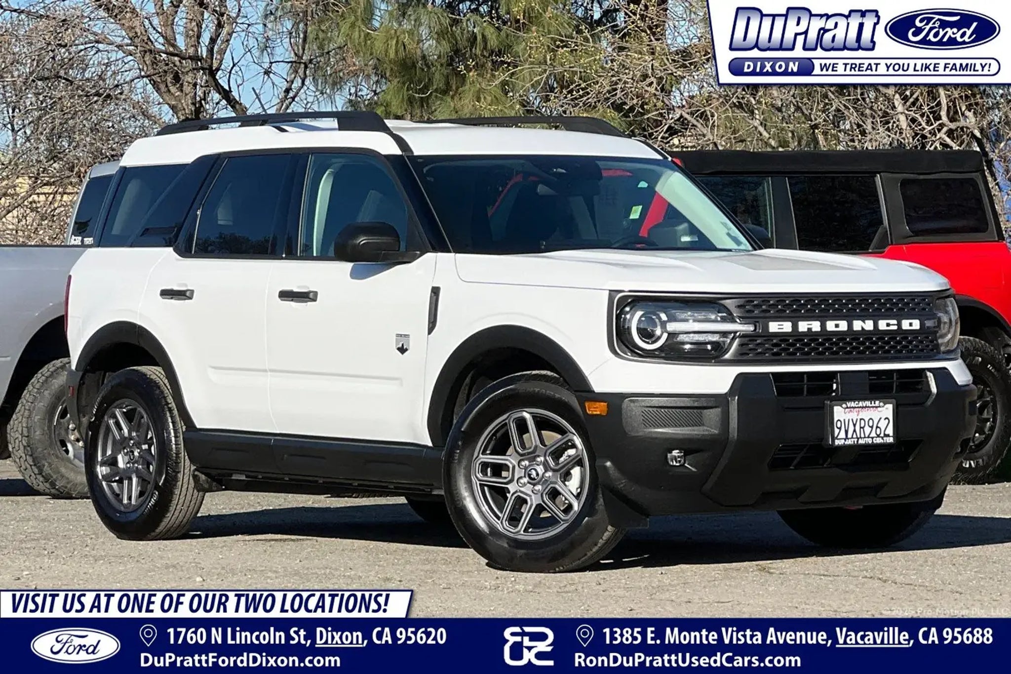 2025 Ford Bronco Sport Big Bend 4D Sport Utility 4WD CLOTH SEATS, KEY LESS ENTRY, PUSH TO START, BLUETOOTH, APPLE CARPLAY, ANDROID AUTO, WIRELESS CHARGING, HEATED SEATS, BACKUP/REARVIEW CAMERA, REAR PARK ASSIST, BLIND SPOT ALERT, LANE KEEP ASSIST, COLLISION ALERT, ADAPTIVE CRUISE CONTROL, ROOF RAILS, FACTORY WHEELS, Bronco Sport Big Bend, 4WD. Recent Arrival! RECENT SERVICE DEMO, QUALIFIES FOR ALL NEW CAR OFFERS. OFFER #1: MSRP $35,585 MINUS $1,000 DUPRATT FORD DISCOUNT, MINUS $2,000 RETAIL CUSTOMER CASH, MINUS $1,000 BONUS CUSTOMER CASHFOR A NET SALES PRICE $31,585.* OFFER #2: MSRP $35,585 MINUS $1,000 DUPRATT FORD DISCOUNT, MINUS $1,000 BONUS CUSTOMER CASH FOR A NET SALES PRICE OF $33,585 PLUS FINANCE INCENTIVES FOR WELL QUALIFIED BUYERS THRU FORD MOTOR CREDIT. 2.9% FOR 36 MONTHS, 3.9% 48 MONTHS, 4.9% 60 MONTHS, 5.9% 72 MONTHS, OR 6.9% FOR 84 MONTHS. SEE DEALER FOR DETAILS.* *ALL OFFERS EXPIRE MARCH 31, 2025, OFFERS CANNOT BE COMBINED. Odometer is 2335 miles below market average! Ron DuPratt Ford has been serving Northern California since 1956! Family owned and operated, we are one of the fastest growing Ford dealerships in Northern California, and specialize in affordable vehicles with an excellent selection for you to choose from. Don't take it from us - check out all of our satisfied customers: Google 4.4 stars, Edmunds 5 Star Dealer, Car Gurus 5 Star Dealer, and 12 time Ford President's Award winner. Serving Davis, Vacaville, Fairfield, Woodland, Winters, Elk Grove, West Sacramento, Roseville, Rocklin and Vallejo California. Our friendly staff is fun, approachable, and very knowledgeable. We are trained to help you find the right financing and appropriate vehicle that meets your needs.