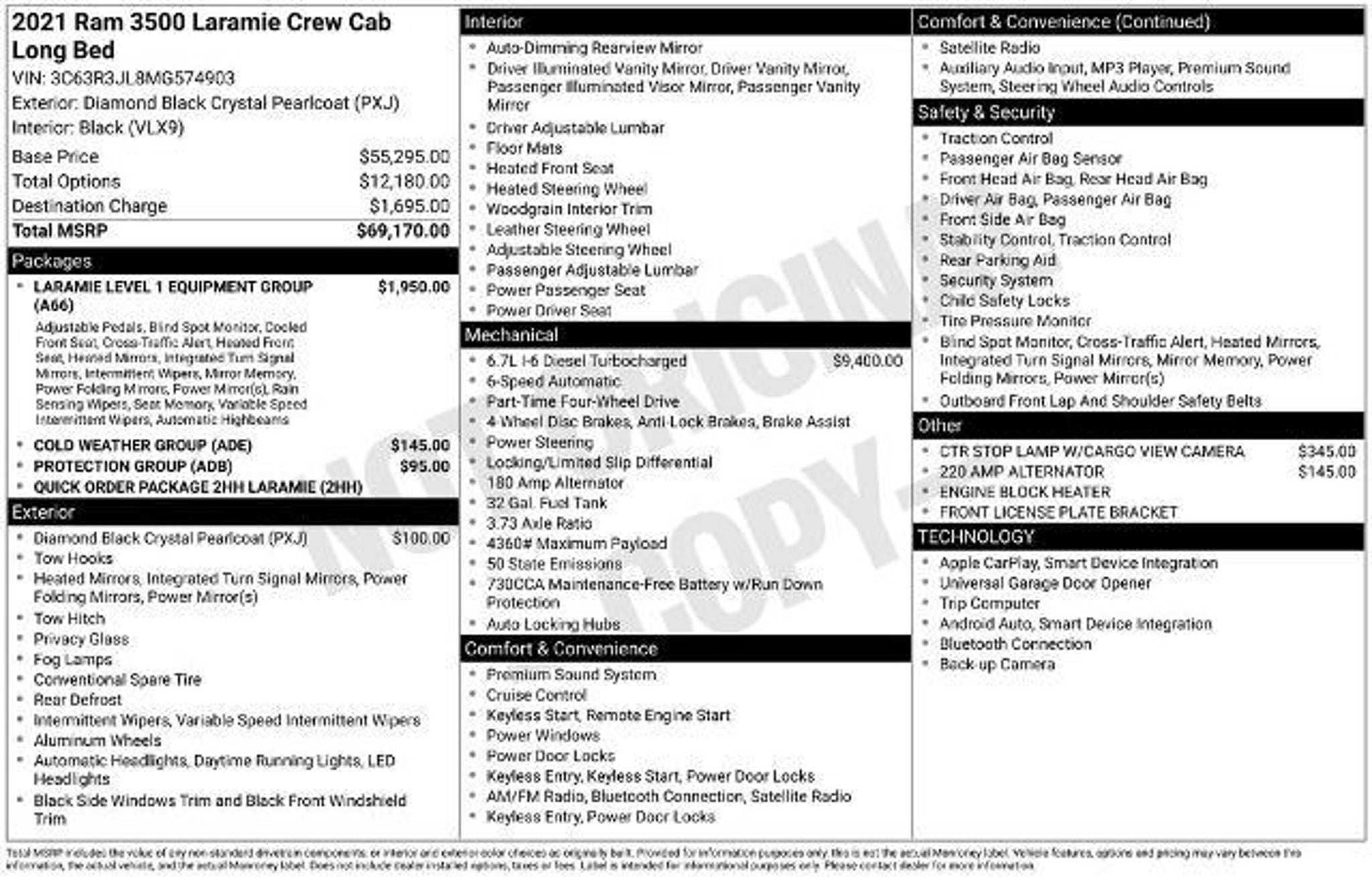 **One Owner**Accident Free**2021**RAM**3500**Laramie**Heated & Ventilated Front Seats**Heated Steering Wheel**Grille Guard** Take command of our diesel-powered One Owner, Accident Free 2021 RAM 3500 Laramie Crew Cab 4X4 with the Level 1 Equipment Group that's ruggedly handsome in Diamond Black Crystal Pearlcoat! Fueled by a High Output TurboCharged 6.7 Liter Cummins Diesel 6 Cylinder generating 400hp connected to a heavy-duty 6 Speed Automatic transmission to handle massive torque and power. Appreciate the stellar Four Wheel Drive capability of up to 35,100lbs along with a smooth, comfortable ride that shows off the southwestern style of our Laramie Longhorn's prominent wheels, chrome grille, an aftermarket front bumper with built in grille guard, running boards, and sculpted stance. Settle into Laramie's upscale heated/ventilated power seats with premium leather and grip the heated steering wheel with audio controls. Admire the beauty of the open-pore Barnwood and brushed aluminum accents. Get acquainted with the Uconnect? multimedia with an 8.4-inch touchscreen display featuring integrated voice command with Bluetooth?, full-color Navigation, and available satellite radio. Other conveniences include available WiFi, remote ignition, dual-zone automatic climate control, and auto-dimming mirrors. Drive with peace of mind in this brawny RAM. It has ABS, front/rear park assist, a backup camera, front seat and side curtain airbags, stability/traction control, and a tire-pressure monitoring system. Step up to strength and luxury with our 3500 Laramie. Save this Page and Call for Availability. We Know You Will Enjoy Your Test Drive Toward Ownership!