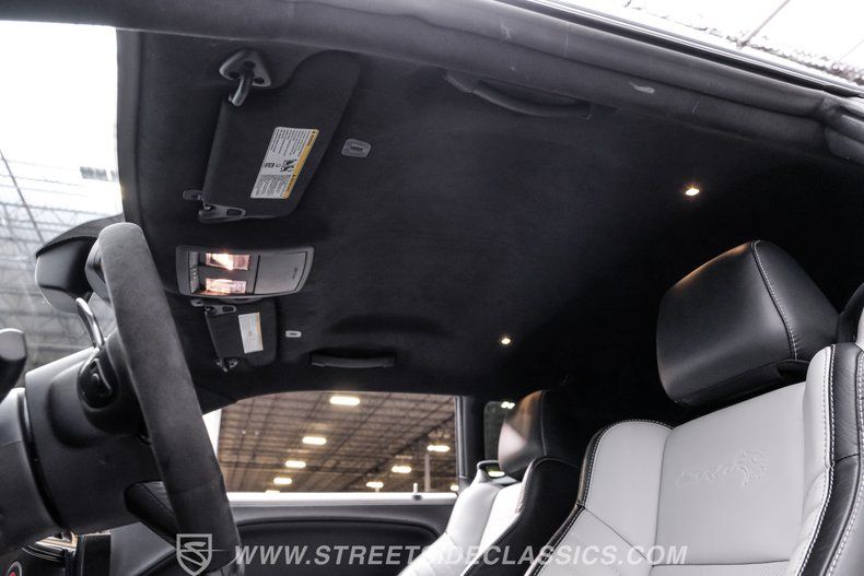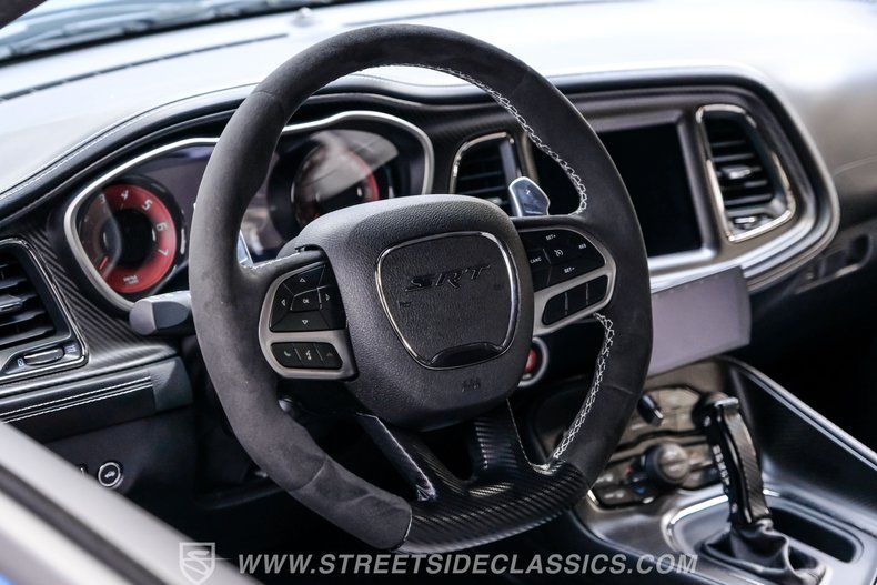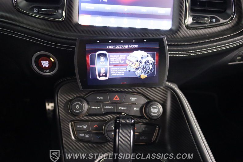 All these options are amazing, but the owner wanted even more, ordering Mopar Direct Connection dealer upgrades that include most significantly the Redeye Pre-Stage and Stage ll performance upgrades that consists of an engine that pumps out an incredible 840hp on pump gas (885hp on 100 octane) with a whopping 787-foot pounds of torque. The package also came with a Direct Connection 5" Wifi tuner with hi-def touchscreen, 180-degree performance thermostat, 17 PSI boost, 3.17-inch Hellephant pully and a full Dodge warranty. Additional dealer items on this car include color matched valve covers, Mopar ABS control cover, Mopar valve shield and custom Hellcat Redeye logos in the engine bay. The suspension system was upgraded with an Eibach Pro lowering kit including front upper control arms, BMR adjustable rear camber arms, BMR rear upper control arms, Ferrada CM1 20x12 zero offset wheels in matte graphite grey with gloss black lip, 4-inch gloss black spike lugs and Michelin 335/30 ZR20 Pilot Sport tires. Other premium upgrades include Black Trackhawk quad exhaust tips, ZL1 front and rear tow strap hooks, custom Hellcat logo lift plugs, custom Hellcat Redeye rear facia logo, Lux tinted tail lights and side reflectors, custom billboard and racing stripes wrap by Precision Wraps, custom Hurst pistol grip shifter with billet, black and carbon fiber details and matching stainless footrest and E-brake pedal covers.