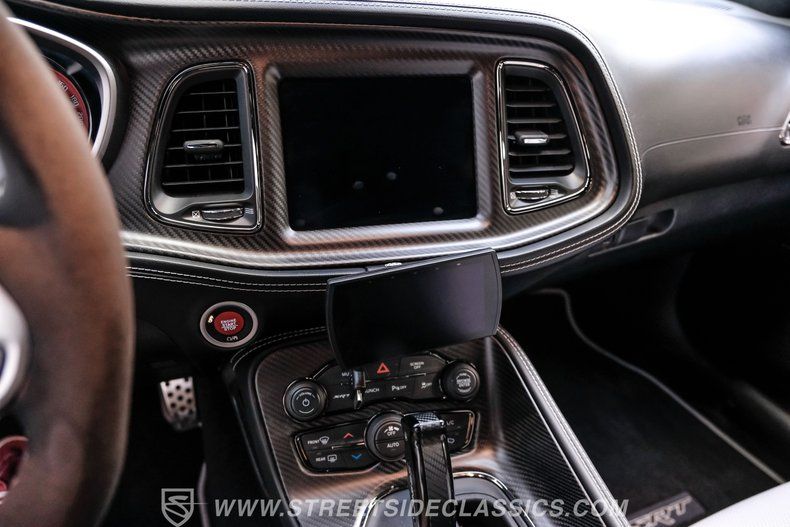 This Challenger SRT8 Hellcat Redeye has the rare Jailbreak package that added additional $18,595 to the price of the car. The Jailbreak option includes a 220-mph speedometer, widebody fender flares, high-performance engine controller, widebody competition suspension, Jailbreak badging and a SRT power chiller. Other options include Laguna leather seats with Hellcat logo that are ventilated and have memory settings, Technology Group, Driver Convenience Group, Harmon Kardon Audio Group with 18-speaker Prem Audio and trunk-mounted subwoofer, suede headliner, 8-speed TorqueFlite automatic transmission, 3.09 rear axle ratio, black hood pin kit, satin chrome exterior badging, satin black SRT Performance spoiler, SRT Widebody stripe, SRT Alcantra steering wheel with red LED logo, 4C NAV with 8.4-inch touch screen display, 20" x 11" Warp-Speed satin carbon wheels, real carbon fiber interior accents and blue brake calipers.