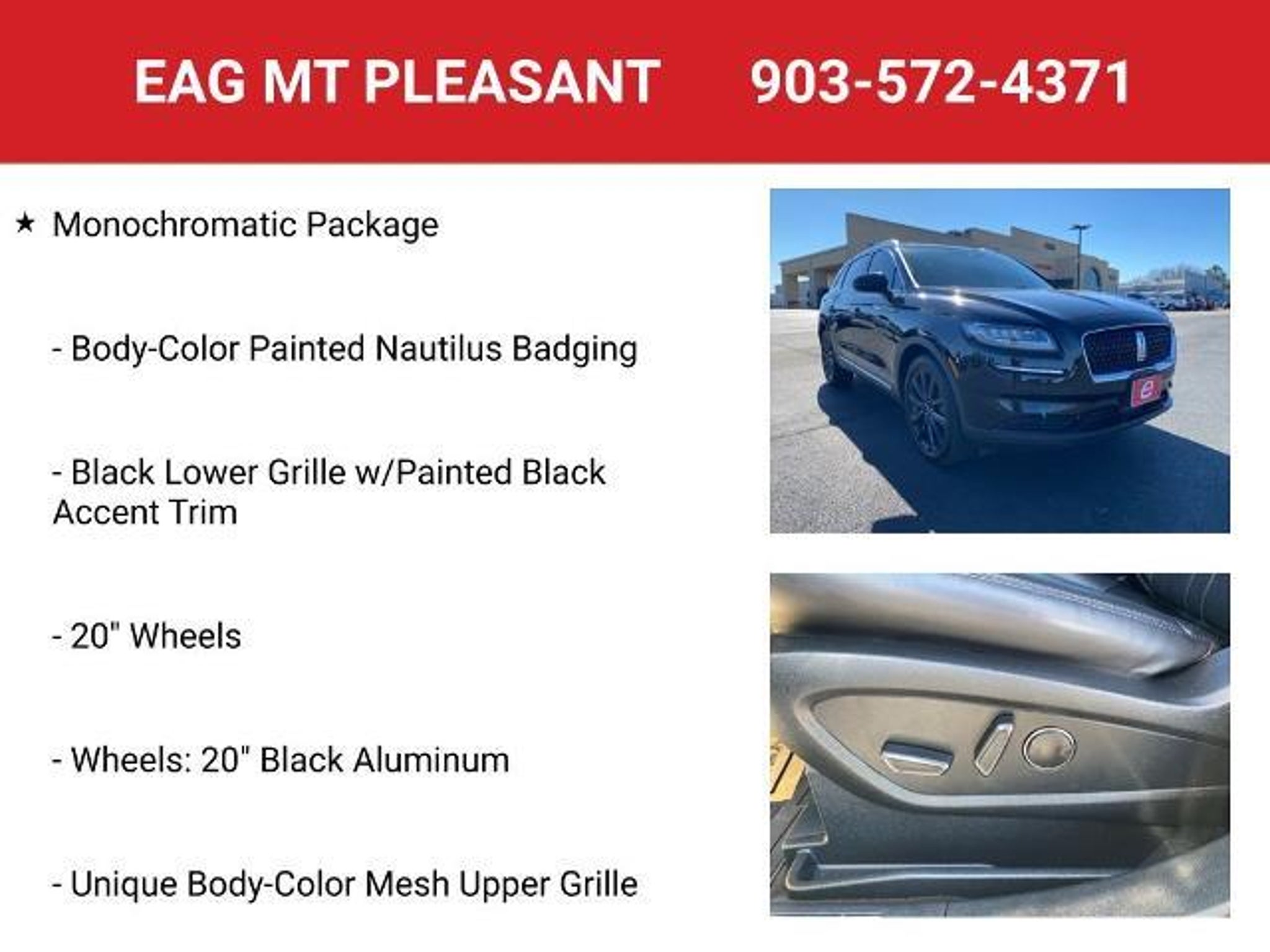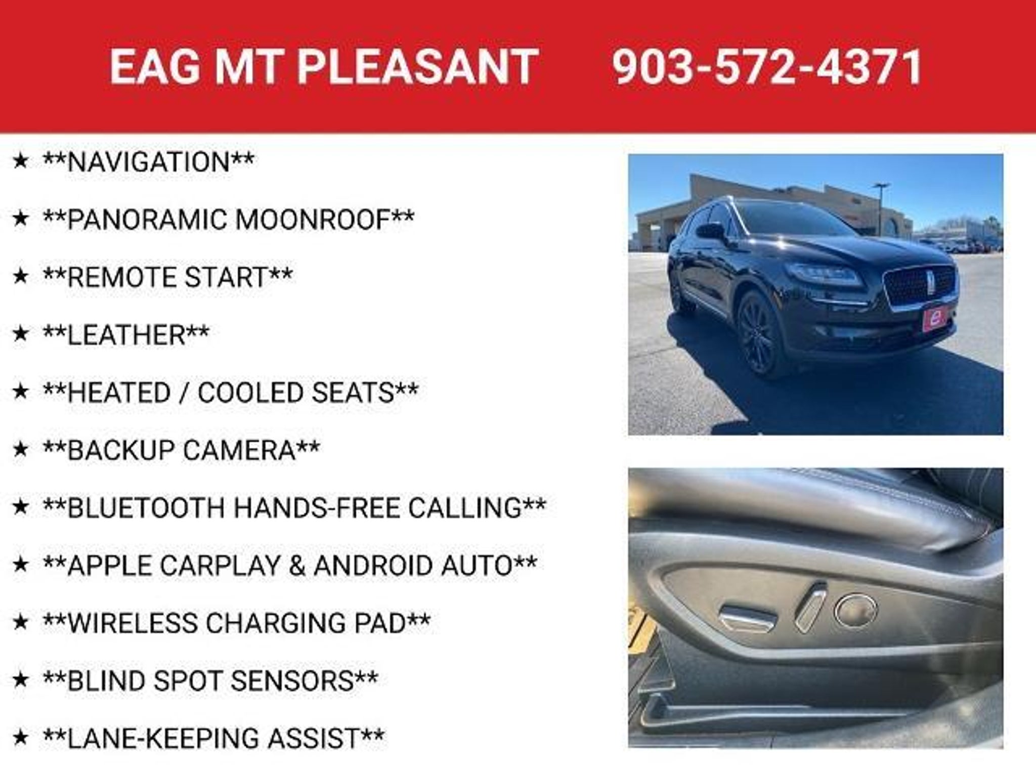**NAVIGATION**, **PANORAMIC MOONROOF**, **REMOTE START**, **LEATHER**, **HEATED / COOLED SEATS**, **BACKUP CAMERA**, **BLUETOOTH HANDS-FREE CALLING**, **APPLE CARPLAY & ANDROID AUTO**, **WIRELESS CHARGING PAD**, **BLIND SPOT SENSORS**, **LANE-KEEPING ASSIST**, Monochromatic Package. Recent Arrival! Infinite Black 2021 Lincoln Nautilus Reserve FWD 8-Speed Automatic 2.0L Turbocharged 21/26 City/Highway MPG This vehicle is located at EAG Mt. Pleasant but can be made available upon request. The price listed does not include tax, title, license, or documentation fees ($225). We are located just west of Titus Regional Medical Center on the I-30 frontage road.