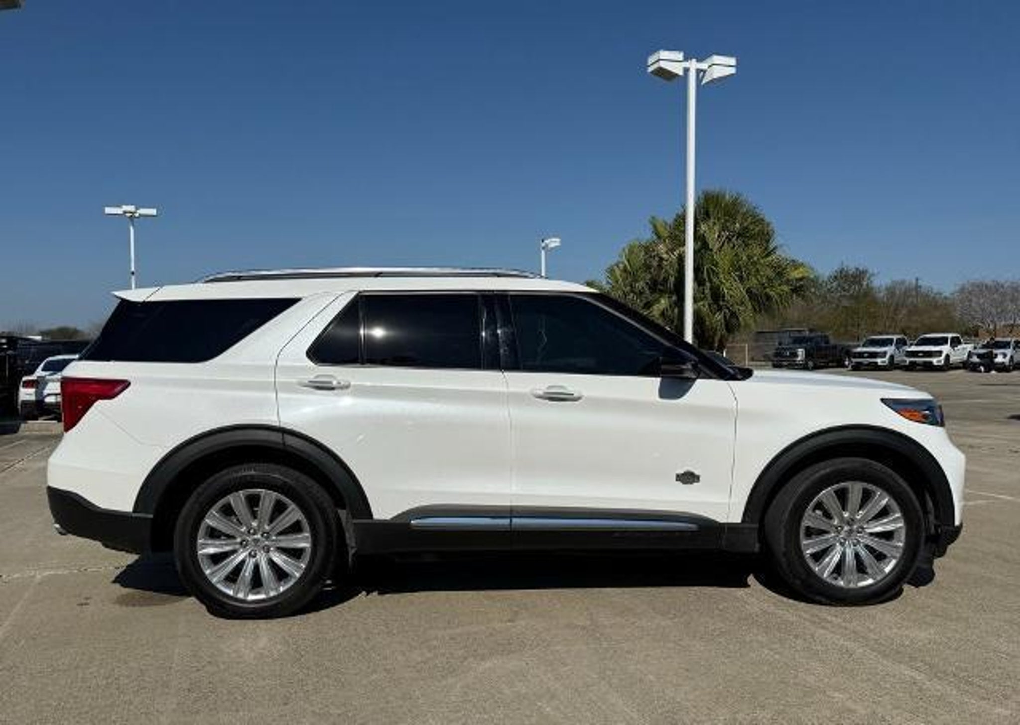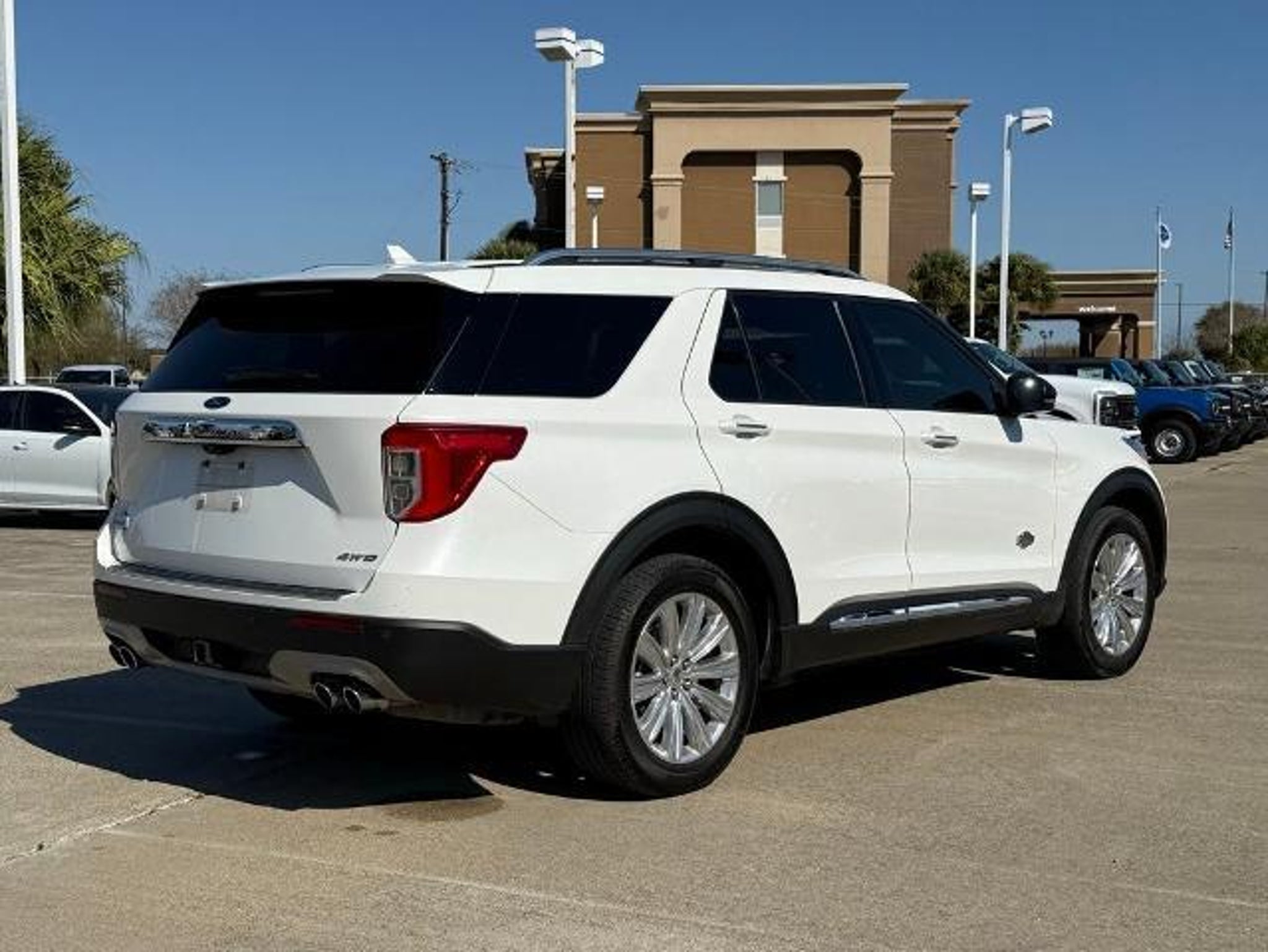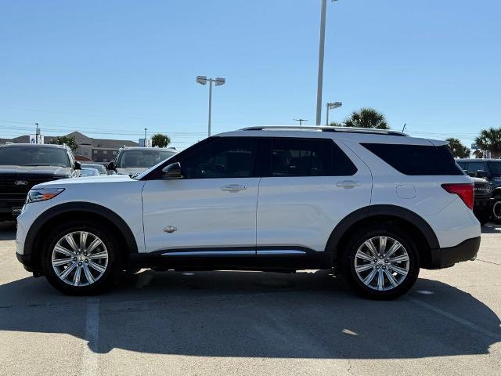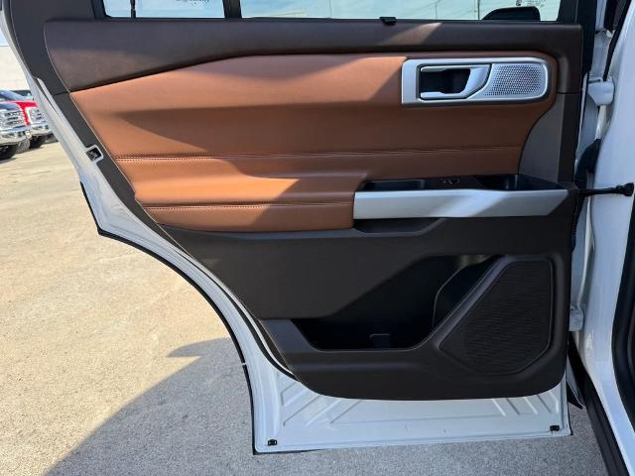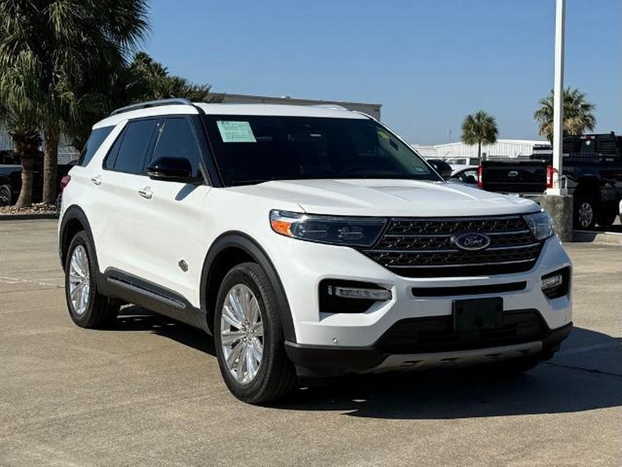Star White Metallic Tri-Coat 2024 Ford Explorer King Ranch 4WD 10-Speed Automatic 3.0L EcoBoost V6 4WD. This vehicle comes equipped with the following features and options: Class IV Trailer Tow Package, Equipment Group 701A, Technology Package (10.1 LCD Capacitive Portrait Touchscreen and 2 Additional Speakers), 4WD, 12 Speakers, 3.31 Non-Limited-Slip Rear Axle Ratio, 360-Degree Camera Credit, 3rd row seats: bench, 4-Wheel Disc Brakes, 4G LTE Wi-Fi Hotspot Credit, ABS brakes, Air Conditioning, Alloy wheels, AM/FM radio: SiriusXM, Auto High-beam Headlights, Auto-dimming door mirrors, Auto-dimming Rear-View mirror, Automatic temperature control, Brake assist, Bumpers: body-color, Cargo Area Management System, Compass, Delay-off headlights, Driver door bin, Driver vanity mirror, Dual front impact airbags, Dual front side impact airbags, Electronic Stability Control, Emergency communication system: SYNC 3 911 Assist, Exterior Parking Camera Rear, FordPass Connect, Four wheel independent suspension, Front anti-roll bar, Front Bucket Seats, Front Center Armrest, Front dual zone A/C, Front fog lights, Front reading lights, Fully automatic headlights, Garage door transmitter, Genuine wood dashboard insert, Heated door mirrors, Heated front seats, Heated rear seats, Heated steering wheel, Illuminated entry, Knee airbag, Leather steering wheel, Low tire pressure warning, Memory seat, Mesa Del Rio Lthr Htd/Vent Sport Capt's Chairs, Navigation System, Occupant sensing airbag, Outside temperature display, Overhead airbag, Overhead console, Panic alarm, Passenger door bin, Passenger vanity mirror, Power door mirrors, Power driver seat, Power Liftgate, Power passenger seat, Power steering, Power windows, Radio data system, Radio: B&O Sound System by Bang & Olufsen, Rain sensing wipers, Rear air conditioning, Rear anti-roll bar, Rear reading lights, Rear window defroster, Rear window wiper, Remote keyless entry, Reverse Brake Assist Credit, Security system, Speed control, Speed-sensing steering, Speed-Sensitive Wipers, Split folding rear seat, Spoiler, Steering wheel memory, Steering wheel mounted audio controls, SYNC 3 Communications & Entertainment System, SYNC 3/Apple CarPlay/Android Auto, Tachometer, Telescoping steering wheel, Tilt steering wheel, Traction control, Trip computer, Turn signal indicator mirrors, Twin Panel Moonroof, Variably intermittent wipers, Ventilated front seats, Voice-Activated Touchscreen Navigation System, and Wheels: 20 10-Spoke Aluminum w/KR Center Cap.