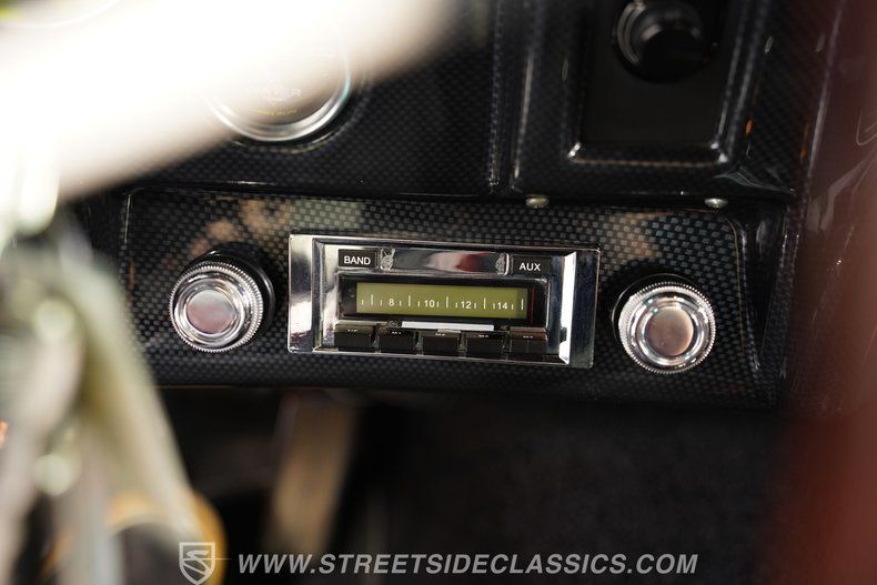 Inside, we find a nicely redone black cloth interior. A pair of late-model bucket seats equipped with headrests provides far more comfort and support than the ones they replace. A beautiful power-assisted, three-spoke woodgrain steering wheel sits ahead of a six-pod AutoMeter Carbon Fiber Ultra-Lite gauge set featuring a 160 mph speedometer, mounted in a custom carbon-fiber housing. A retro-style AM/FM/AUX head unit and Vintage Air HVAC controls look original enough not to disrupt the throwback vibe, while providing more soundtrack options and air conditioning (respectively). A B&M shifter completes the racy vibe.