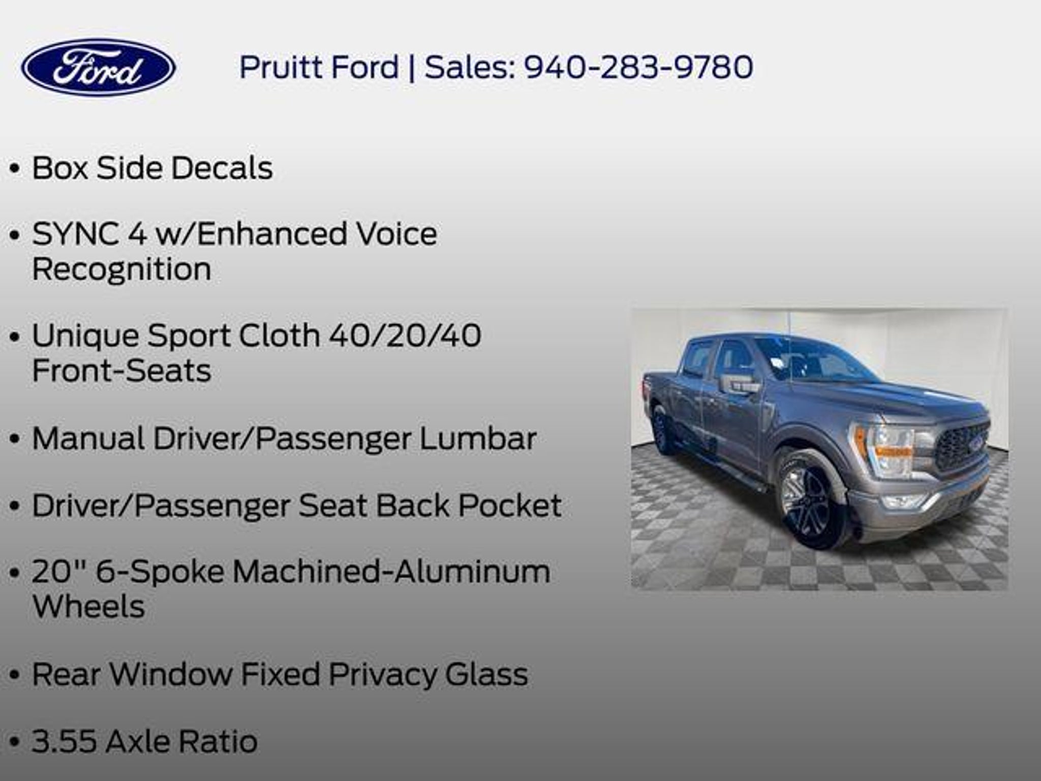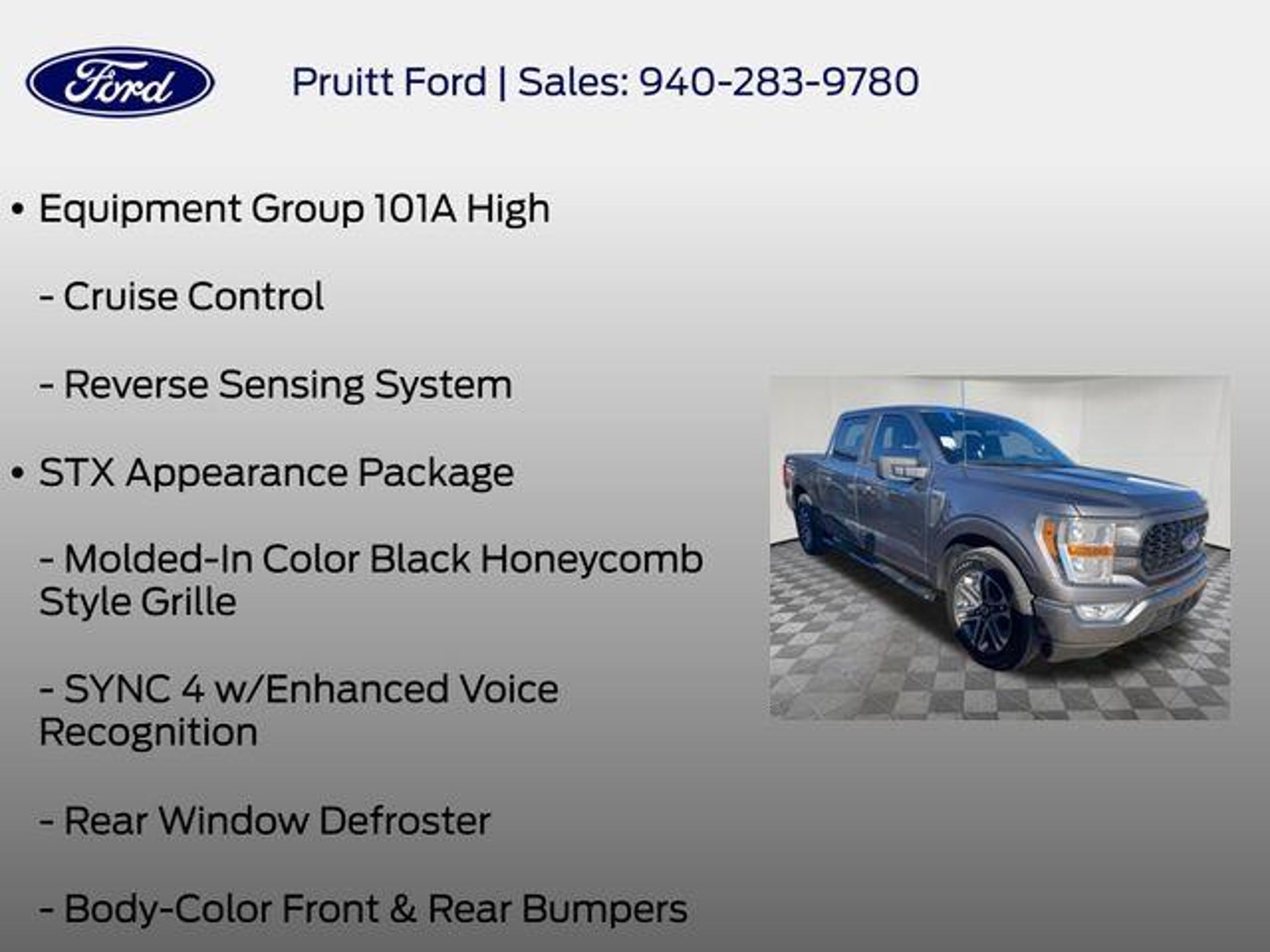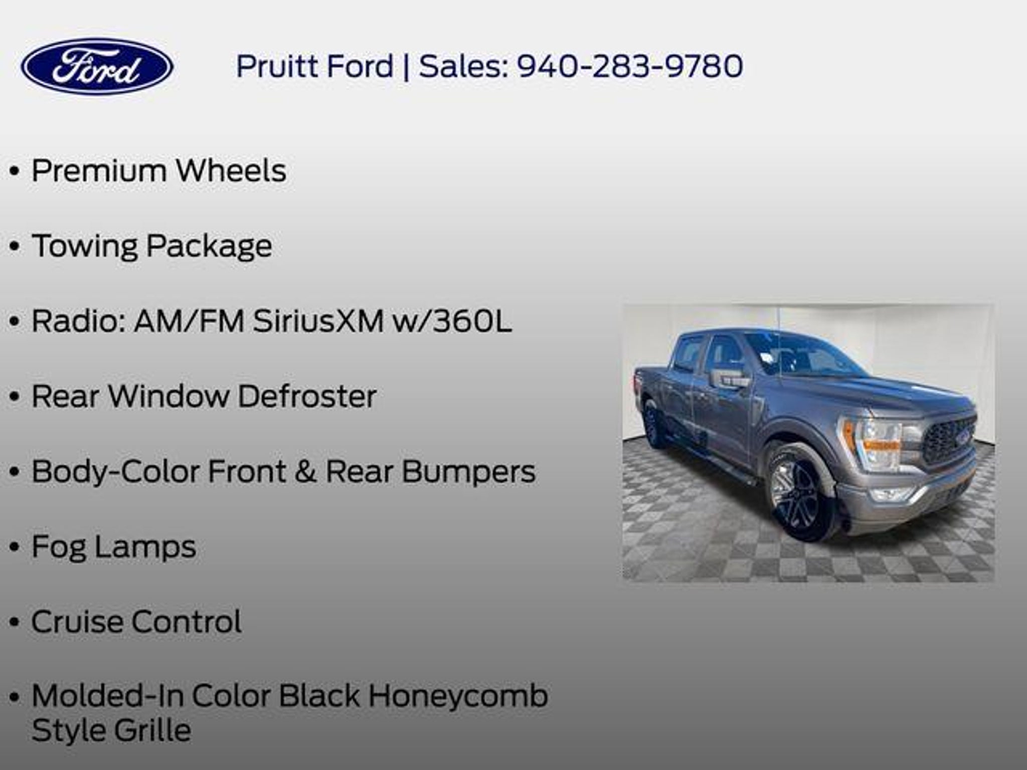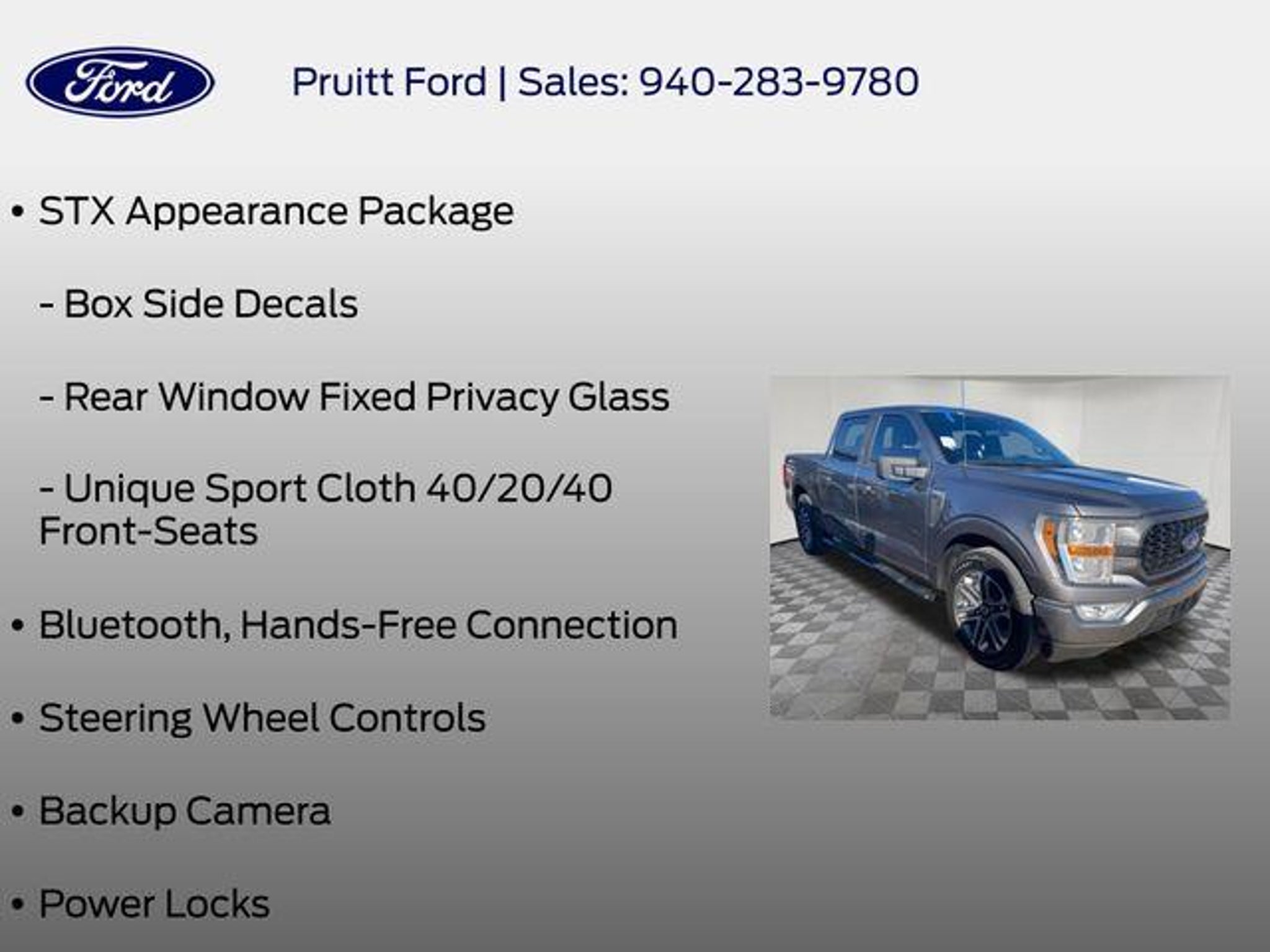 Elevate your driving experience with this exceptional 2022 Ford F-150 XL. Boasting a powerful 2.7L V6 EcoBoost engine, this truck delivers exceptional performance and efficiency, with an impressive 20 city/26 highway MPG. - Bluetooth, Hands-Free Connection - Steering Wheel Controls - Backup Camera - Power Locks - Power Windows - Premium Wheels - Towing Package - STX Appearance Package - SYNC 4 with Enhanced Voice Recognition - Unique Sport Cloth 40/20/40 Front-Seats - 20 6-Spoke Machined-Aluminum Wheels - Rear Window Fixed Privacy Glass - Fog Lamps - Cruise Control Designed for both work and play, this F-150 XL is equipped with a host of features that make it a versatile and capable companion. The STX Appearance Package adds a bold, sporty look with its molded-in color black honeycomb grille, body-color bumpers, and eye-catching box side decals. Inside, the cabin offers exceptional comfort and convenience, with features like SYNC 4 with enhanced voice recognition, allowing you to stay connected and in control. The unique sport cloth front seats provide all-day support, while the driver and passenger seat back pockets offer additional storage. For those with towing needs, the Class IV trailer hitch receiver and smart trailer tow connector make it easy to haul your gear with confidence. The rear window defroster and fixed privacy glass add an extra layer of convenience and privacy. Whether you're tackling tough jobs or hitting the open road, this 2022 Ford F-150 XL is ready to take on the challenge. Experience the perfect blend of power, capability, and technology that will elevate your driving experience. Visit our showroom today and let us demonstrate why this F-150 is the perfect choice for you.