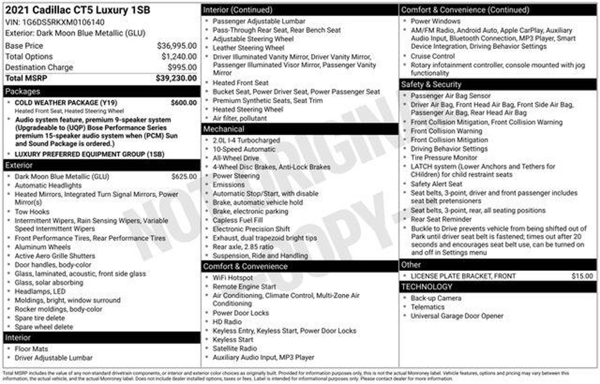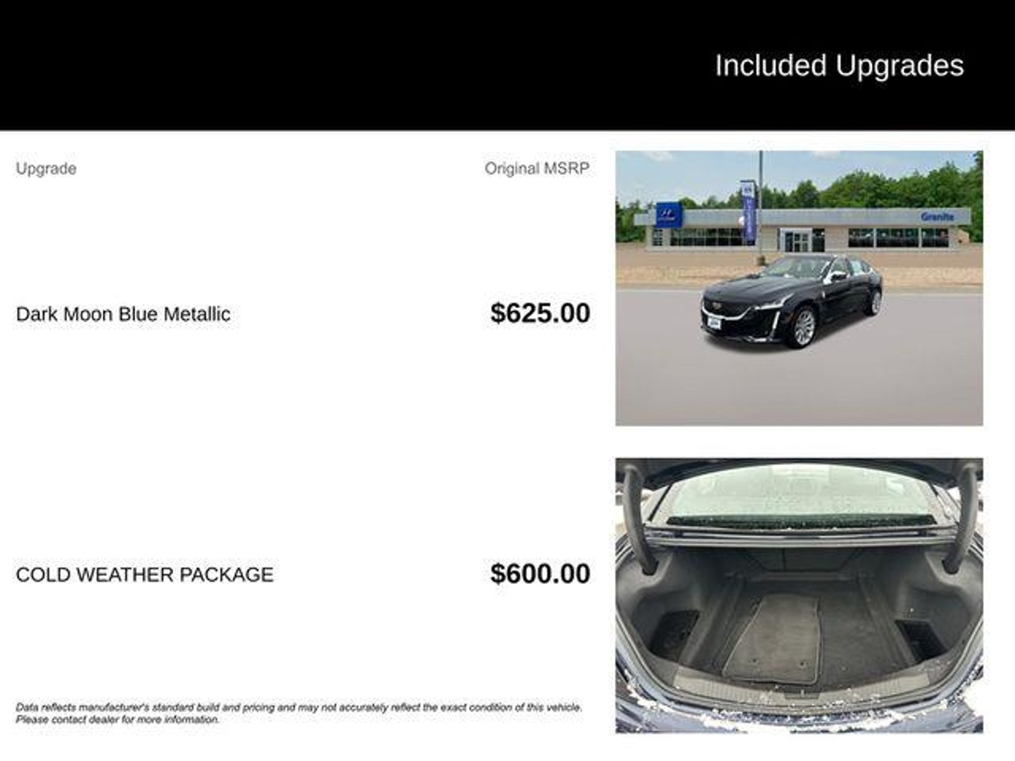 The 2021 Cadillac CT5 Luxury AWD blends refined styling with confident all-wheel-drive performance for a premium driving experience in every season. Its sleek exterior lines are matched by a thoughtfully crafted interior designed for comfort, technology, and everyday sophistication. Powered by a responsive turbocharged engine, the CT5 delivers smooth acceleration and upscale comfort in a modern luxury sedan. Features You'll Love: * Heated steering wheel * Heated front driver and passenger seats * Dual-zone automatic climate control with humidity sensor 2021 Cadillac CT5 Luxury AWD Dark Moon Blue Metallic 10-Speed Automatic 2.0L I4 Turbocharged DOHC 16V LEV3-SULEV30 237hp 21/31 City/Highway MPG Certification Program Details: SIGNATURE CERTIFIED POWERED BY ALLSTATE! INCLUDES A RIGOROUS 70 POINT VEHICLE SAFETY INSPECTION AND A COMPLIMENTARY 6 MONTH - 6,000 MILES LIMITED WARRANTY Awards: * JD Power Automotive Performance, Execution and Layout (APEAL) Study, Initial Quality Study
