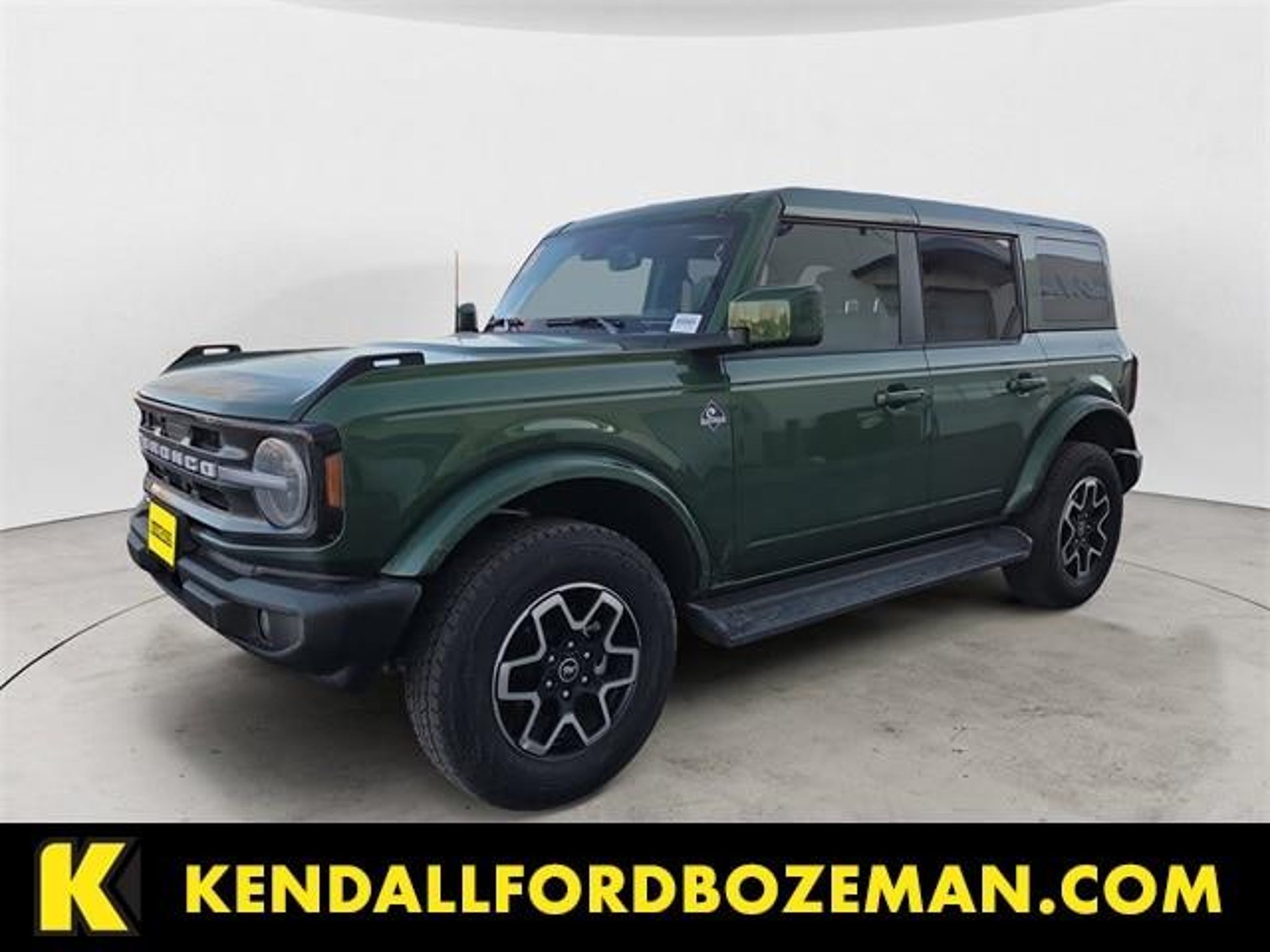 CERTIFIED PRE OWNED! Clean CARFAX! ONE OWNER! 18 Bright Machined Aluminum Wheels, 3.73 Axle Ratio, 4-Wheel Disc Brakes, 7 Speakers, ABS brakes, Air Conditioning, Alloy wheels, AM/FM radio: SiriusXM with 360L, AM/FM Stereo, Auto High-beam Headlights, Auto-dimming Rear-View mirror, Automatic temperature control, Brake assist, Compass, Connected Navigation, Delay-off headlights, Driver door bin, Driver vanity mirror, Dual front impact airbags, Dual front side impact airbags, Electronic Stability Control, Emergency communication system: 911 Assist, Equipment Group 312A Mid Package, Exterior Parking Camera Rear, Front anti-roll bar, Front Bucket Seats, Front Center Armrest, Front dual zone A/C, Front fog lights, Front License Plate Bracket, Front reading lights, Front wheel independent suspension, Fully automatic headlights, Hard Top Sound Deadening Headliner, Heated door mirrors, Heated front seats, Heated Leather-Trimmed/Vinyl Bucket Seats, Heated steering wheel, Illuminated entry, Integrated roll-over protection, Internet access capable: FordPass Connect, Leather Shift Knob, Low tire pressure warning, Navigation system: Connected Navigation, Occupant sensing airbag, Outside temperature display, Overhead airbag, Overhead console, Painted Hard Top, Panic alarm, Passenger door bin, Passenger vanity mirror, Power door mirrors, Power driver seat, Power passenger seat, Power steering, Power windows, Radio data system, Rear seat center armrest, Rear-Window Defroster & Washer, Remote keyless entry, Security system, SiriusXM w/360L, Speed control, Split folding rear seat, Steering wheel mounted audio controls, SYNC 4, Tachometer, Telescoping steering wheel, Tilt steering wheel, Traction control, Trip computer, Variably intermittent wipers, Voltmeter. WE ARE OPEN FOR ALL YOUR SALES AND SERVICE NEEDS! Green Metallic 2025 Ford Bronco Outer Banks 4WD 10-Speed Automatic 2.3L EcoBoost I-4 Recent Arrival! CALL 406-344-7783 TO SCHEDULE YOUR TEST DRIVE TODAY! At Kendall Ford of Bozeman, we sell new Ford cars, used cars, and more! With Kendall Auto Protection, qualified used cars have passed a multi-point safety and mechanical inspection and are covered under our exclusive Kendall Auto Protection warranty. Our Finance Center handles car loans and the trade-in value of your current car. Stop by our Service Center for services like oil changes and brake services. We also carry Ford parts, OEM parts, and aftermarket parts. Shop at Kendall Ford of Bozeman today! We'll deliver your vehicle to your front door, driveway, or