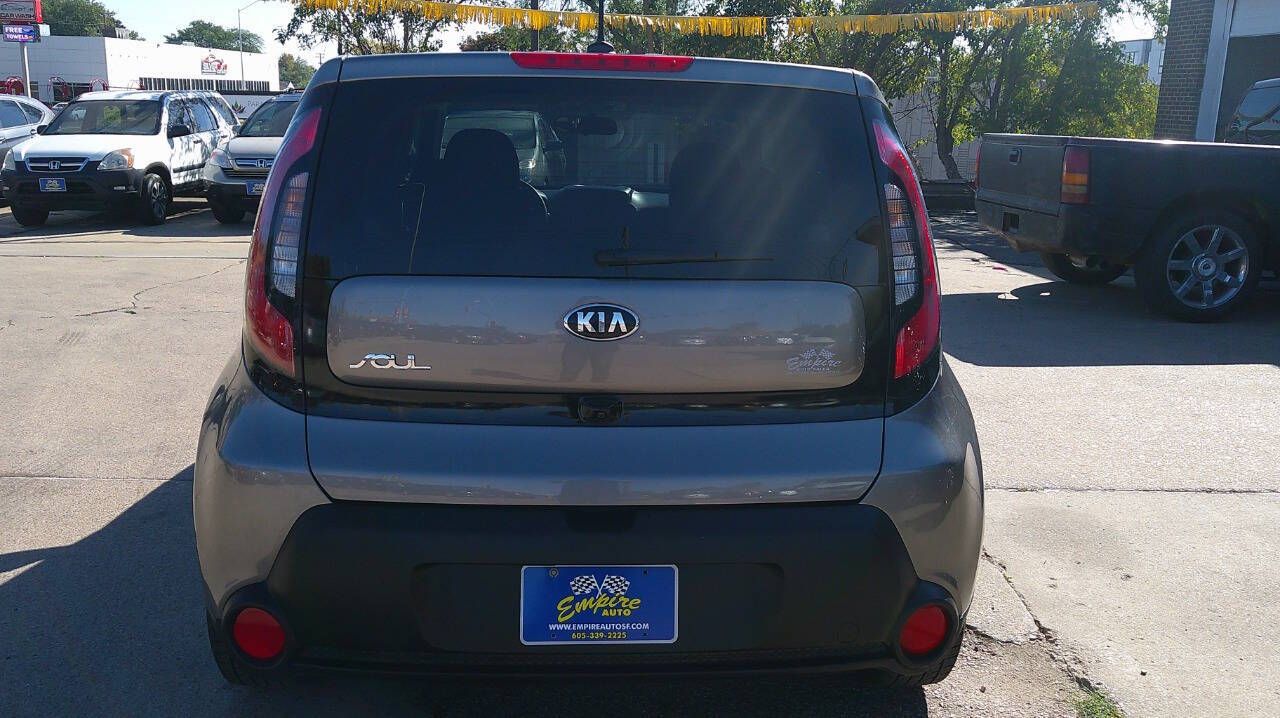 Very low miles and clean 2-owner Kia Soul For a great value. 90 day warranty and all service work is done. Hurry in today! The front windshield is in excellent condition. The paint is in great shape and condition. No dings are visible on this vehicle. The tires are slightly worn with about 75% of tread life left. The interior was well-maintained and is extra clean. The exterior was well-maintained and is extra clean. The engine is functioning properly and has no issues. The transmission shifts very smoothly. This vehicle has no previous collision damage. The brakes are in great condition. The battery is in excellent condition. A non smoker previously owned the car. A mini spare tire is included with this vehicle. This vehicle comes with a spare key. Be an Empire buyer today! empireautosf.com 605 339-2225