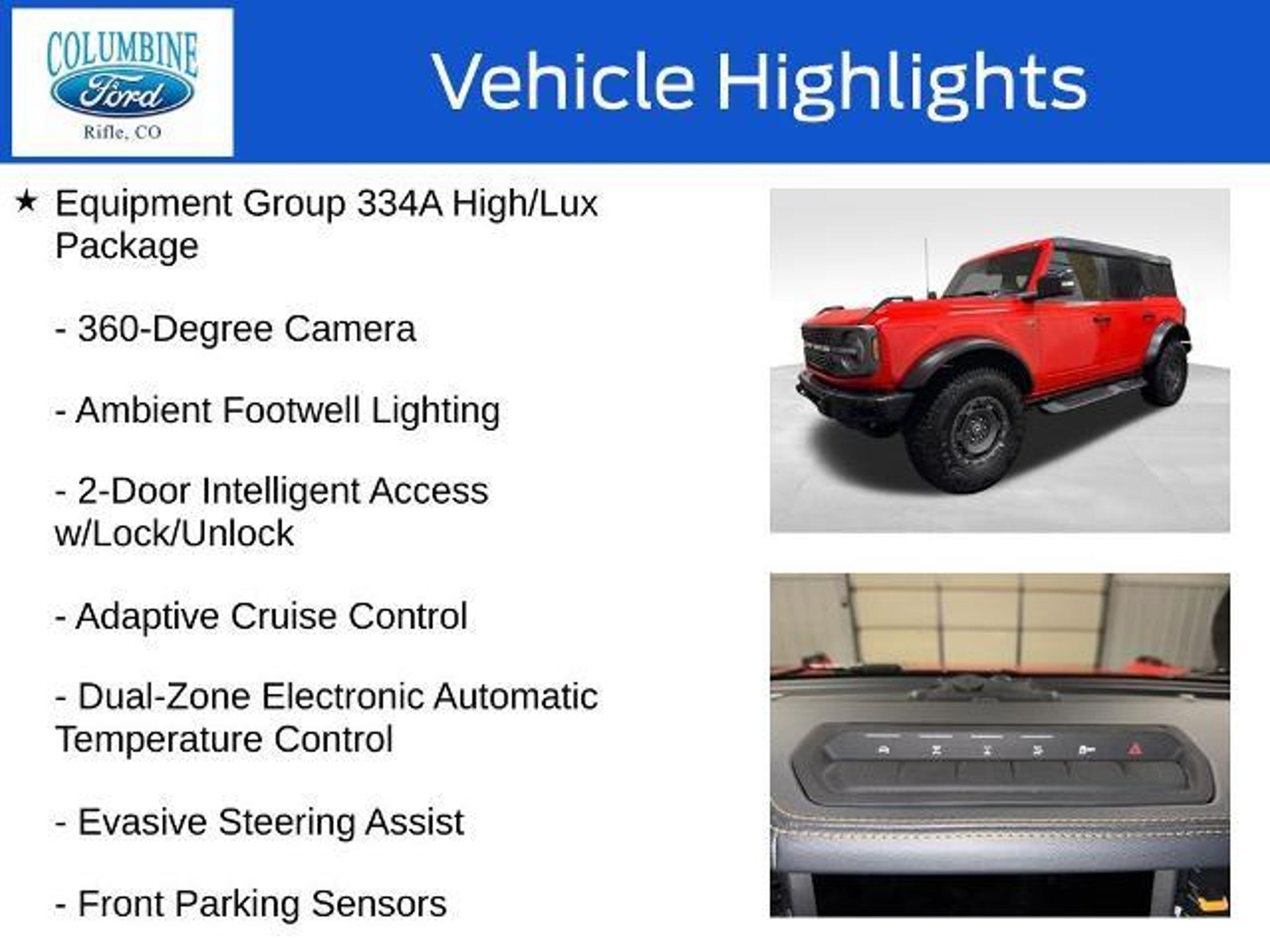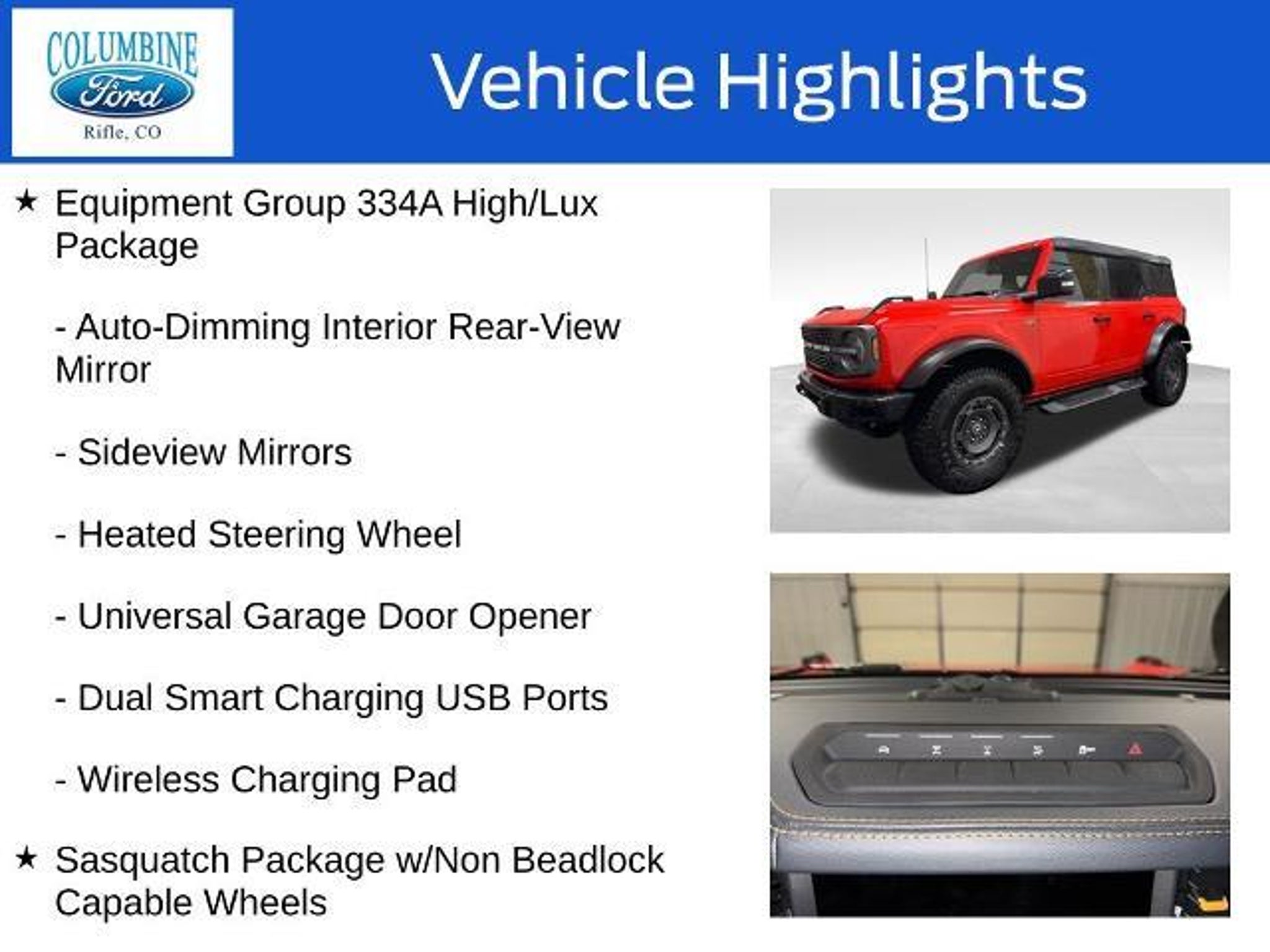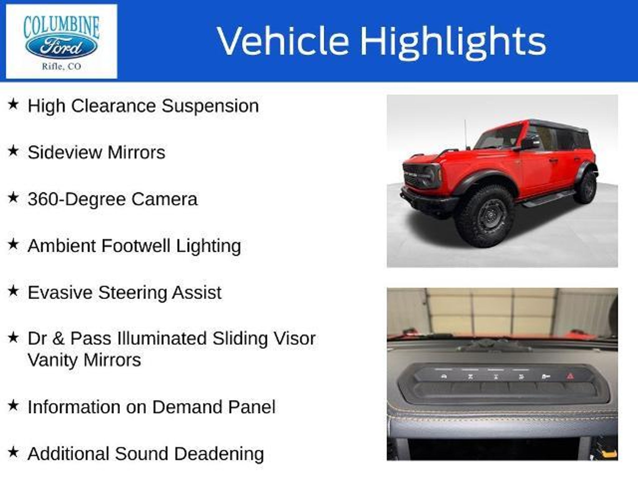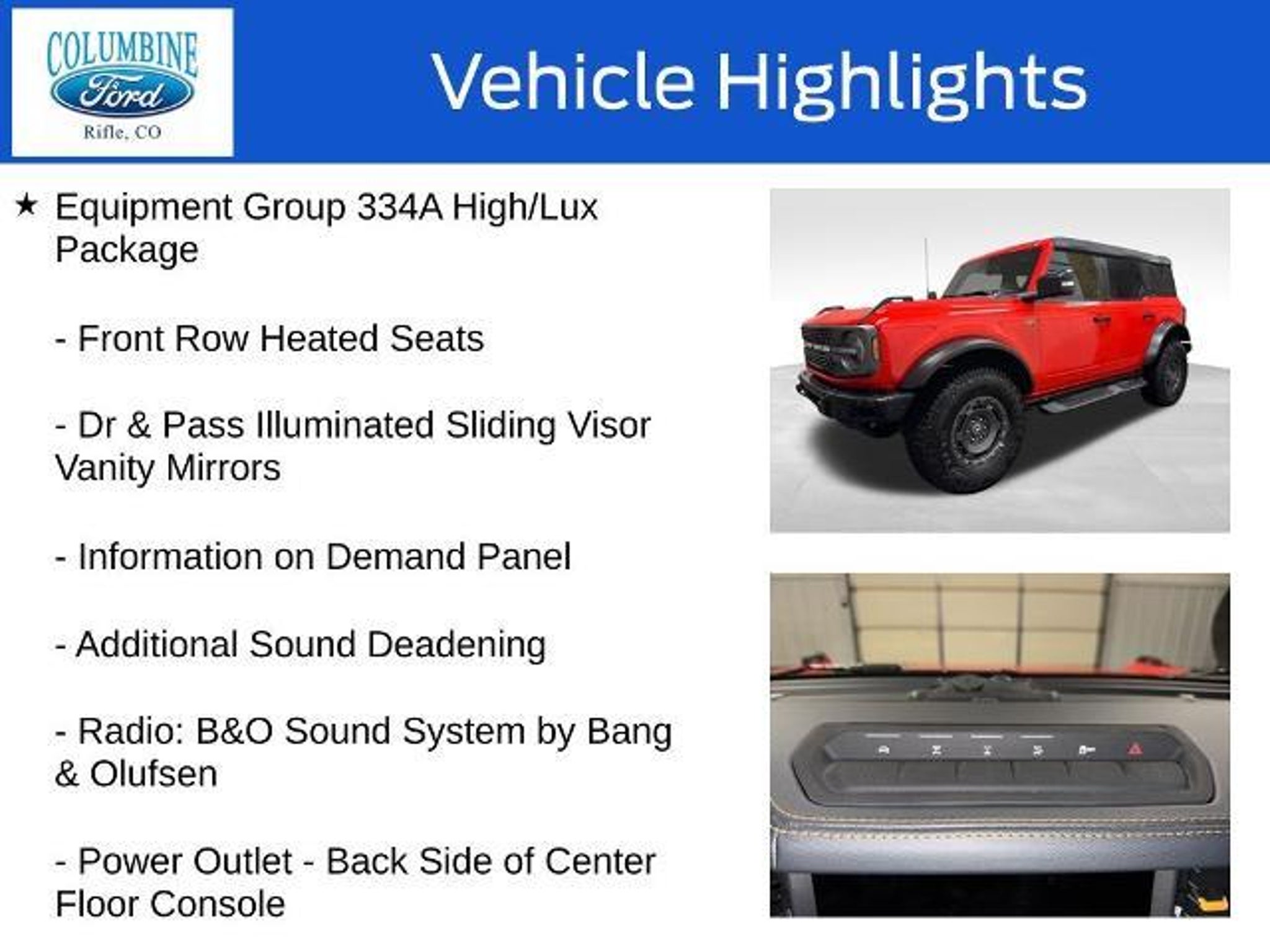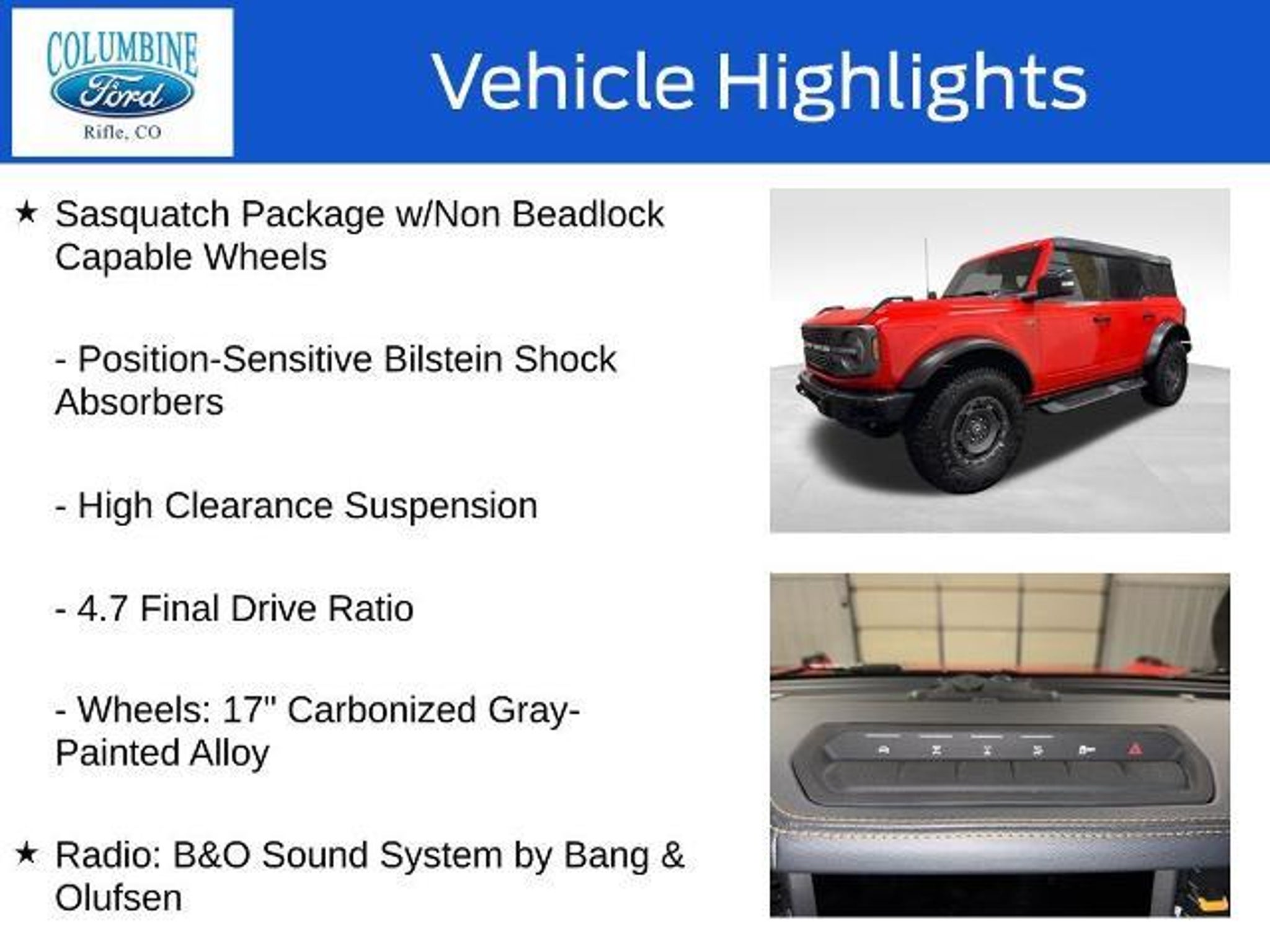 Unlock your next adventure with this stunning 2024 Ford Bronco Badlands. Boasting a bold, distinctive style and exceptional off-road capabilities, this Bronco is the perfect companion for your thirst for exploration. - Raptor-Style Running Board w/Rock Rail - Door Storage Bags - Front & Rear Floor Liners w/o Carpet Floor Mats - Radio: B&O Sound System by Bang & Olufsen - Dual-Zone Electronic Automatic Temperature Control - Power Outlet - Back Side of Center Floor Console - Universal Garage Door Opener - Position-Sensitive Bilstein Shock Absorbers - 2-Door Intelligent Access w/Lock/Unlock - Front Parking Sensors - Rear Parking Sensors - Adaptive Cruise Control - High Clearance Fender Flares - High Clearance Suspension Powered by a thrilling 2.7L EcoBoost V6 engine and equipped with a rugged 4WD system, this Bronco Badlands is ready to take you off the beaten path. Conquer any terrain with confidence, thanks to the Sasquatch Package's advanced 4x4 system, high-clearance suspension, and aggressive all-terrain tires. Elevate your driving experience with the High/Lux Package, which includes a premium B&O sound system, dual-zone climate control, and a host of advanced safety and convenience features. From the wireless charging pad to the 360-degree camera, every detail has been thoughtfully designed to enhance your time behind the wheel. Whether you're seeking an adrenaline-fueled adventure or a comfortable daily driver, this 2024 Ford Bronco Badlands is the perfect blend of capability and refinement. Experience the thrill of the open road and the freedom to explore with this exceptional SUV. At Columbine Ford, we're proud to be Western Colorado's most trusted dealership and a multi-year recipient of Ford's prestigious President's Award for exceptional customer satisfaction. Our team is committed to honesty, transparency, and delivering a hassle-free buying experience on every visit. Whether you're shopping new or pre-owned, you'll find unbeatable service, western Colorado's largest selection of vehicles, competitive pricing, and a dealership that truly cares. Visit us at 2828 Railroad Ave., Rifle, CO 81650 or call 970-625-1680. Experience the award-winning difference at Columbine Ford?where Colorado comes to drive.