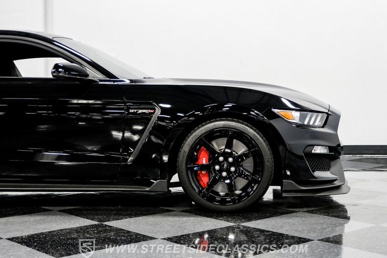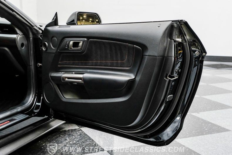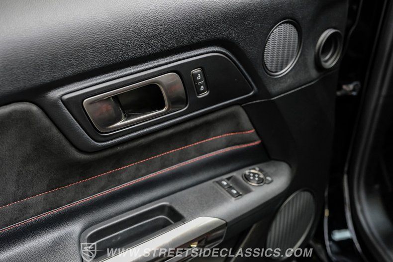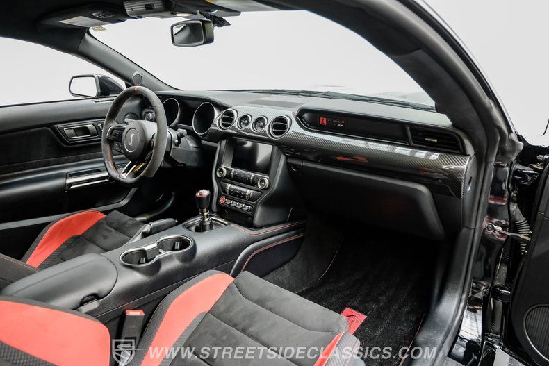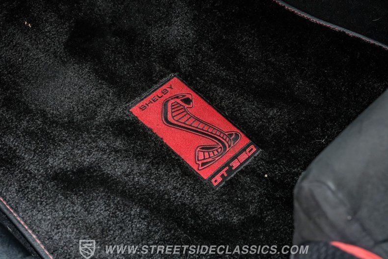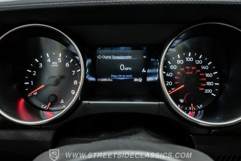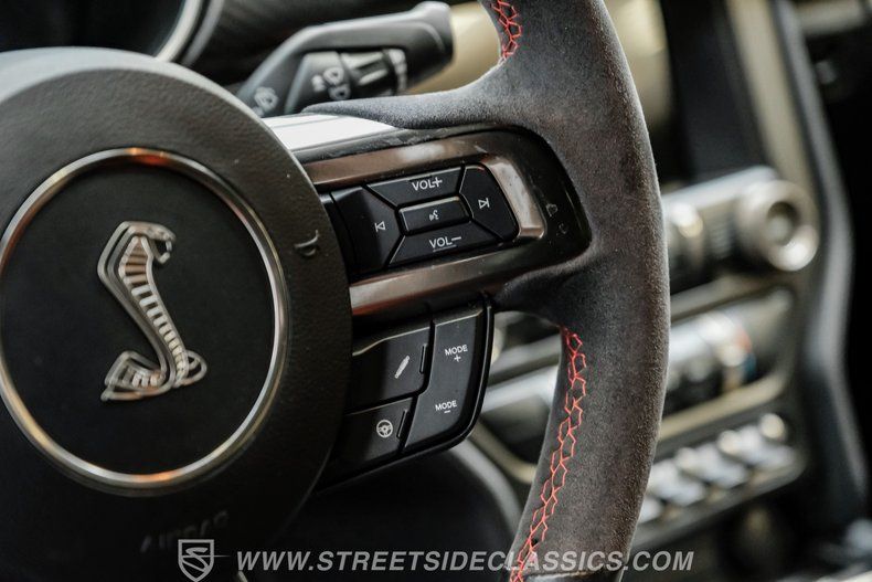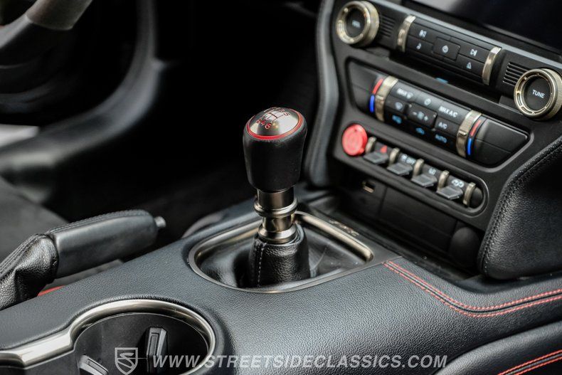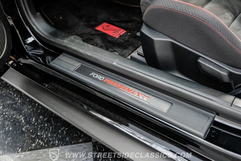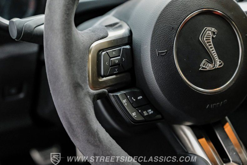 Inside, we find a well-appointed like-new stock interior. Recaro Suede Sport bucket seats hold both the driver and passenger comfortably in place, regardless of the number of G-forces at play. The rear seat has been deleted for added weight savings, while a three-spoke Alcantara-padded steering wheel features thumb controls and that unmistakable Cobra emblem center cap. This car is equipped with a Technology Package that includes features such as a Blind Spot Information System with cross-traffic alert. A voice-activated touchscreen infotainment system operates a twelve-speaker Bang and Olufsen AM/FM/Bluetooth/Satellite sound system, complete with navigation and a backup camera. Carbon fiber trim and red accents are subtle reminders that this car is race-ready whenever you are.