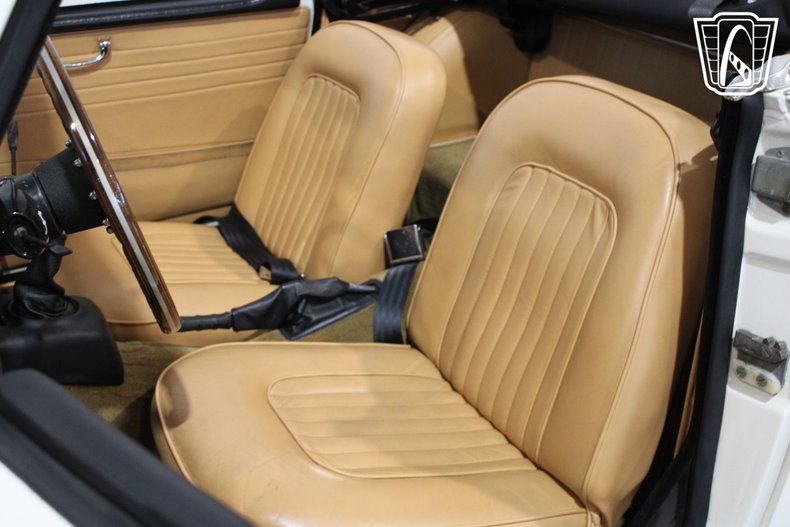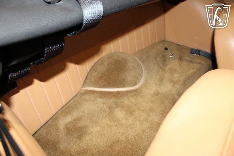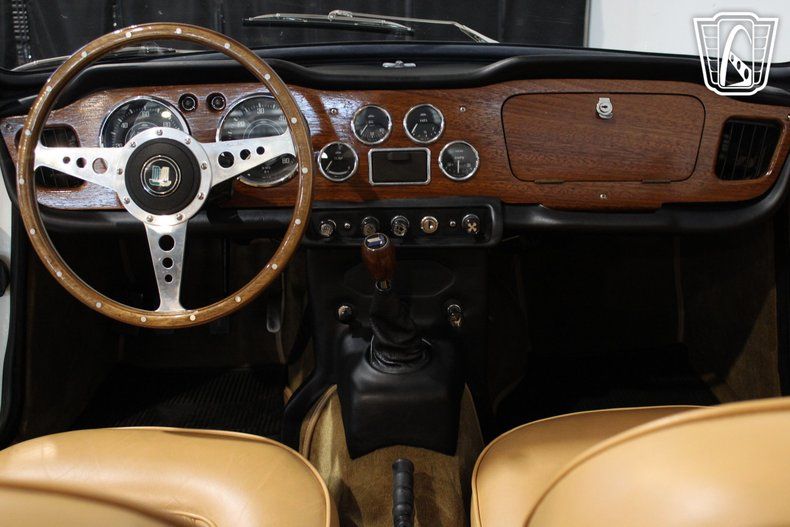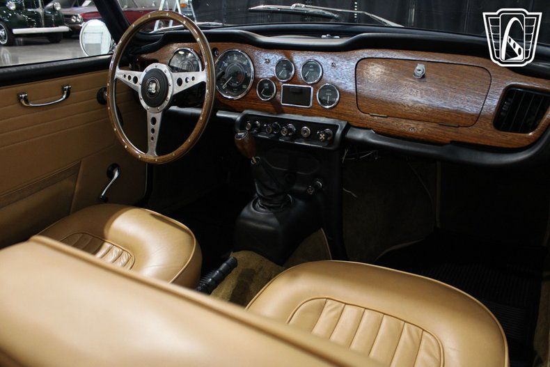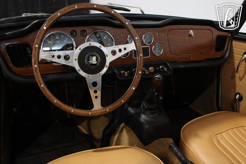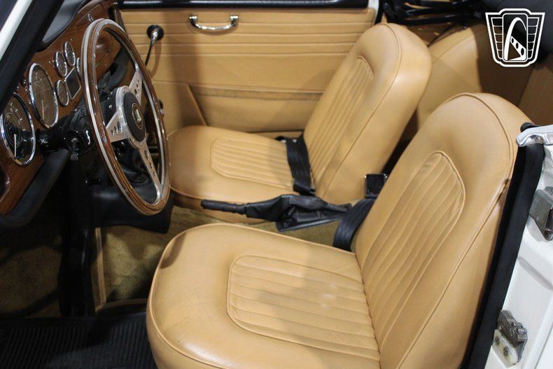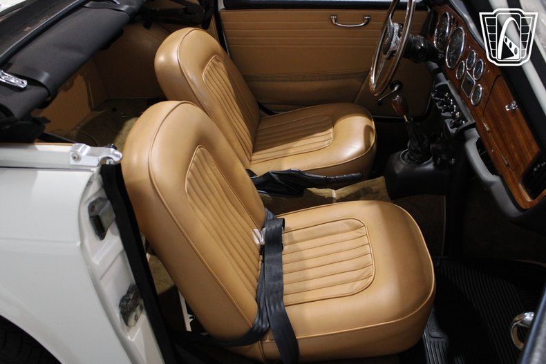 Inside, the camel leather interior provides a warm and inviting atmosphere, with thoughtful details that reflect the car's heritage. The AM radio offers a nostalgic touch, filling the cabin with the sounds of your favorite tunes as you take in the scenery. Seatbelts add an extra layer of security, while the simplicity of the dashboard and controls keeps the focus on the road ahead. Every detail has been designed to enhance the driving experience, making this Triumph a true companion for leisurely outings.