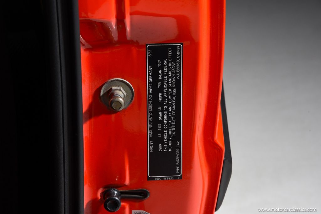 1982 AUDI COUPE GT for sale. Motorcar Classics is now selling this pristine 1982 Audi Coupe GT featured in Mars Red with Grey cloth interior. This car, with only 43,693 original miles, may be the most original and lowest mile Audi GT in existence. It is a true survivor that was purchased new by a woman in Wisconsin who drove it very little, and stored it in the winter. She owned the car until 2015 when the second owner acquired it from the woman. Everything on the car is factory original from the paint, to the interior, to the warning and identification stickers under the hood, in the trunk, and on the door jambs. The car is powered by Audis 2.1L, 100 HP, 5-cylinder engine with 5-speed gearbox and front wheel drive. The engine compartment and undercarriage are beautifully clean. The Coupe has a spacious interior making this a great family collectible car. Sensibly priced and an unrepeatable opportunity for the Audi enthusiast.
