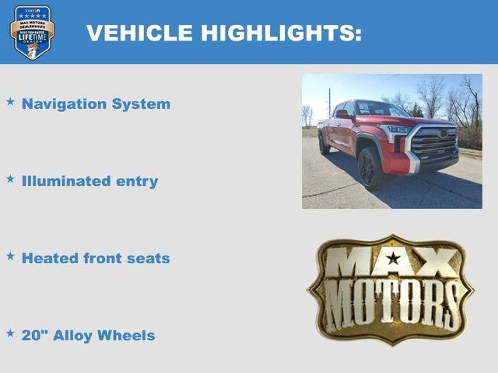 New Price! Certified. Supersonic Red 2023 Toyota Tundra Limited 4WD, Black w/Fabric Seat Trim or SofTex Seat Trim, 20 Alloy Wheels, Heated front seats, Illuminated entry, Navigation System. Certification Program Details: Type your description here At Max Motors, our mission is simple: to provide every customer with a honest, transparent, and rewarding automotive experience. For 19 years as a family-owned business, we build strong customer relationships that go beyond a sale. Buying a vehicle is significant, and we ensure the process is smooth and straightforward.